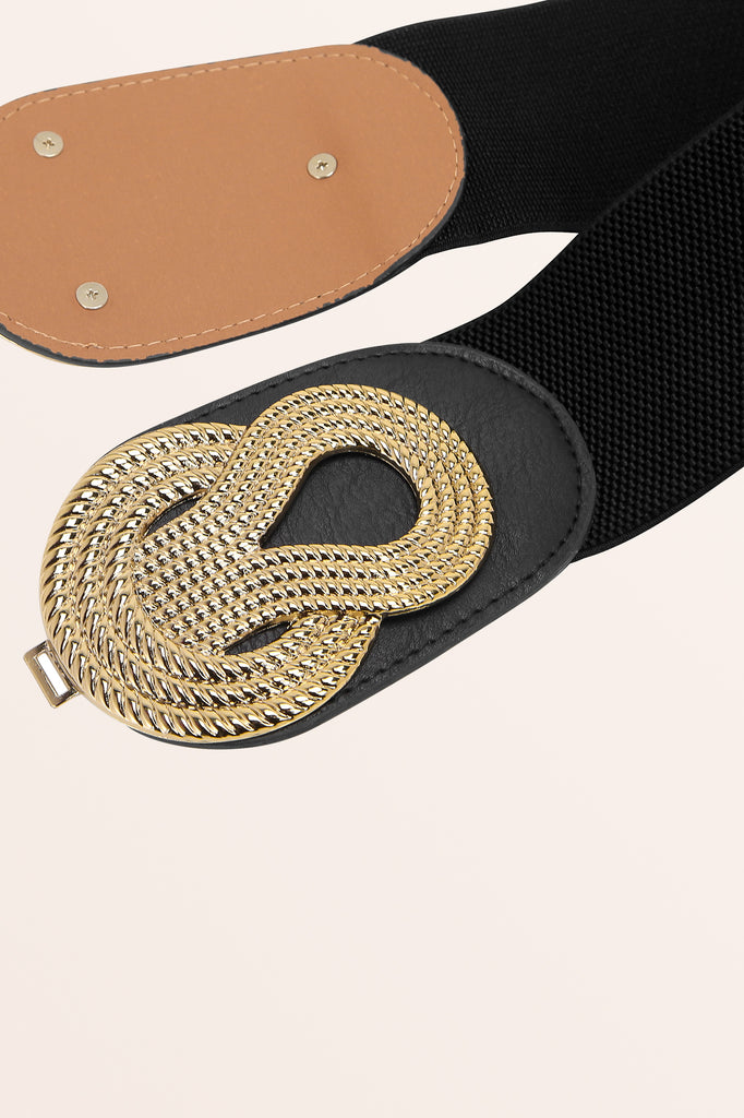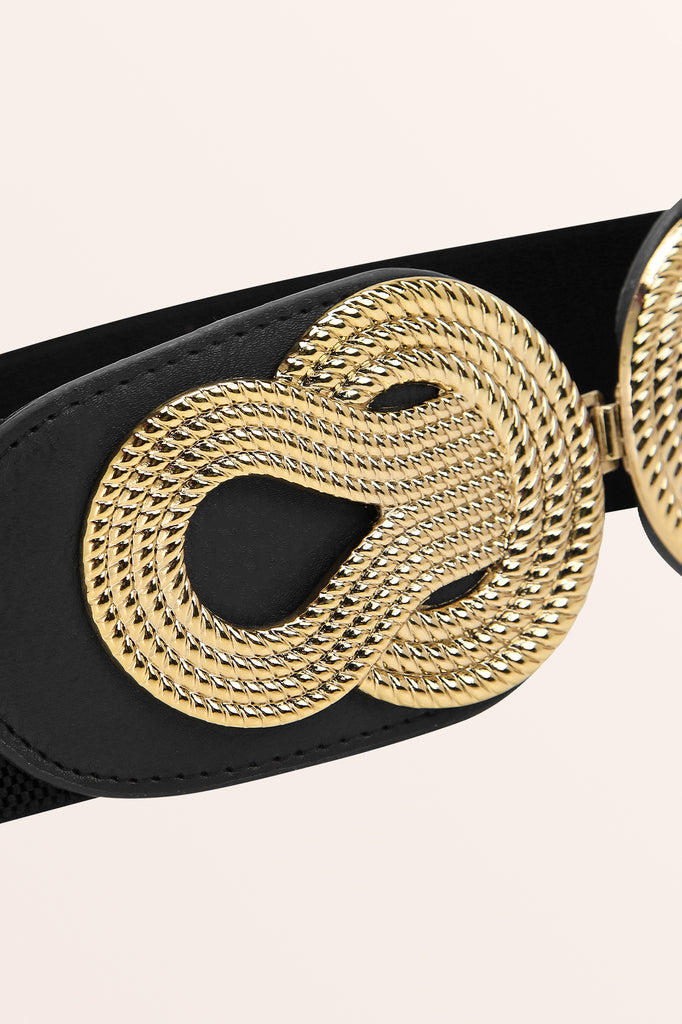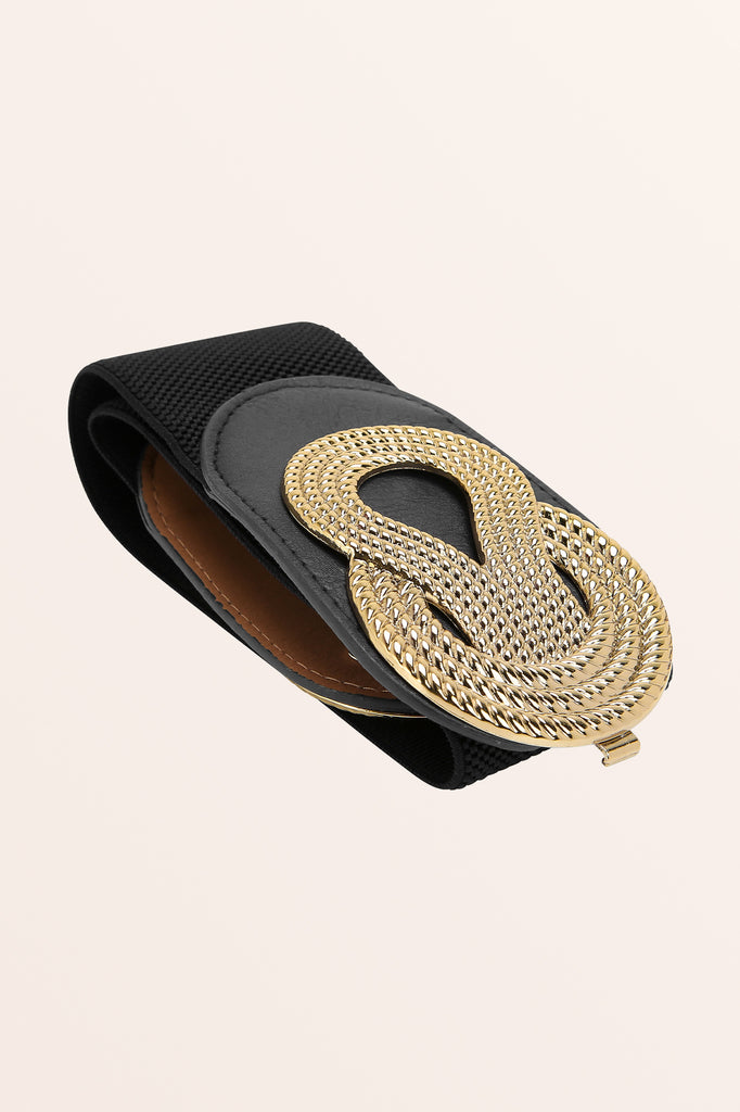 A 2.5 inch wide retro corset belt with a large decorative rope design hook fastening. As the material is stretchy elastic, it will adjust to many varied sizes. The belt is continuous elastic the whole way around.