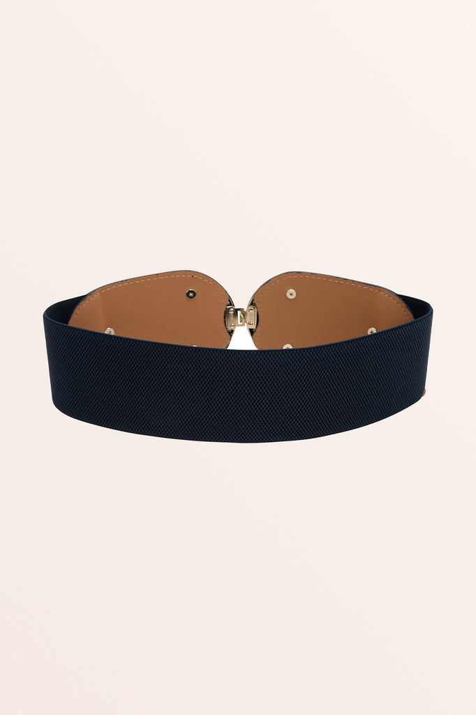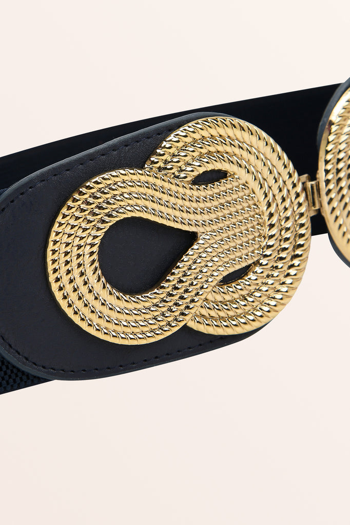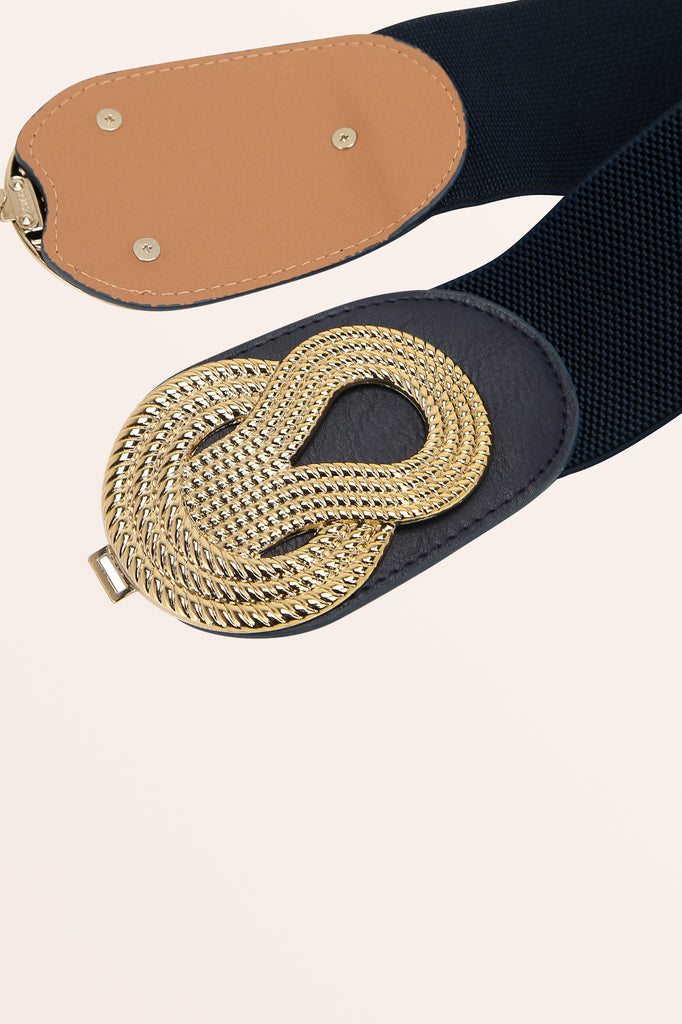 A 2.5 inch wide retro corset belt with a large decorative rope design hook fastening. As the material is stretchy elastic, it will adjust to many varied sizes. The belt is continuous elastic the whole way around.