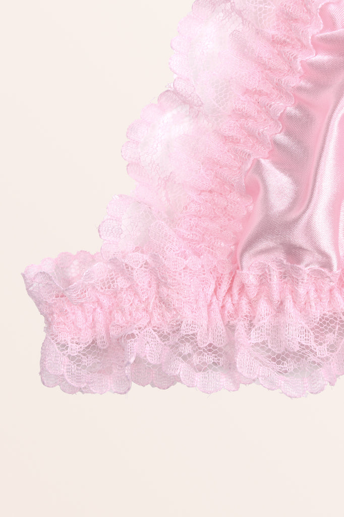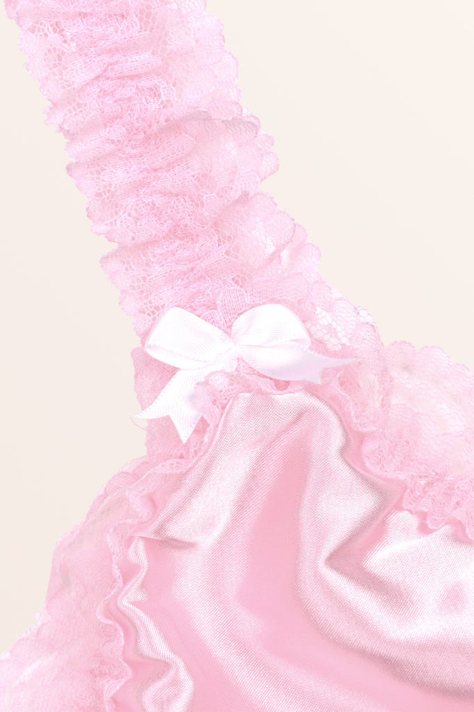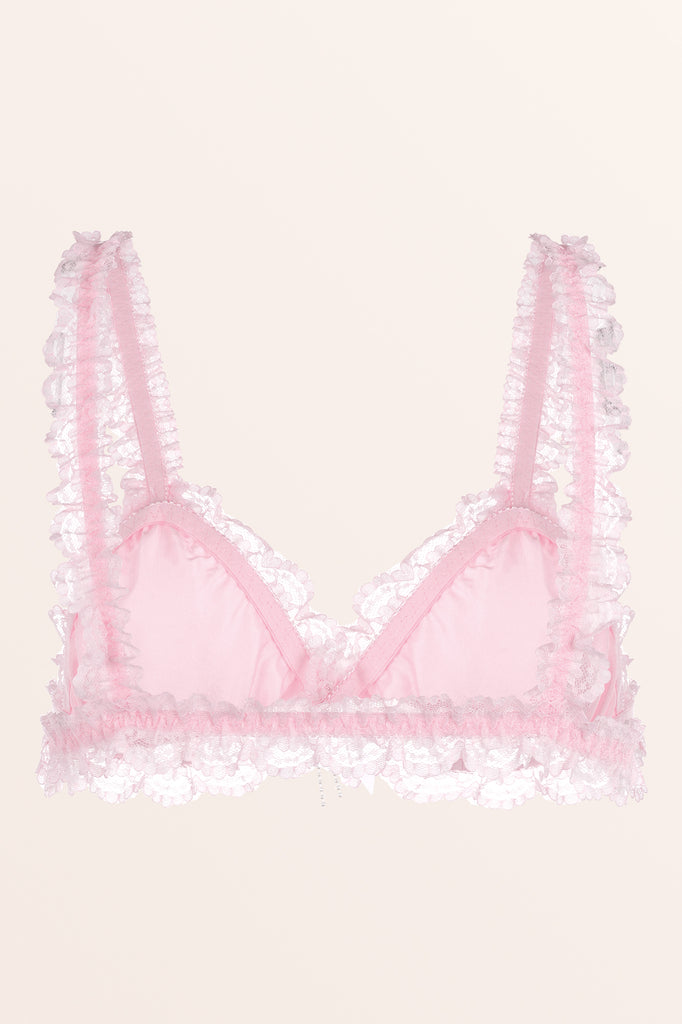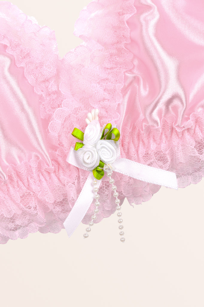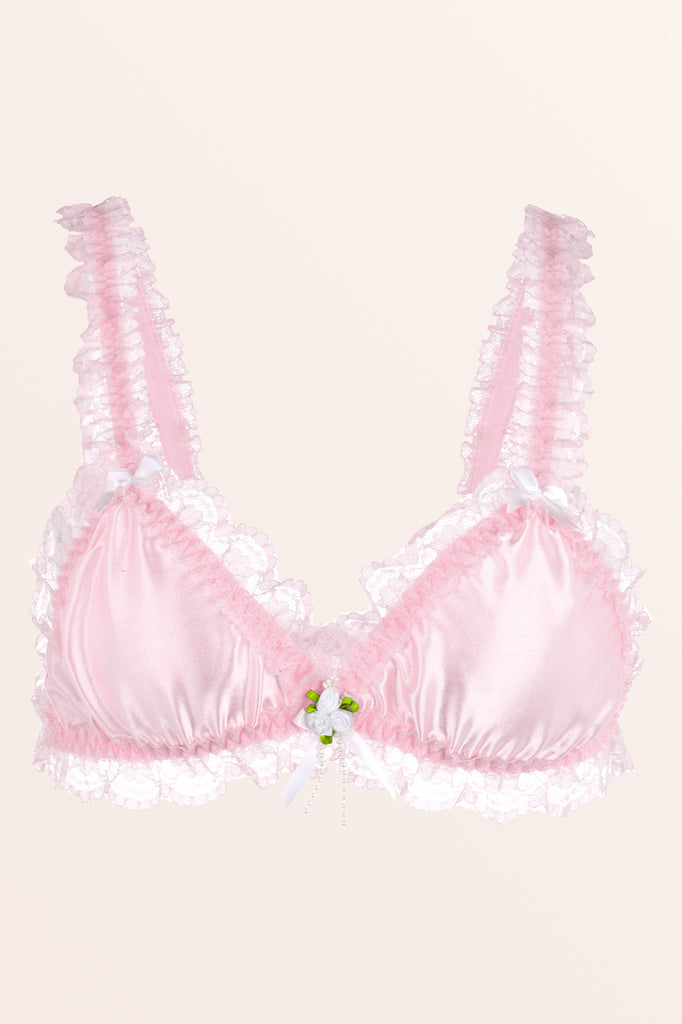 Embrace your femininity in this gorgeous bralette. Made with delicate satin fabric and elasticated straps for all day comfort, it features a trio of romantic roses and a string of faux pearls nestled in the cleavage, all accented with dainty shoulder bows and a ruffled trim. Luxuriate in the elegance.