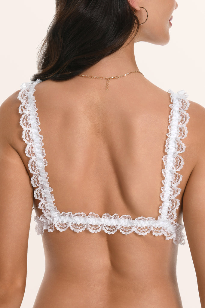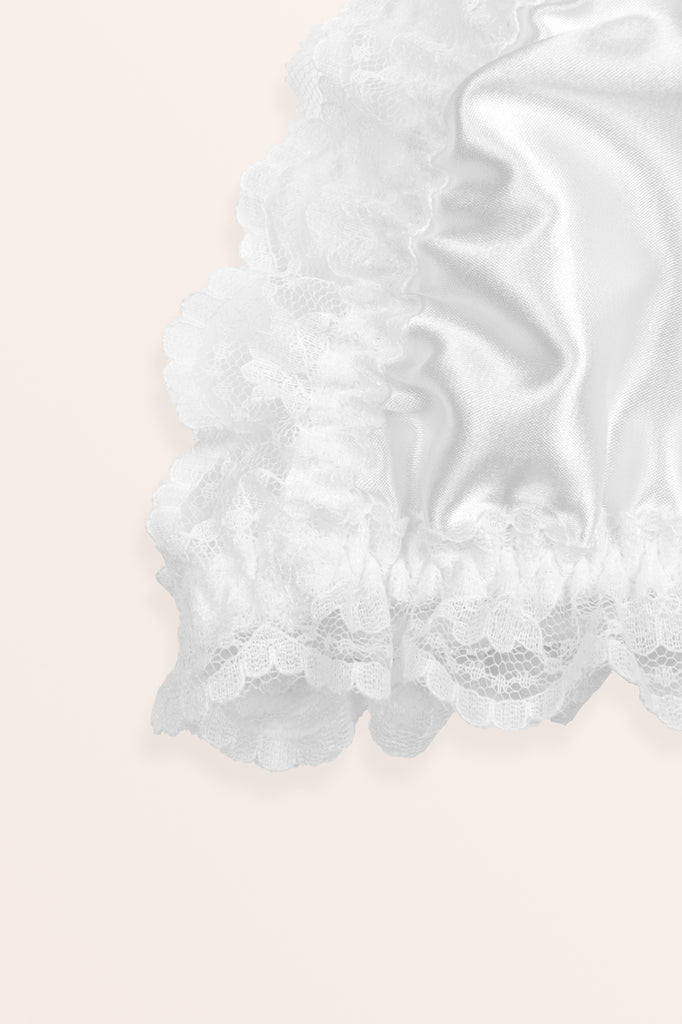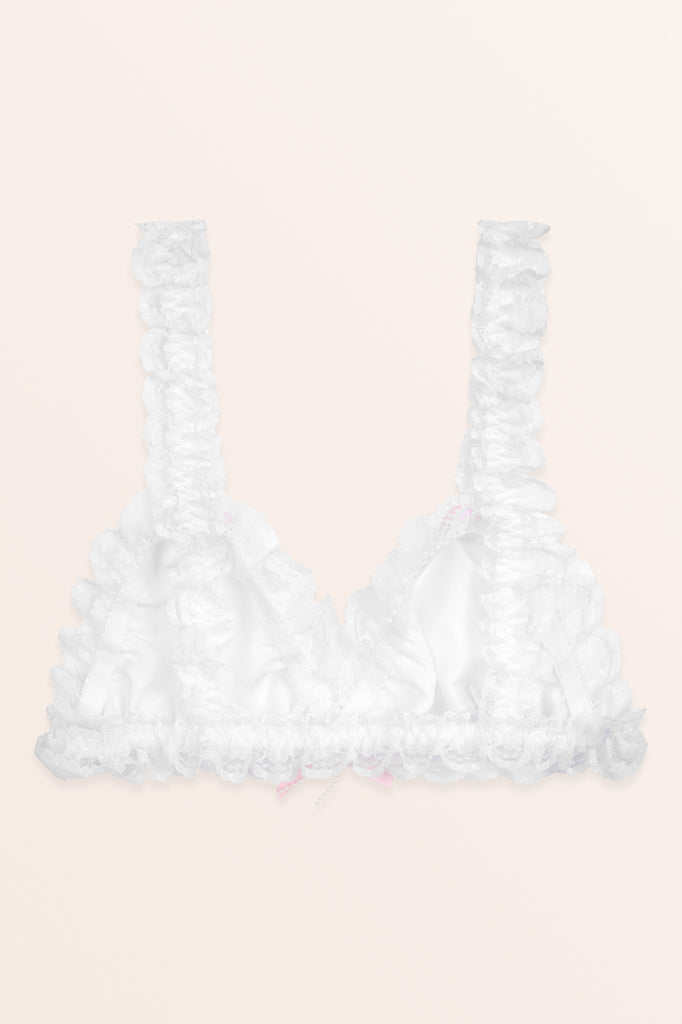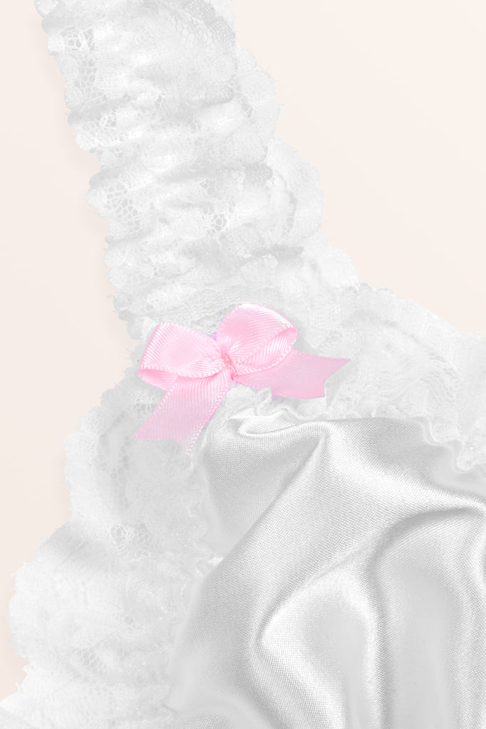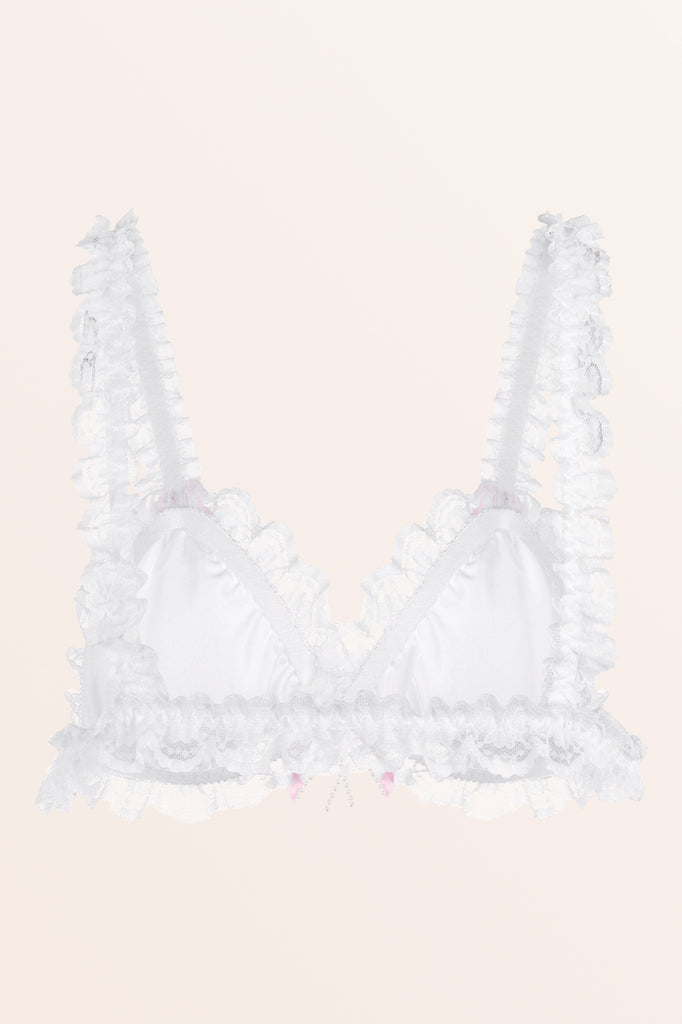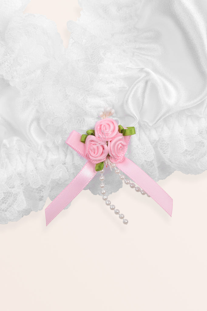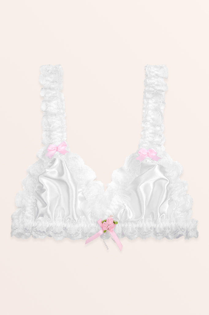 Embrace your femininity in this gorgeous bralette. Made with delicate satin fabric and elasticated straps for all day comfort, it features a trio of romantic roses and a string of faux pearls nestled in the cleavage, all accented with dainty shoulder bows and a ruffled trim. Luxuriate in the elegance.