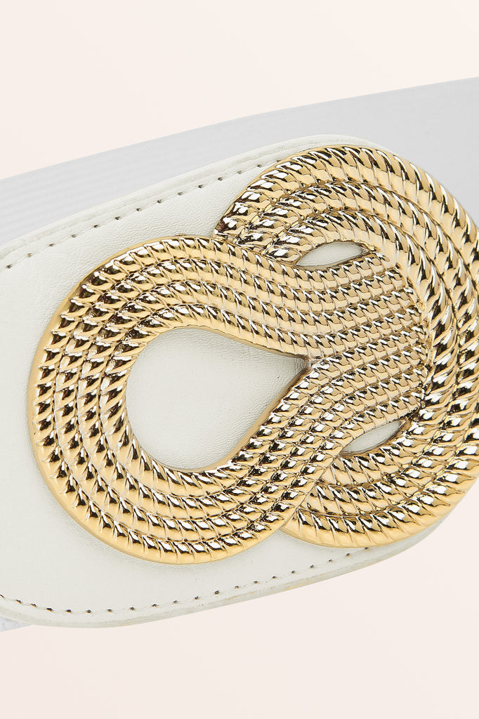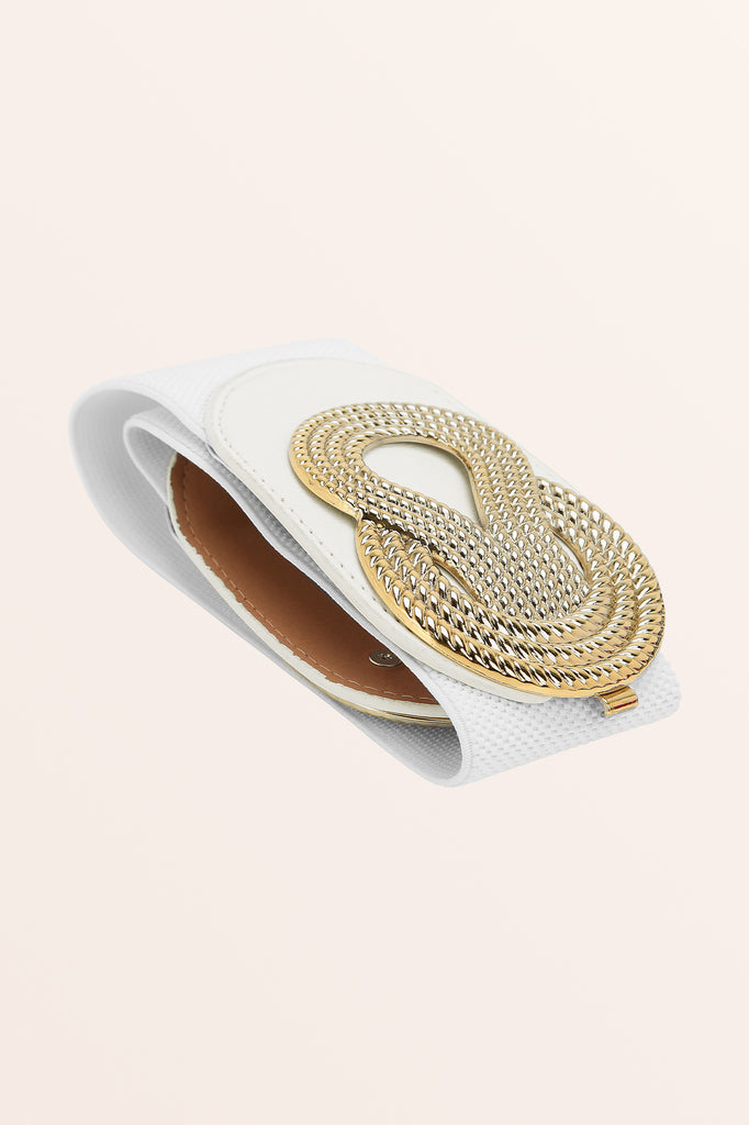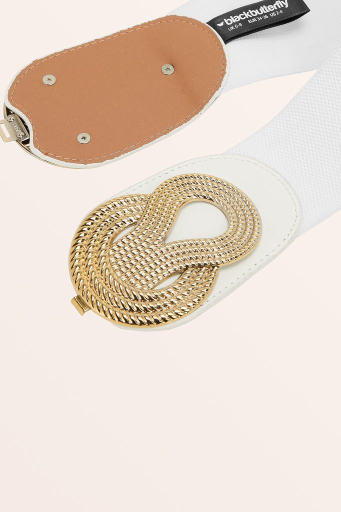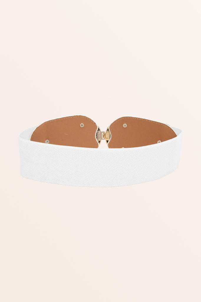 A 2.5 inch wide retro corset belt with a large decorative rope design hook fastening. As the material is stretchy elastic, it will adjust to many varied sizes. The belt is continuous elastic the whole way around.
