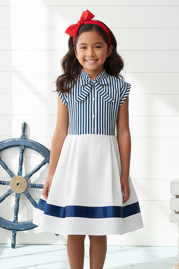 If you are looking for a smart and sophisticated yet beautiful dress for kids, look no further! Our Polly dress features a striped shirt-like top half with 3 gloss white buttons and an extended collar which can be tied into a bow. The bright white bottom half of the skirt is pleated at the waist giving it extra poise and is accentuated further with a gorgeous satin ribbon on the lower half. The Polly dress comes fully lined with a back zipper providing ease of wear and additional comfort. Perfect for all occasions especially those looking to provide an extra special oomph to their look.