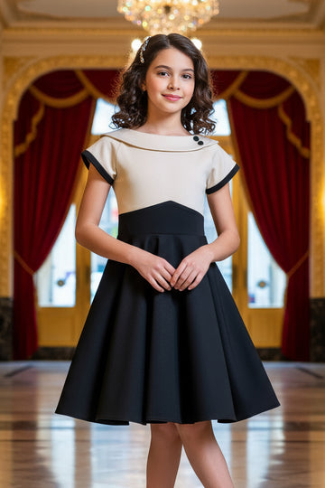 This striking two colour contrasting dress will provide girls with the most authentic vintage look. The dress features a flared full circle skirt and retro arrow waistline. This short-sleeved piece is finished with a folded boat neck collar with two decorative buttons near the shoulder accentuating the dress in all the right places. Perfect for all occasions especially those looking to provide an extra special oomph to their look. The Valerie dress comes fully lined and with a back zipper providing ease of wear and additional comfort.
