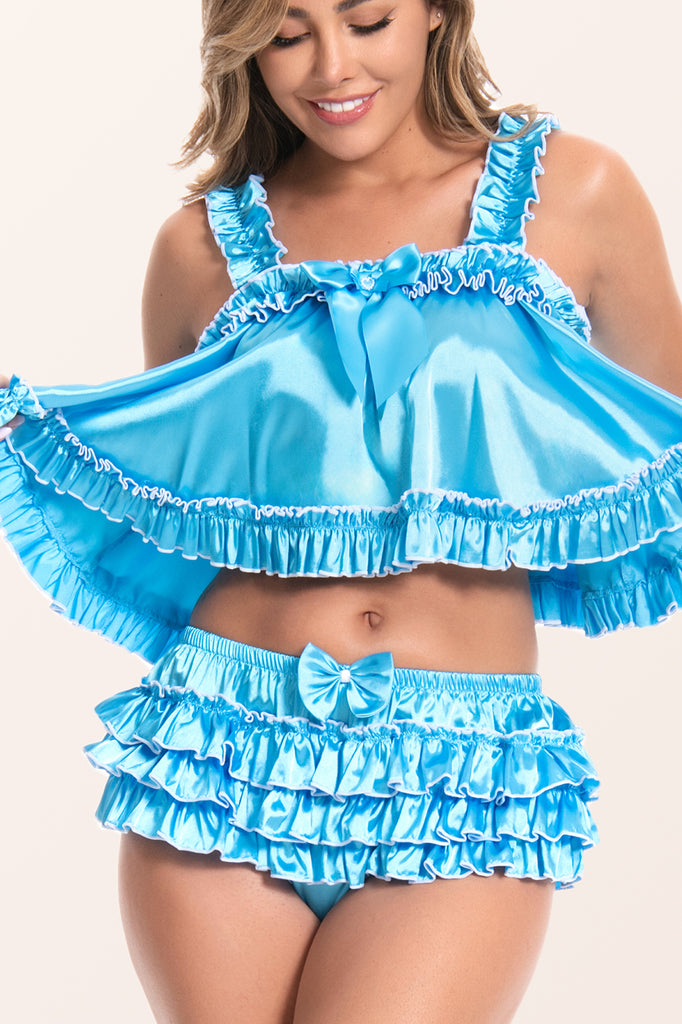 Made from silky soft satin, this top catches the light beautifully, adding a lustrous sheen to your look. Designed with elasticated shoulder straps and overbust for a secure and flattering fit, it suits various body types. Elegantly rolled ruffled edges along the neckline, straps, and hem add playful femininity and texture. Perfect for crossdressing, sissy play, pride, cosplay, or just for fun, this versatile cami top invites everyone to embrace their style and feel sexy.