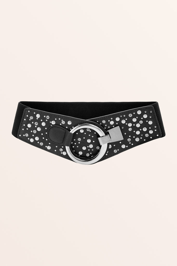 A wide retro style corset belt with a large decorative metallic hook fastening which can be adjusted to angle the belt in different positions! As the rear of the belt is stretchy elastic, it will adjust to a variety of sizes.