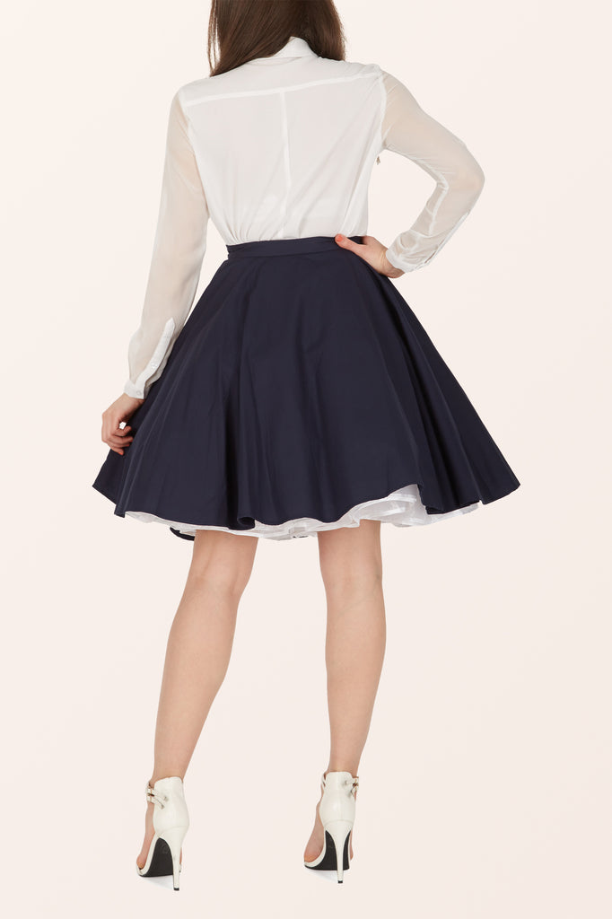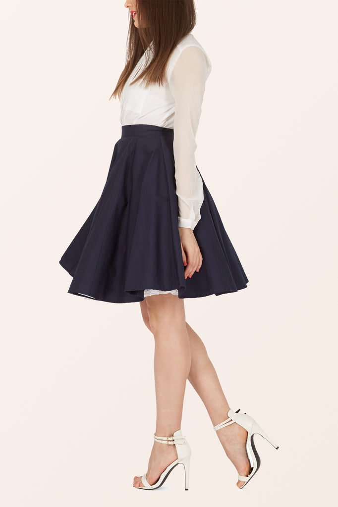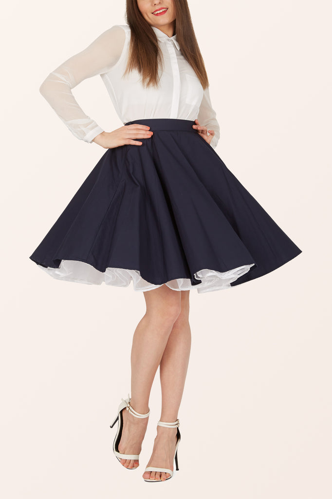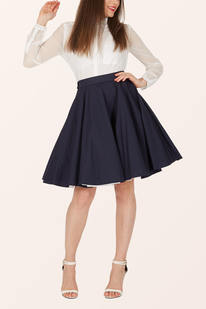 This rockabilly swing skirt was directly inspired by vintage patterns from the 1950's. This full circle flared skirt features a side button fastening, discrete zipper and is fully lined on the inside without compromising the look. This 50's skirt provides you with the perfect asset to to complete the retro look.