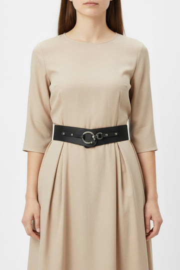 A wide retro corset belt with a large decorative metallic hook fastening which can be adjusted to angle the belt in different positions! As the rear of the belt is stretchy elastic, it will adjust to a variety of sizes.