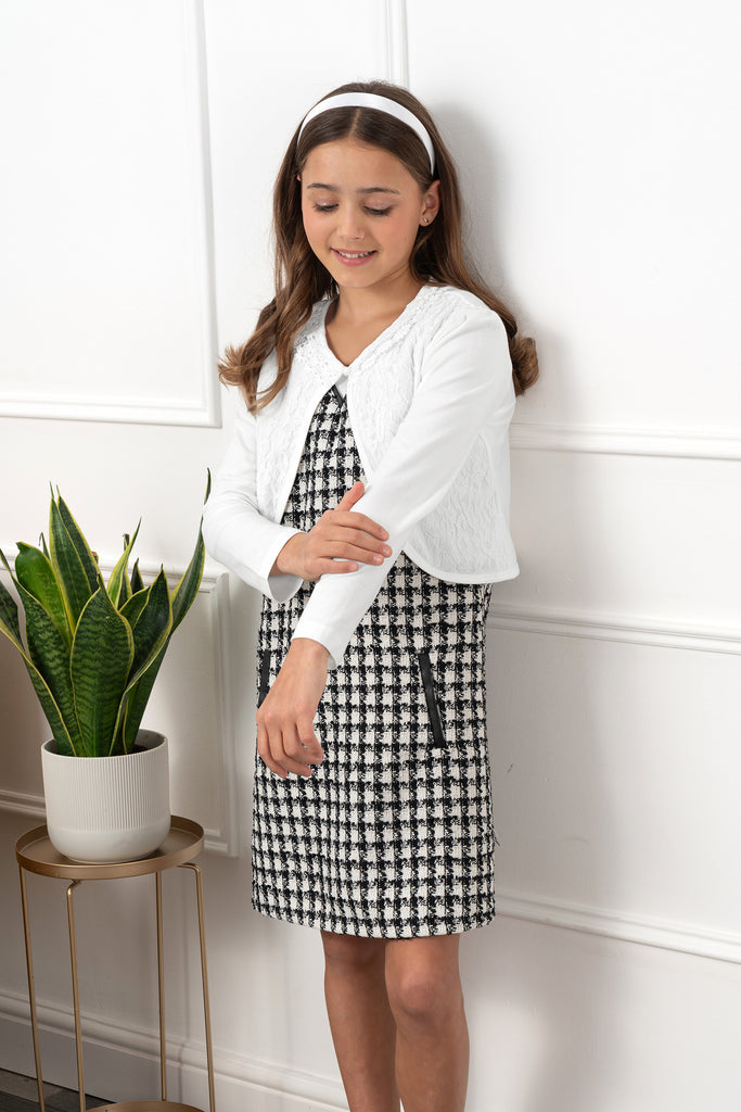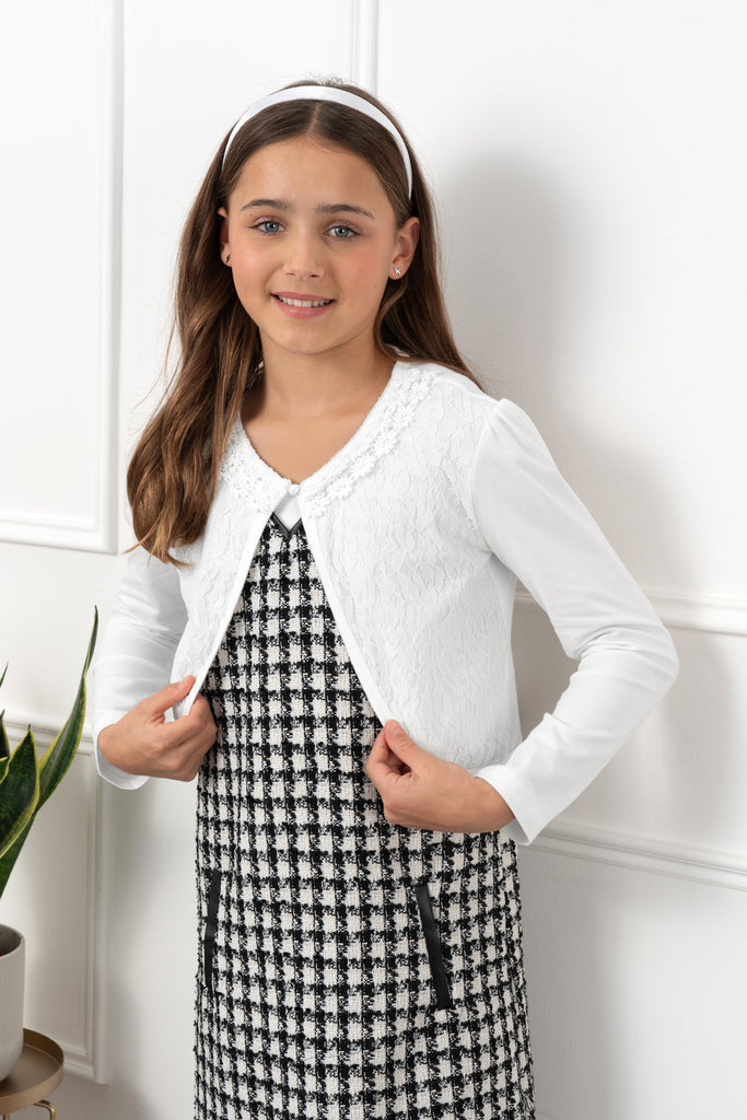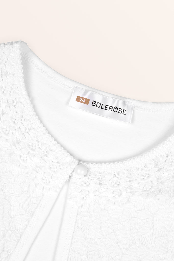This cute little throw-over cardigan features an intricate floral lace design with a small button to complete the neckline. Made from soft cotton, this little bolero will be sure to add that little bit of extra flare to any vintage look. Perfect for bridesmaids at weddings, parties, and special evenings! Go ahead and complete the look with this lovely girls’ jacket!