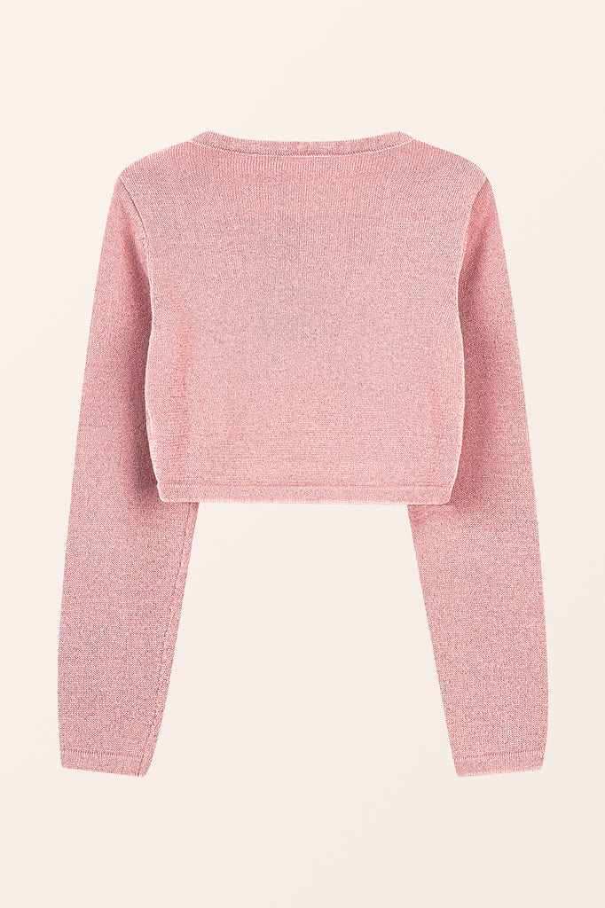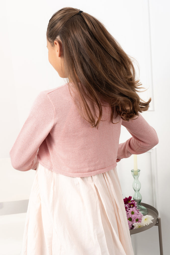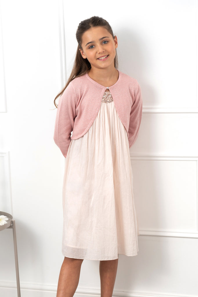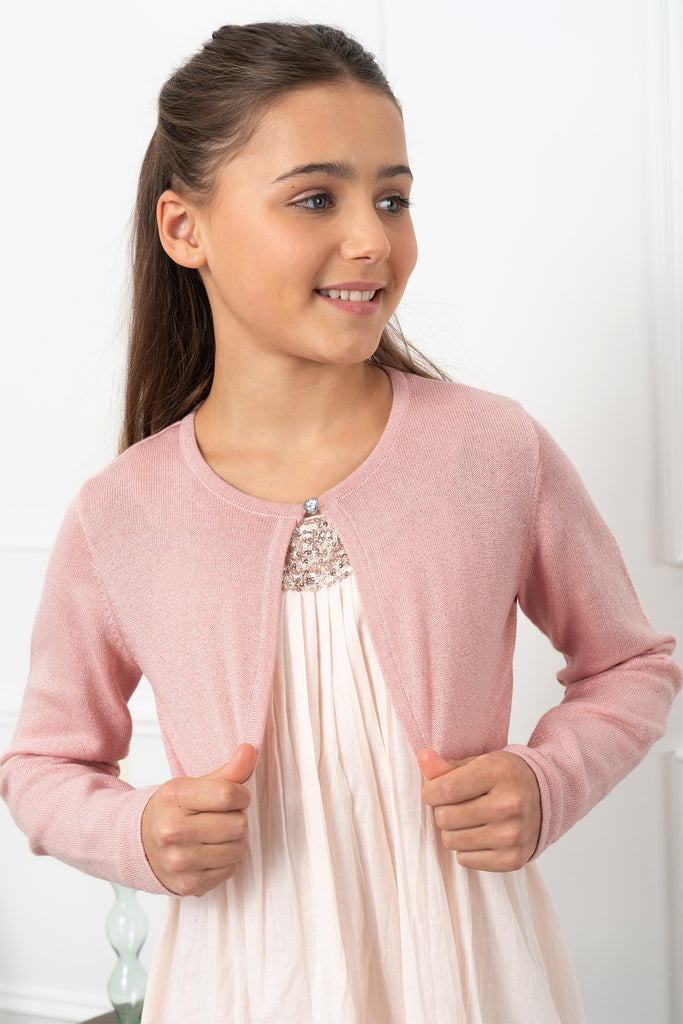 Add a little sparkle to their outfit with this stunning long sleeve bolero. The material of this shrug is intertwined with a beautiful yet subtle glittery thread making it feel that extra bit special. The bolero is also finished with a cute diamante heart-shaped button fastening at the neckline. Perfect for all types of occasions including bridesmaids at weddings, parties, and special evenings!