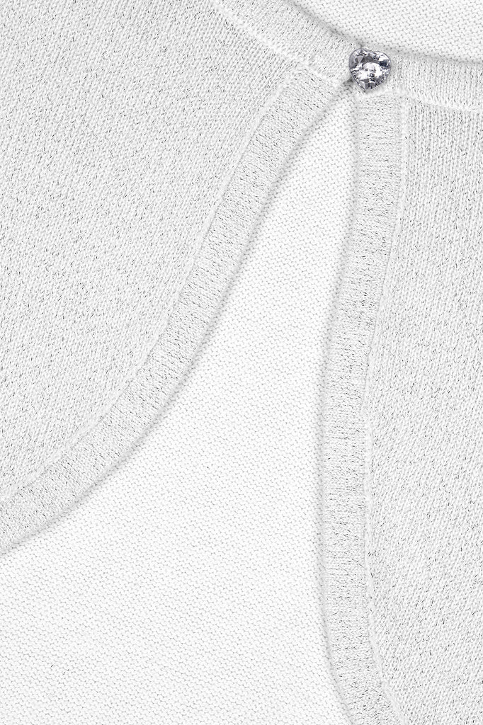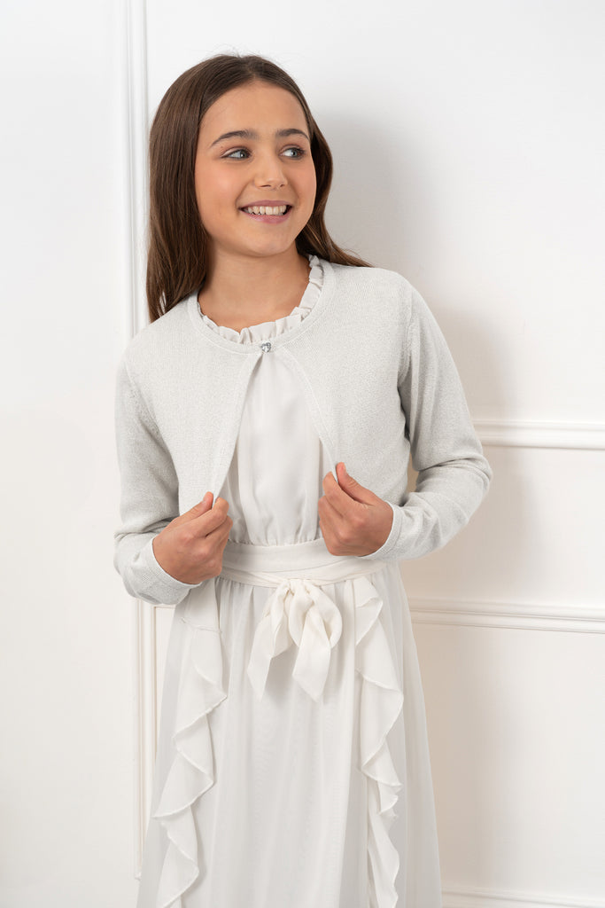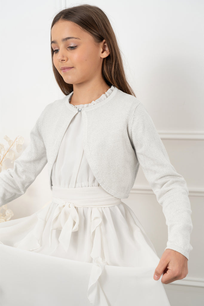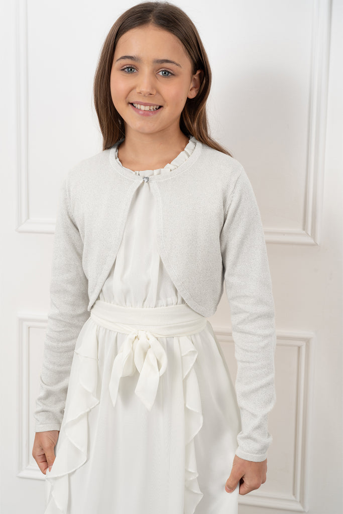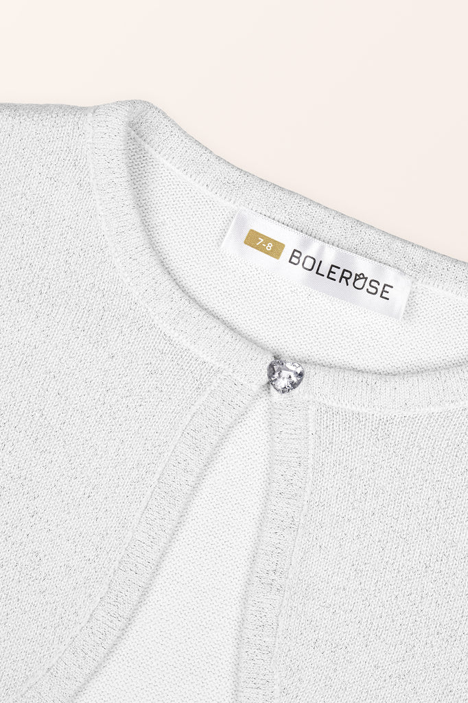 Add a little sparkle to their outfit with this stunning long sleeve bolero. The material of this shrug is intertwined with a beautiful yet subtle glittery thread making it feel that extra bit special. The bolero is also finished with a cute diamante heart-shaped button fastening at the neckline. Perfect for all types of occasions including bridesmaids at weddings, parties, and special evenings!
