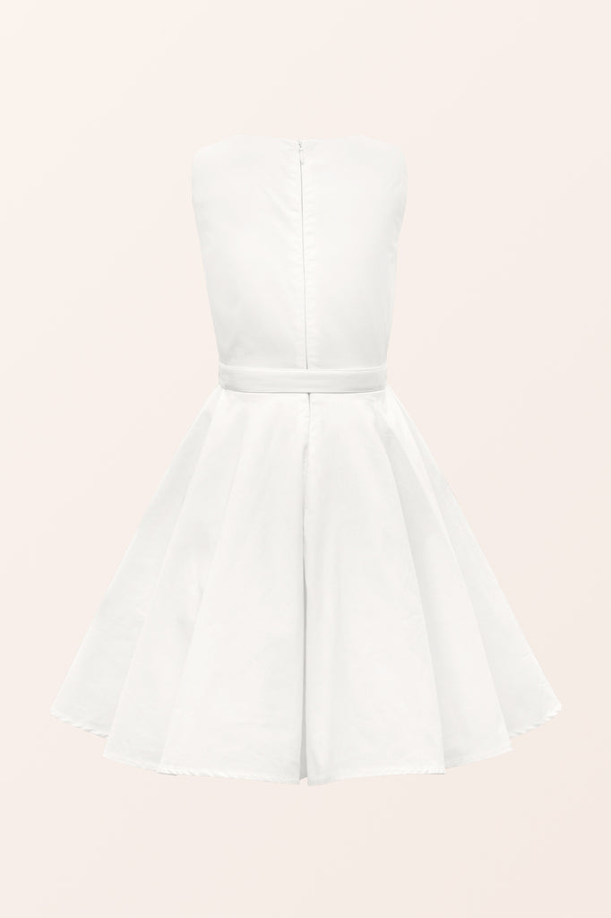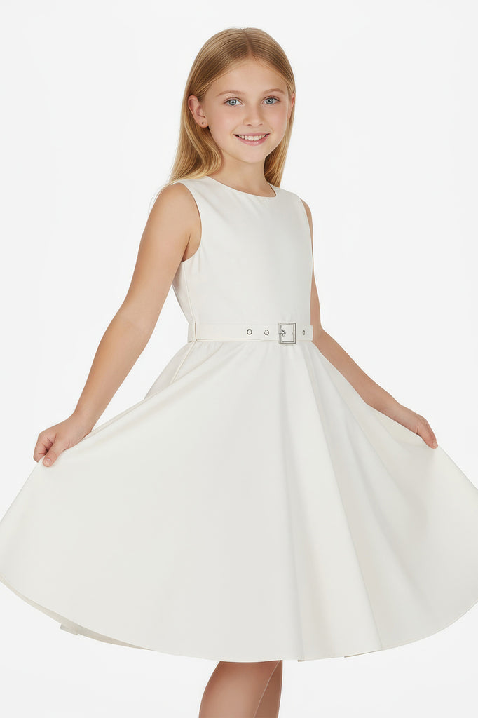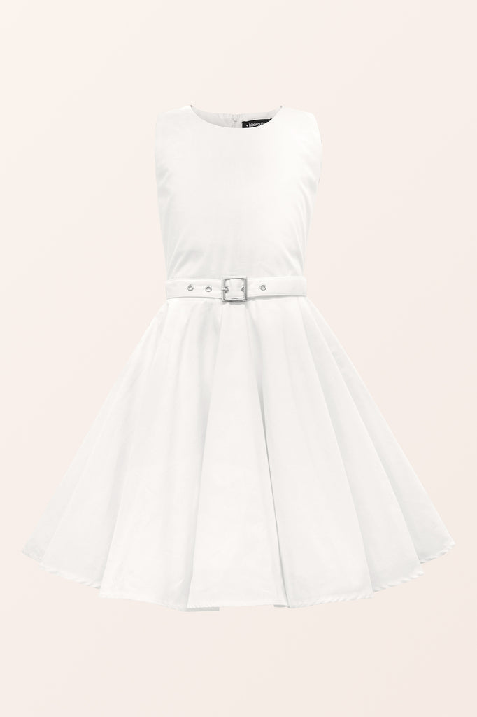 This popular Audrey Hepburn inspired dress is now available for girls! Following it's older sister, the dress features a full circle flared skirt, back zipper and a matching waist belt for an authentic 1950's vintage look. In addition, the inside of this garment is fully lined giving that extra comfort without compromising the look.su