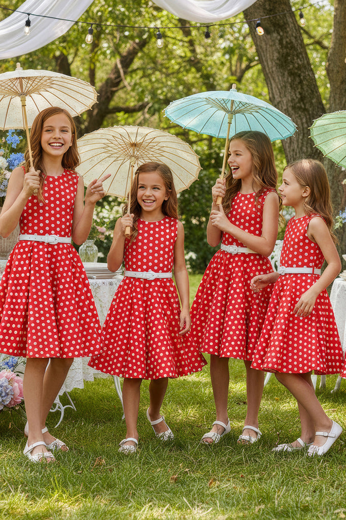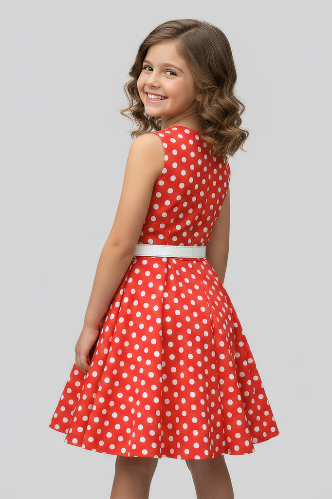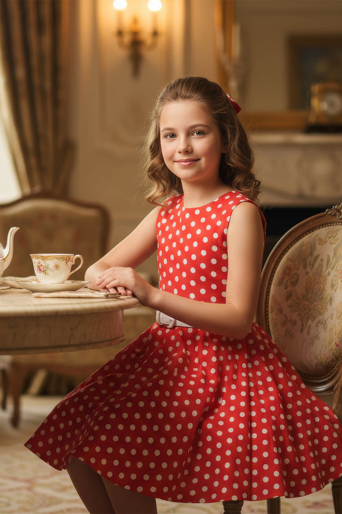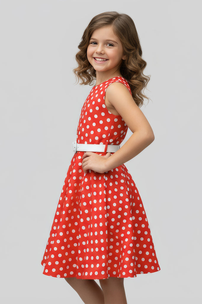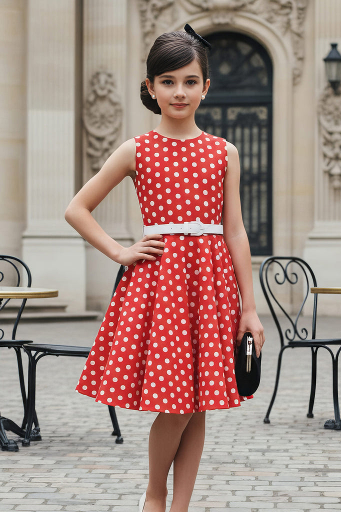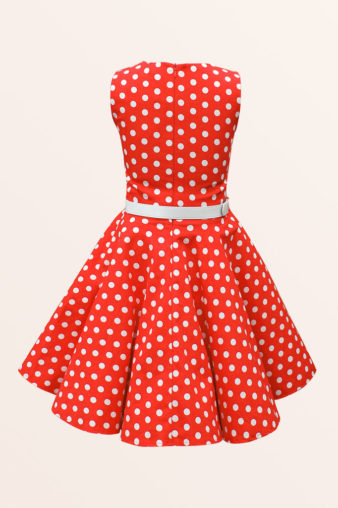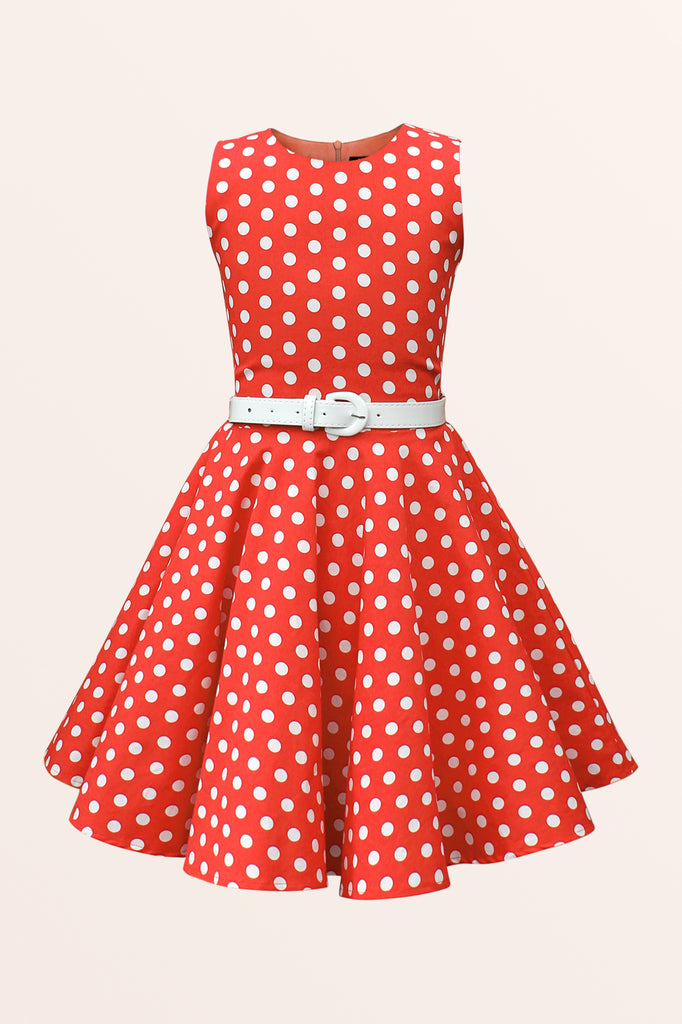 This popular Audrey Hepburn inspired dress is now available for girls! The dress features a full circle flared skirt, back zipper and a striking white waist belt for an authentic 1950's vintage look. In addition, the inside of this garment is fully lined giving you that extra comfort without compromising the look for your kids!