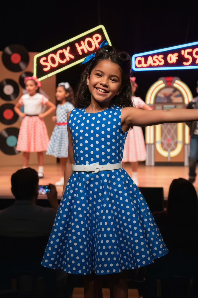 This popular Audrey Hepburn inspired dress is now available for girls! The dress features a full circle flared skirt, back zipper and a striking white waist belt for an authentic 1950's vintage look. In addition, the inside of this garment is fully lined giving you that extra comfort without compromising the look for your kids!