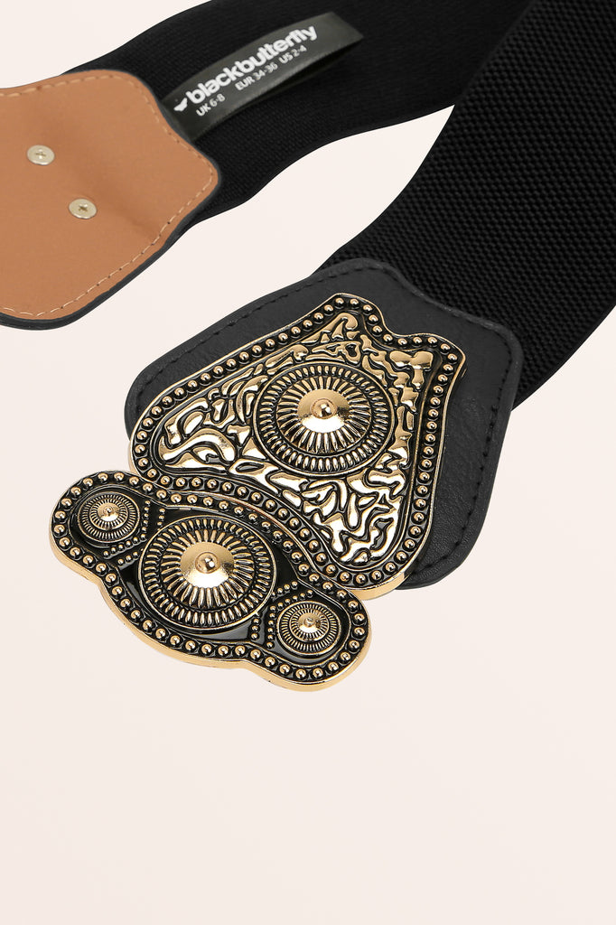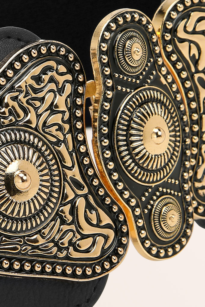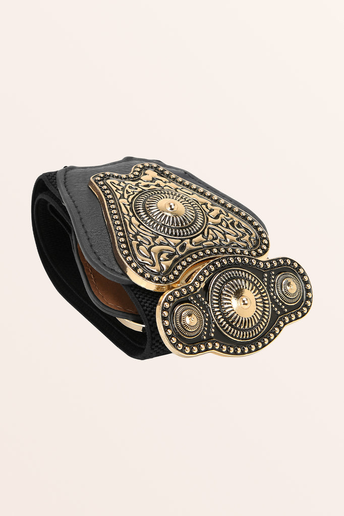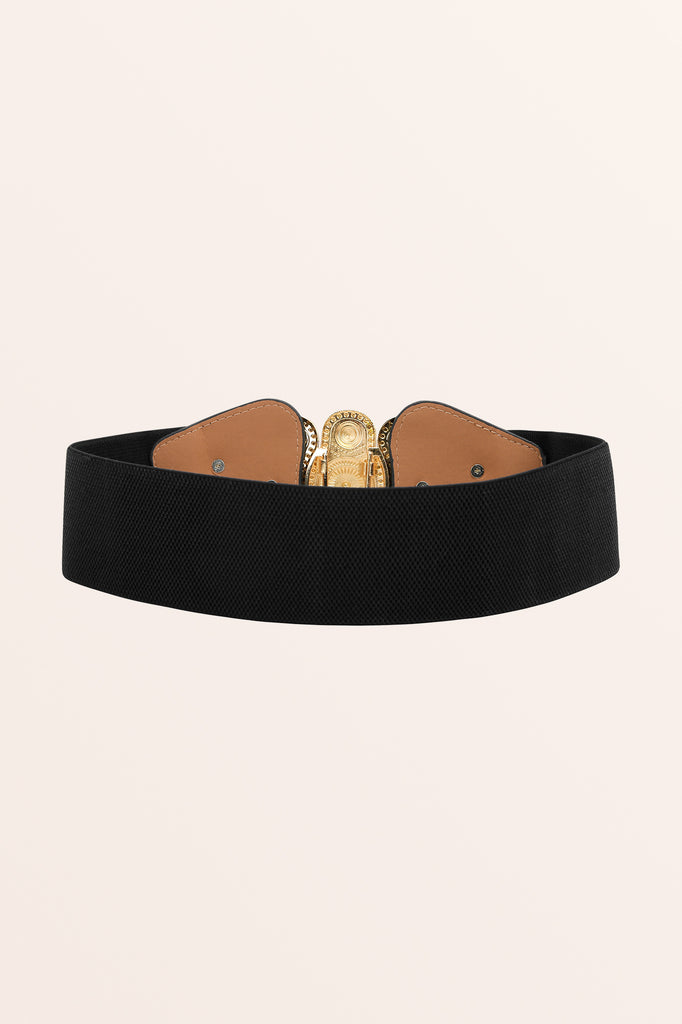 A wide retro corset belt with a large rustic feel, interlocking clasp! As the majority of the belt is stretchy elastic, it will adjust to a variety of sizes.