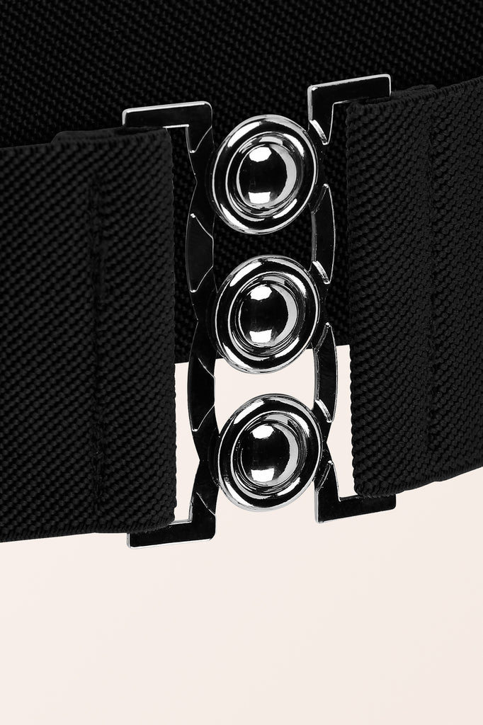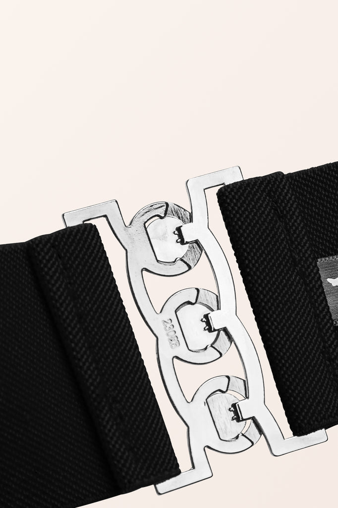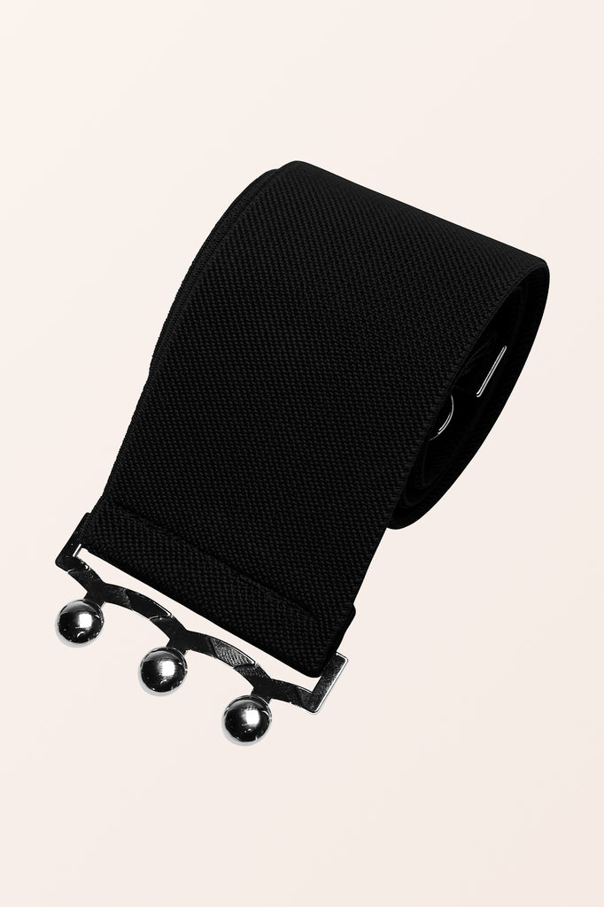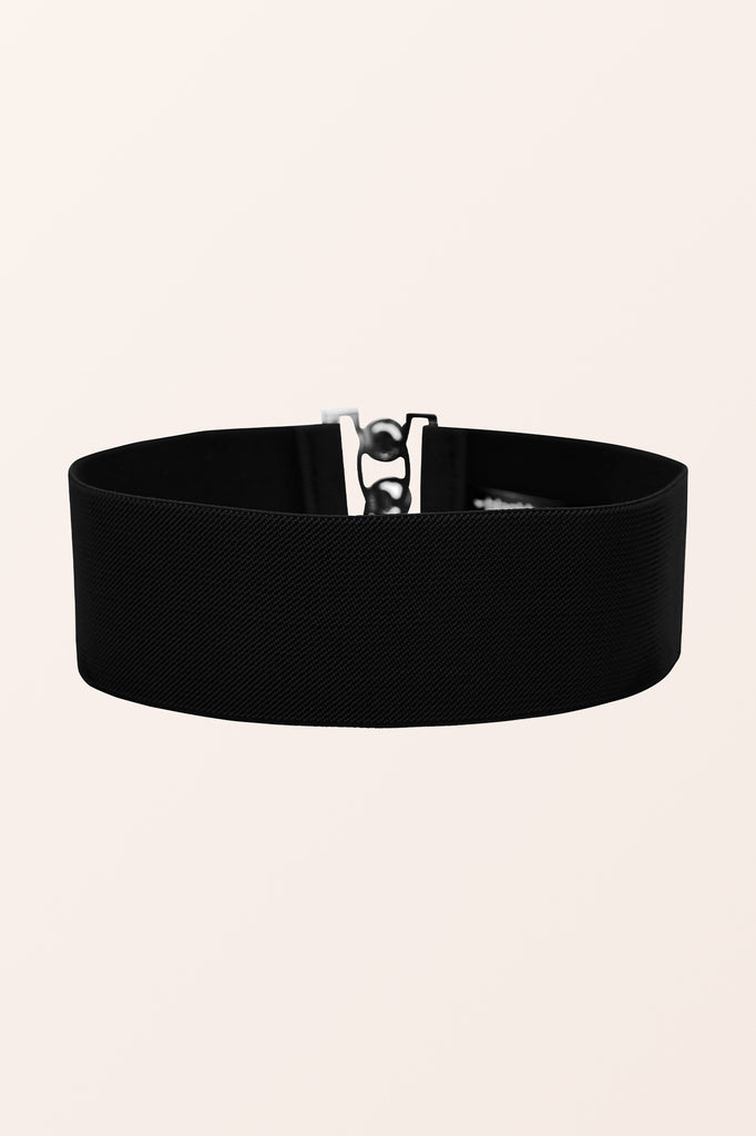 A 2.5 inch wide retro waist belt with a durable interlocking buckle. As the material is stretchy elastic, it will adjust to many varied sizes. The belt is continuous elastic the whole way around.