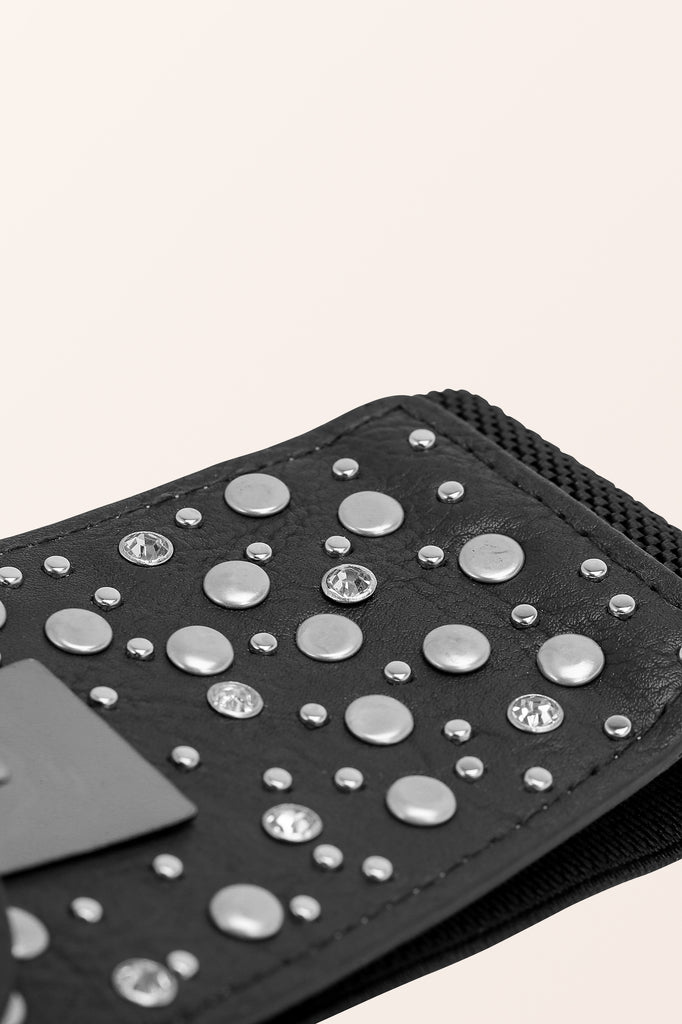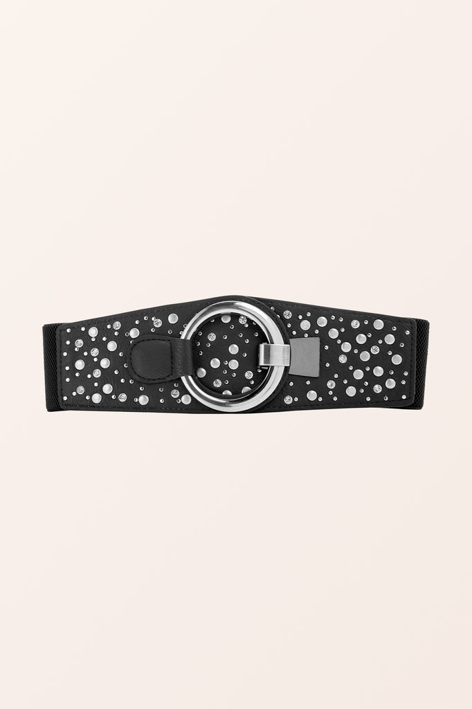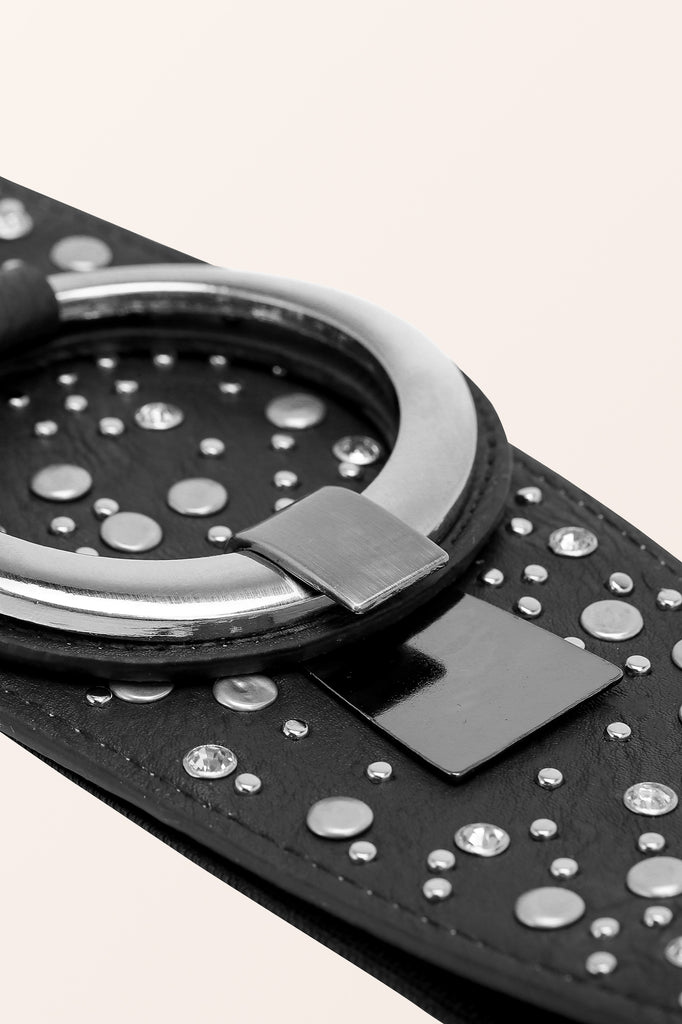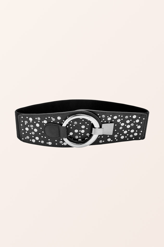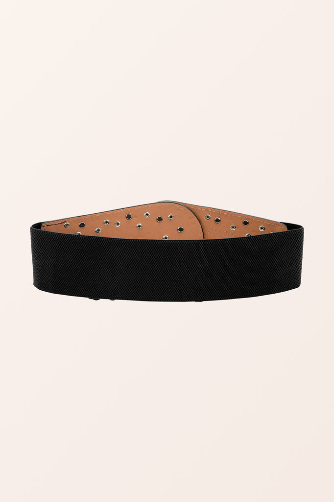 A wide retro style corset belt with a large decorative metallic hook fastening which can be adjusted to angle the belt in different positions! As the rear of the belt is stretchy elastic, it will adjust to a variety of sizes.