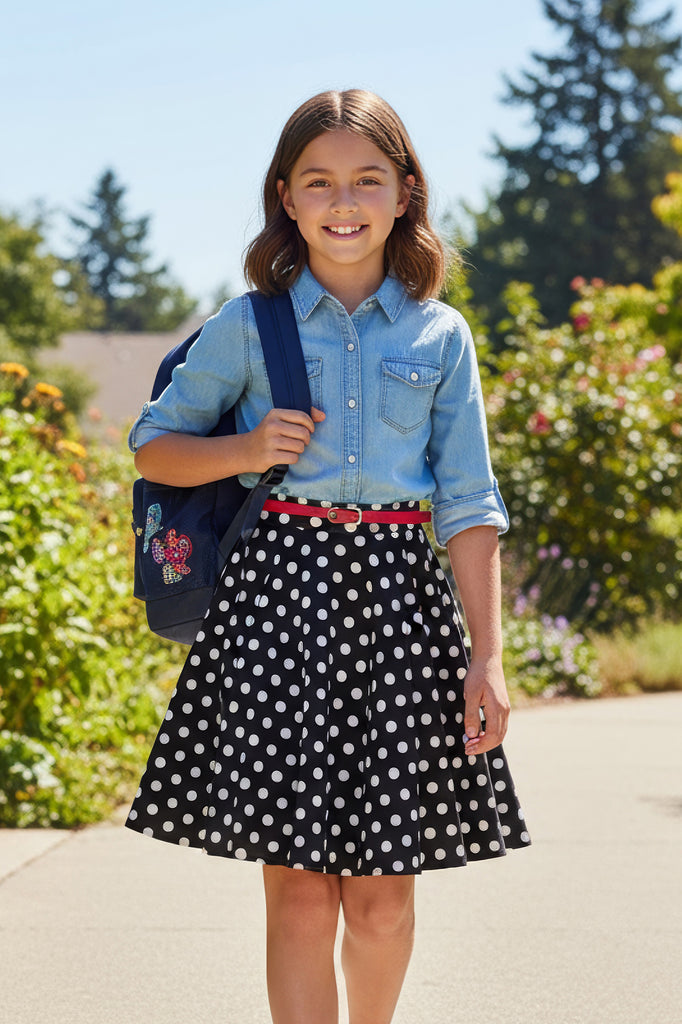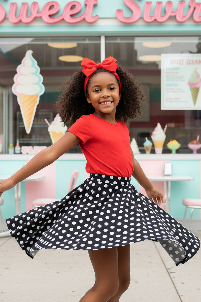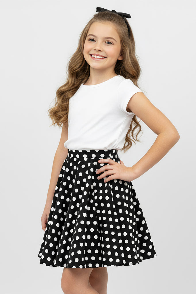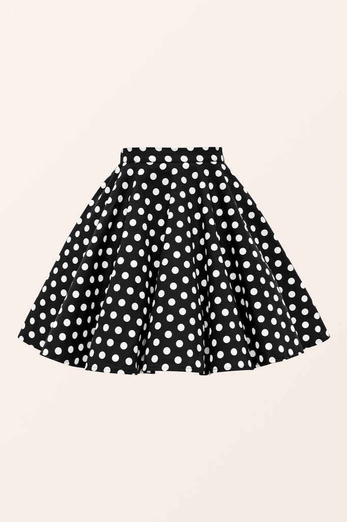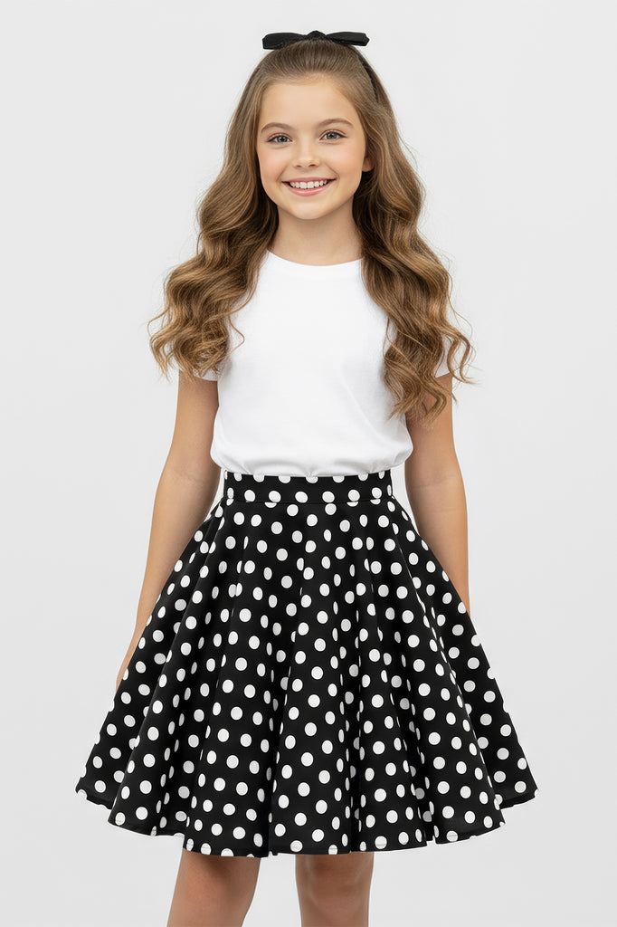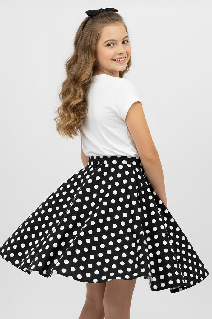 This rockabilly swing skirt was directly inspired by vintage looks from the 1950's and is now available for kids! This full circle flared skirt features a back zipper with a press button fastening. In addition, the skirt also includes an elasticated panel at the sides of the waist for a perfect fit and is fully lined on the inside for extra comfort. This 50's skirt provides you with the perfect asset to to complete the retro look.