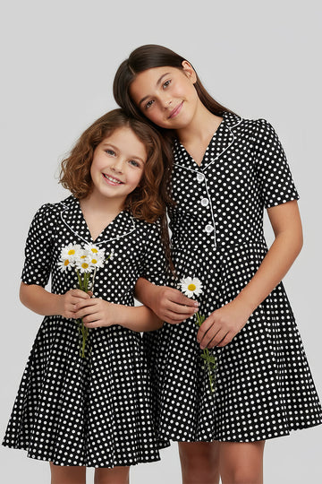 This beautiful vintage polka dot inspired dress is now available for young ladies! The dress features a collared neckline with a buttoned front and a full circle flared skirt. The dress has a side zipper and short turned sleeves for an authentic 1950's vintage look. In addition, the inside of this garment is fully lined giving you that extra comfort without compromising the look.