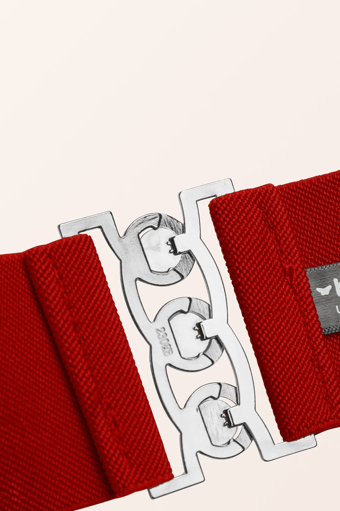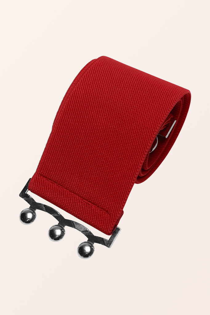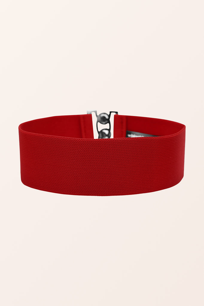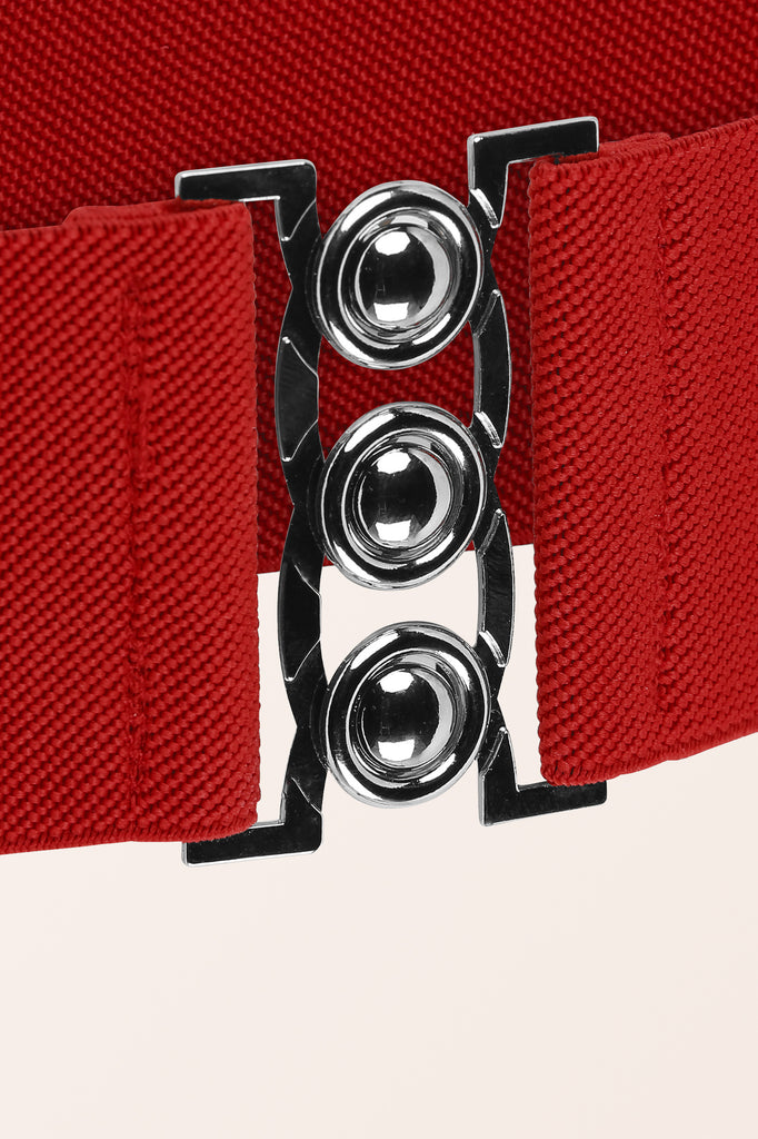 A 2.5 inch wide retro waist belt with a durable interlocking buckle. As the material is stretchy elastic, it will adjust to many varied sizes. The belt is continuous elastic the whole way around.