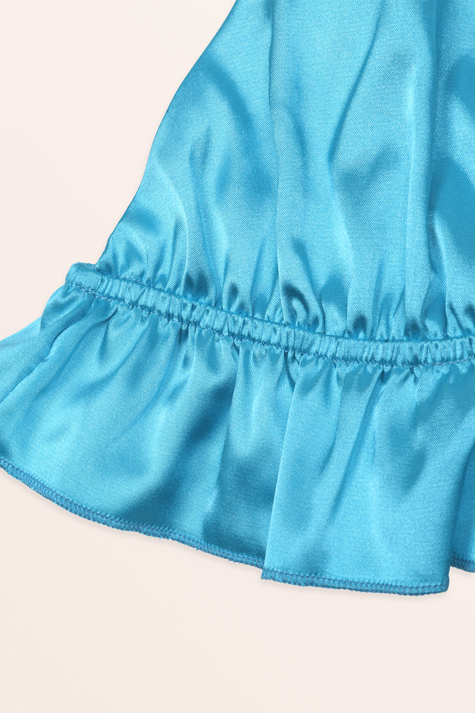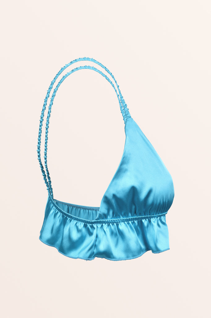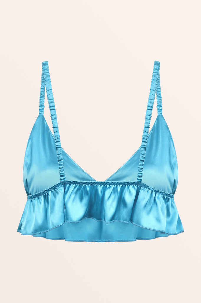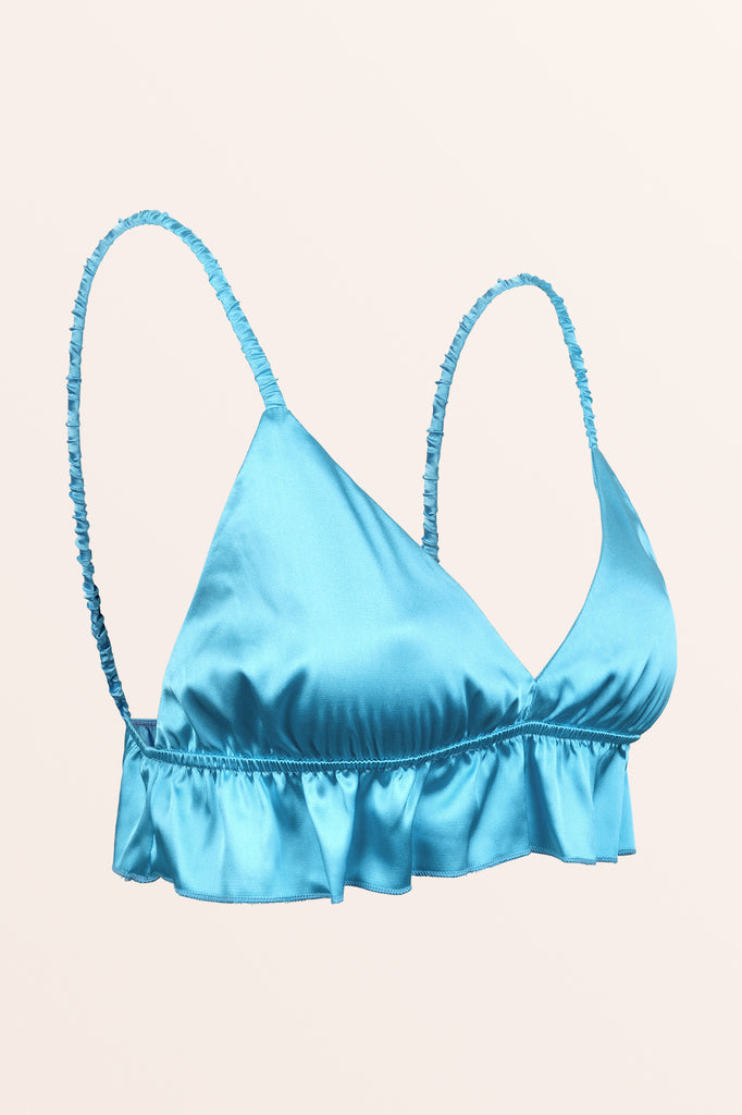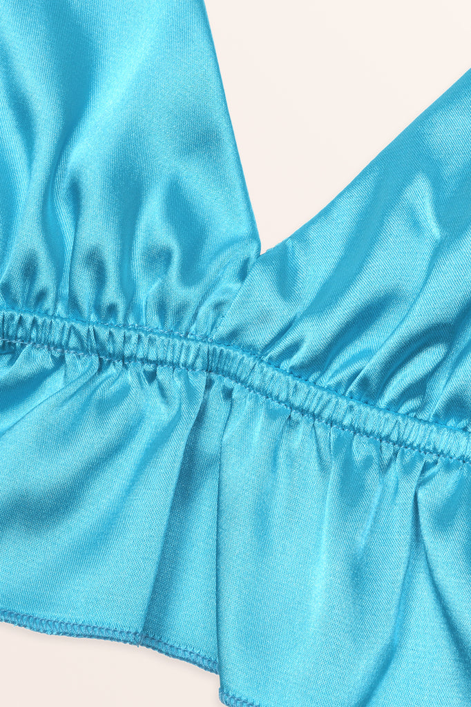This bralette features a luxurious satin finish with elasticated straps and a ruffled hemline. Its deep V-neck design adds allure and sophistication, while the elasticated spaghetti straps ensure comfort and flexibility without compromising style.