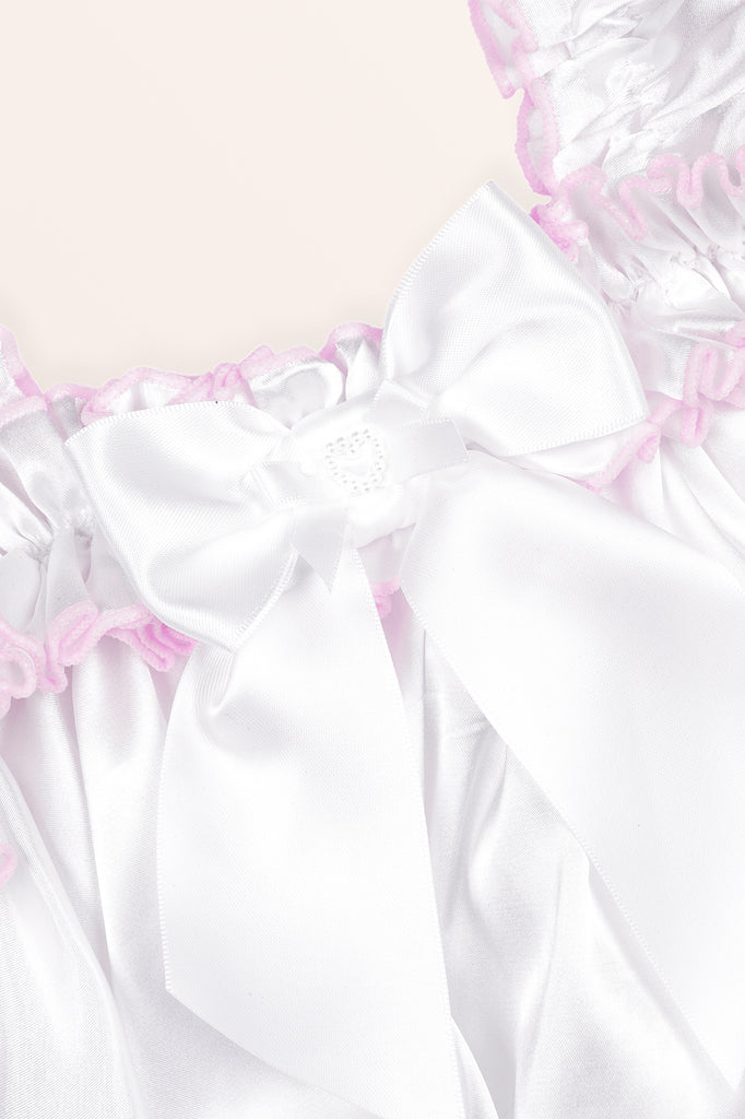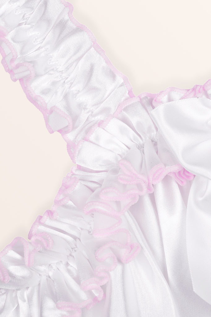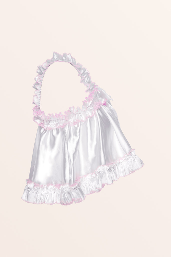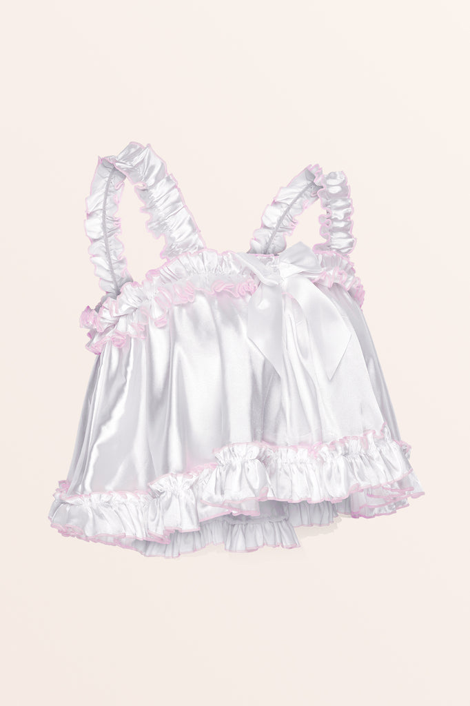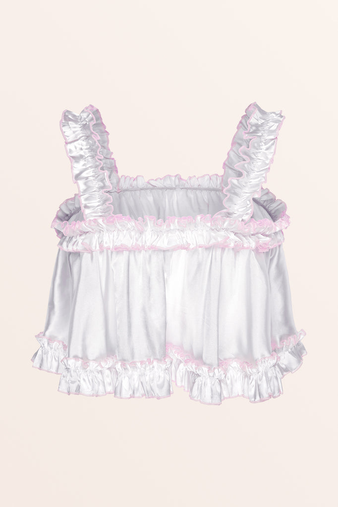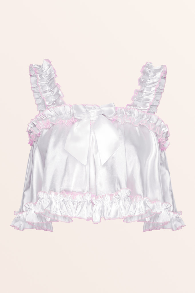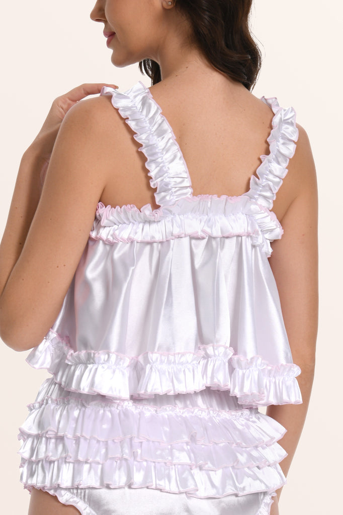 Made from silky soft satin, this top catches the light beautifully, adding a lustrous sheen to your look. Designed with elasticated shoulder straps and overbust for a secure and flattering fit, it suits various body types. Elegantly rolled ruffled edges along the neckline, straps, and hem add playful femininity and texture. Perfect for crossdressing, sissy play, pride, cosplay, or just for fun, this versatile cami top invites everyone to embrace their style and feel sexy.