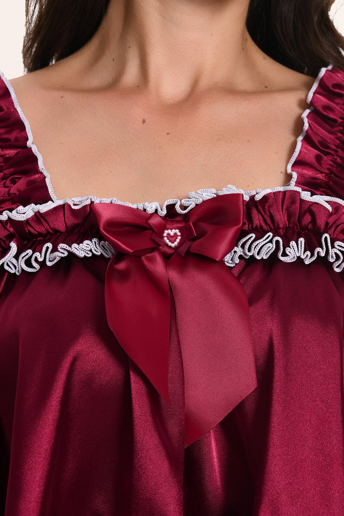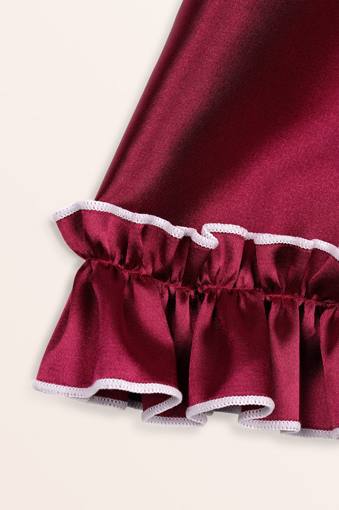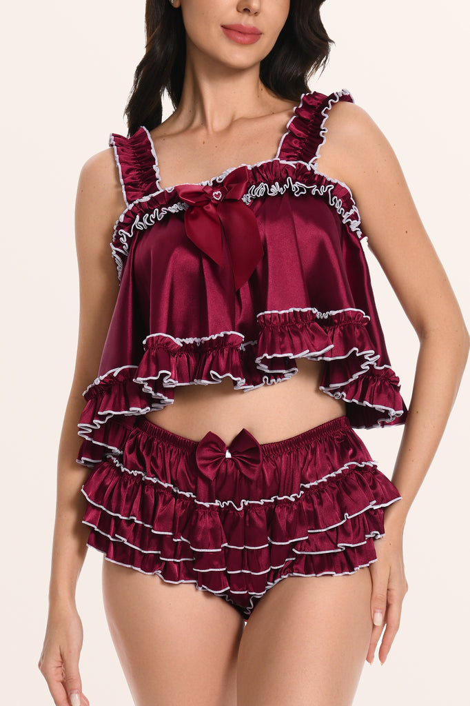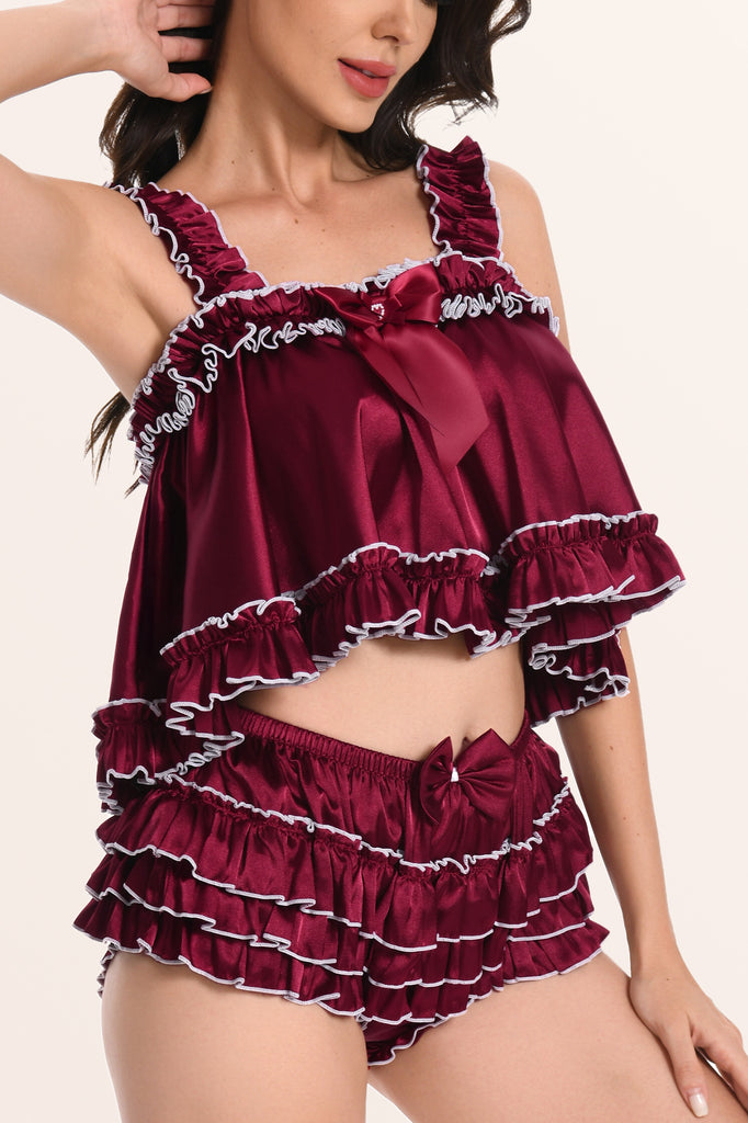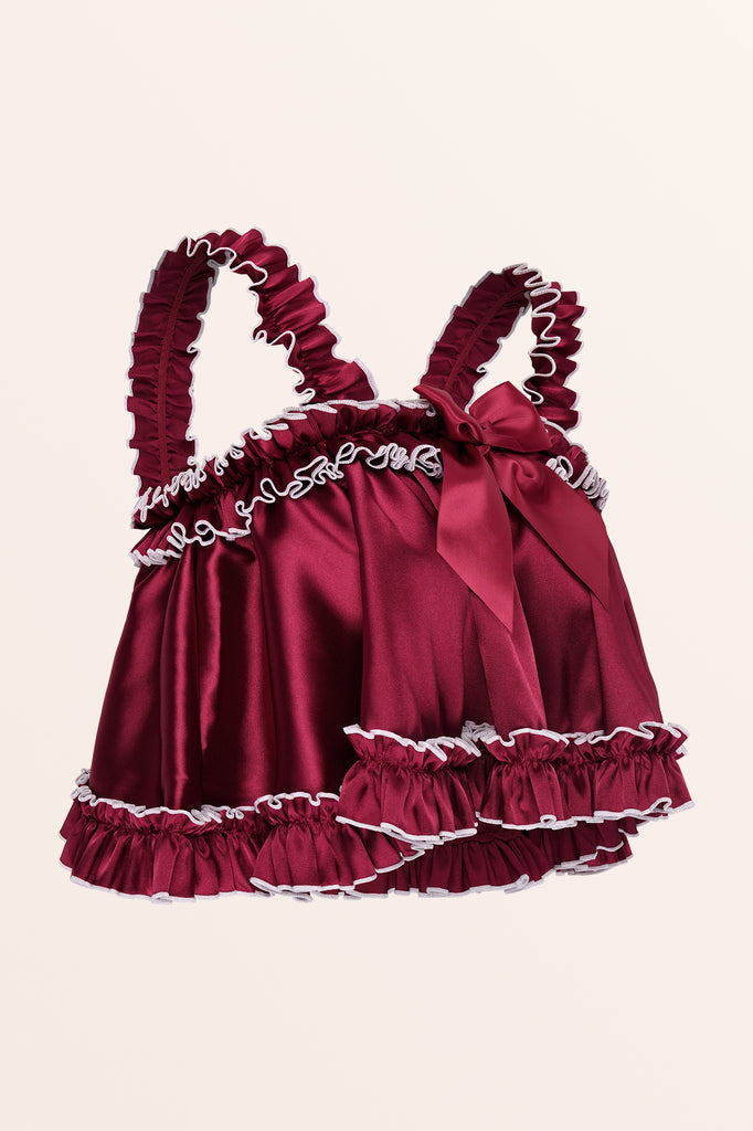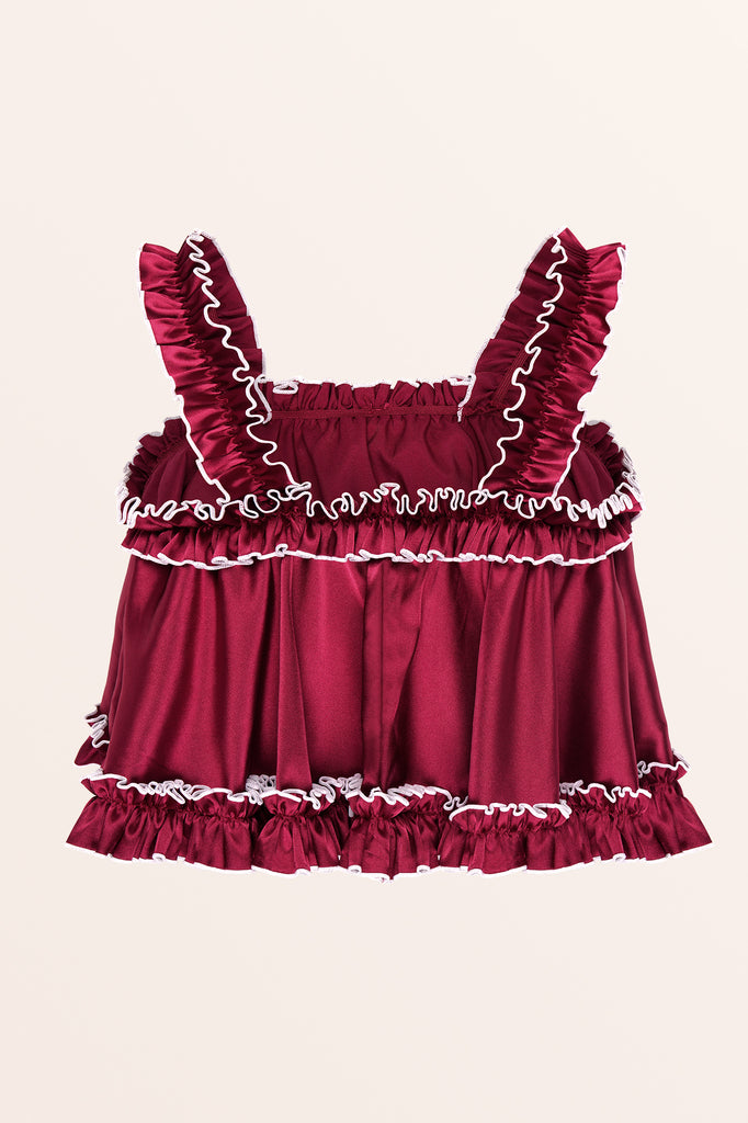 Made from silky soft satin, this top catches the light beautifully, adding a lustrous sheen to your look. Designed with elasticated shoulder straps and overbust for a secure and flattering fit, it suits various body types. Elegantly rolled ruffled edges along the neckline, straps, and hem add playful femininity and texture. Perfect for crossdressing, sissy play, pride, cosplay, or just for fun, this versatile cami top invites everyone to embrace their style and feel sexy.