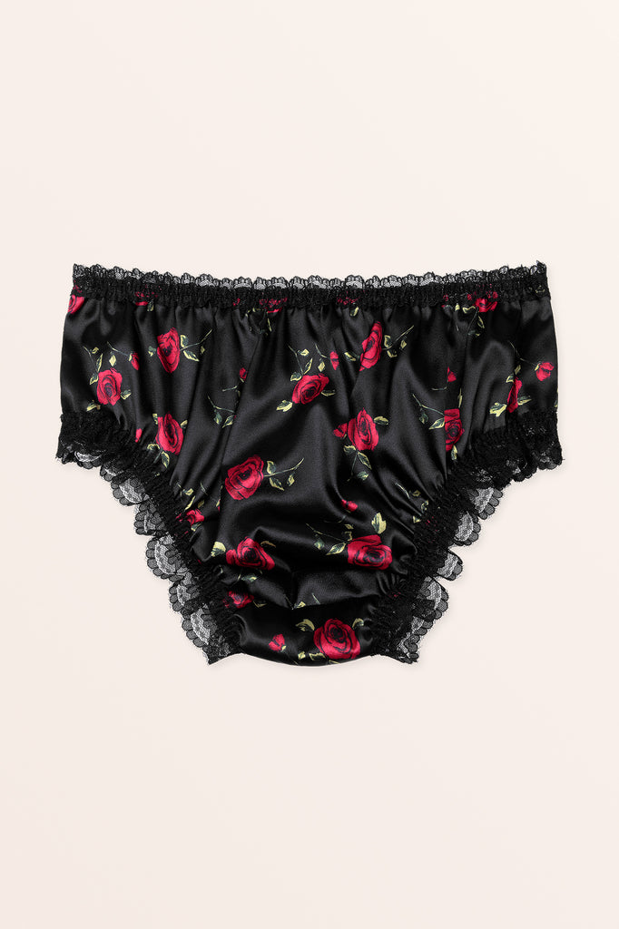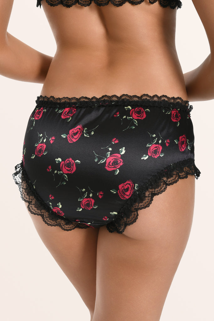 The center of this pair contains a beautiful bow motif with a fabric rose emblem, adding a touch of elegance and femininity to the overall design. The wide gusset provides additional comfort and coverage, while the frilly lace adds a playful and flirty touch.