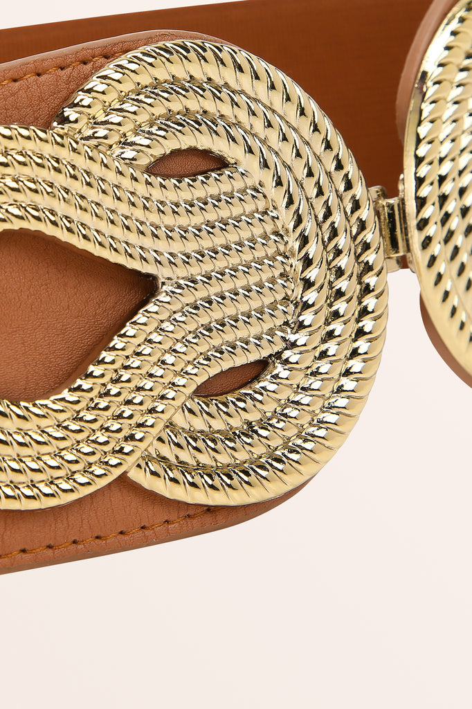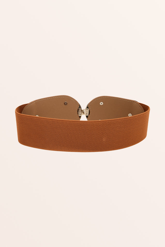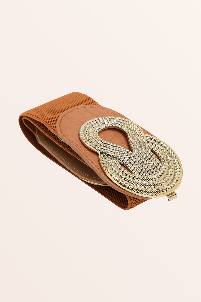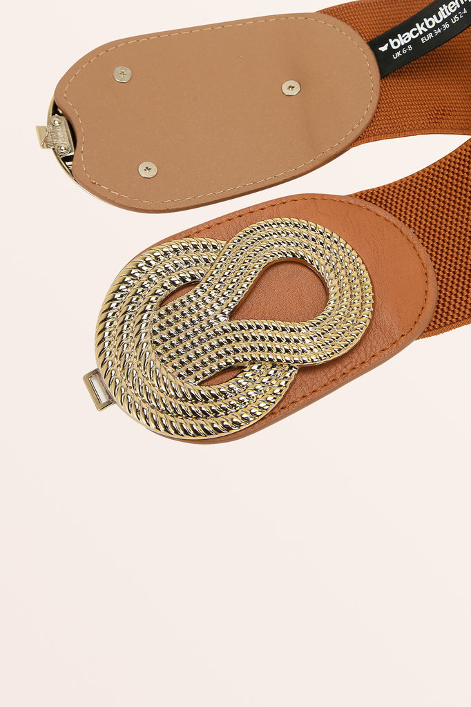 A 2.5 inch wide retro corset belt with a large decorative rope design hook fastening. As the material is stretchy elastic, it will adjust to many varied sizes. The belt is continuous elastic the whole way around.