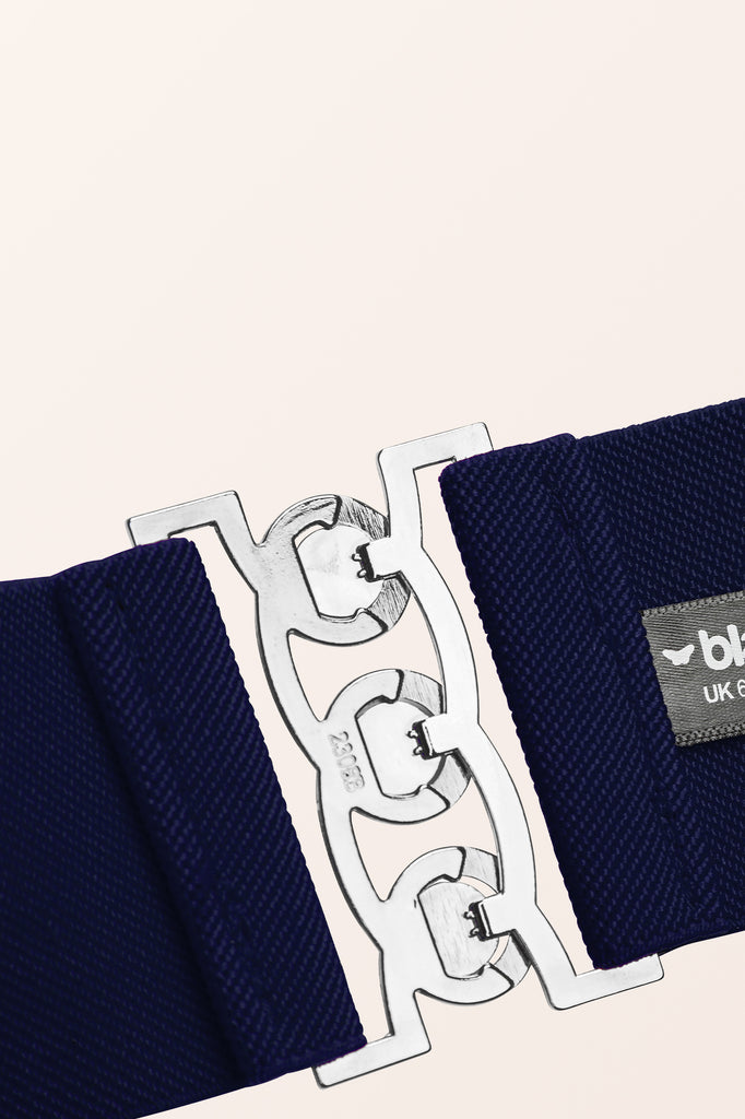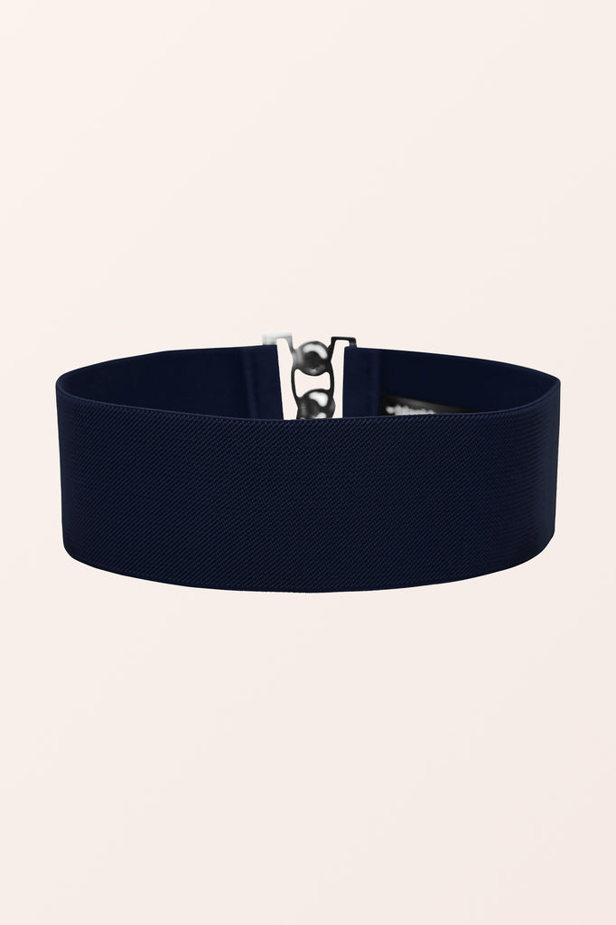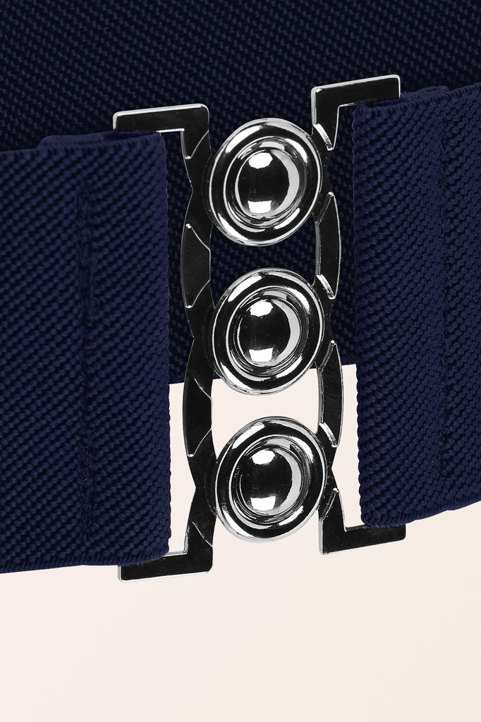 Un cinturón retro de 2,5 pulgadas de ancho con una hebilla entrelazada duradera. Como el material es elástico, se ajustará a muchos tamaños variados. El cinturón es elástico continuo en todo su perímetro.