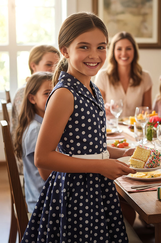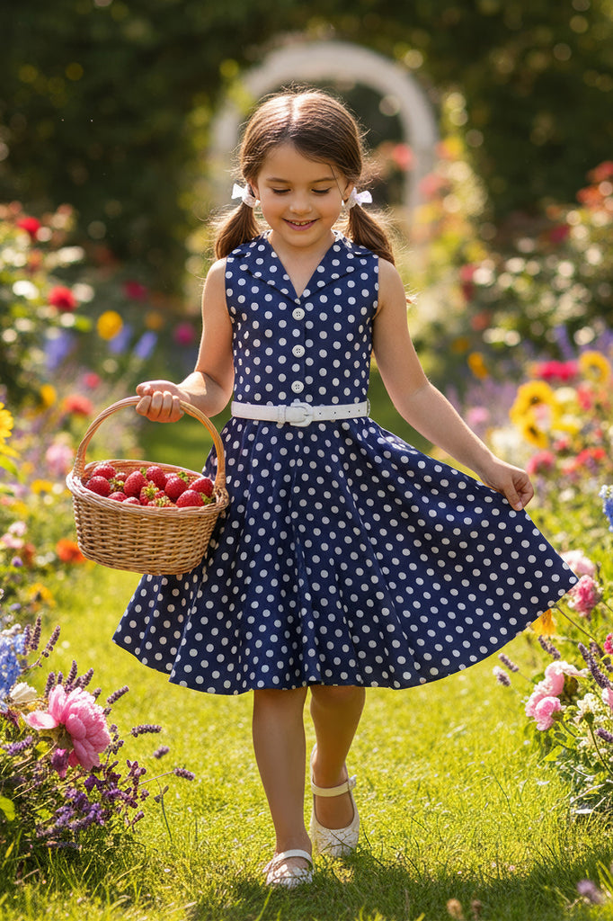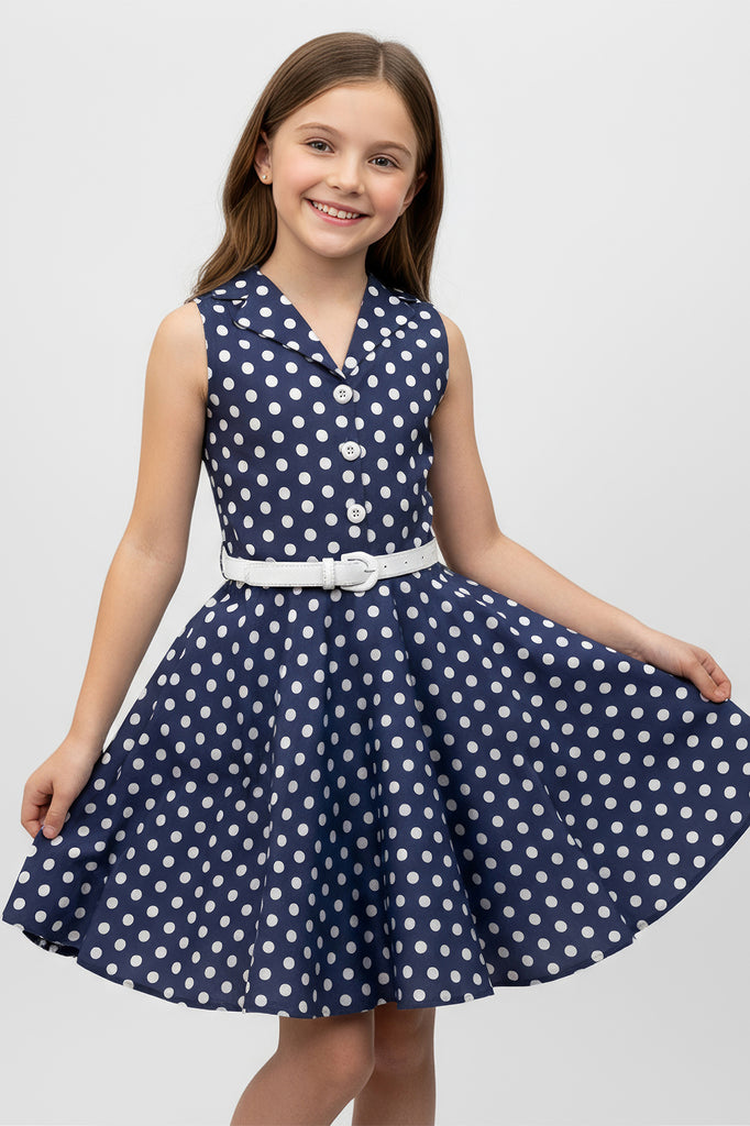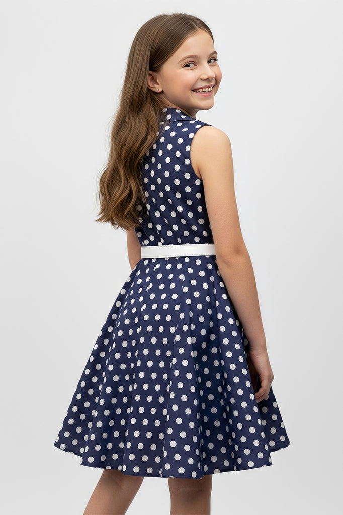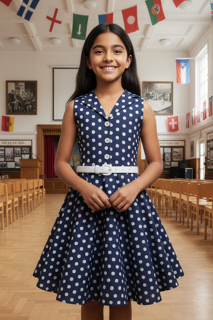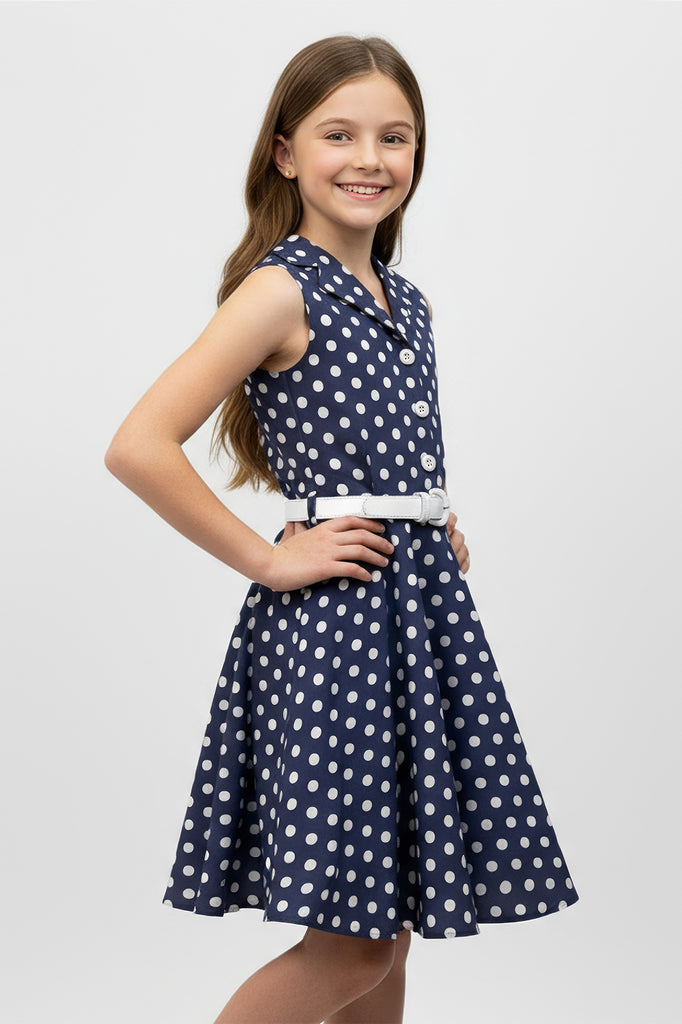 ¡Este hermoso vestido vintage sin mangas inspirado en lunares está disponible para señoritas! El vestido presenta un escote con cuello, frente abotonado y una falda acampanada de círculo completo. El vestido tiene una cremallera lateral y un cinturón de PU blanco. Además, el interior de esta prenda está completamente forrado brindándote ese extra de comodidad sin comprometer el look.