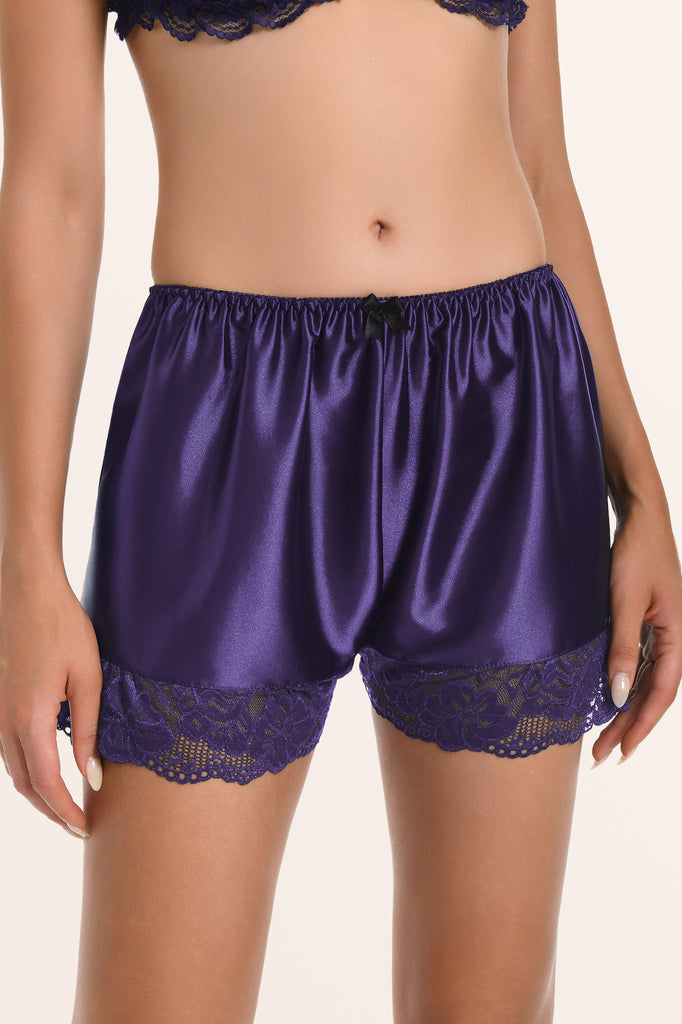 Presentamos nuestros pantalones cortos de encaje satinado, la combinación perfecta de elegancia y comodidad. Estos pantalones cortos cuentan con una suave tela satinada que cubre maravillosamente las piernas, acentuada por un delicado borde de encaje floral en la parte inferior que agrega un toque de romance a estos pantalones cortos . La cintura está rematada con un delicado lazo que añade un toque femenino al diseño general.