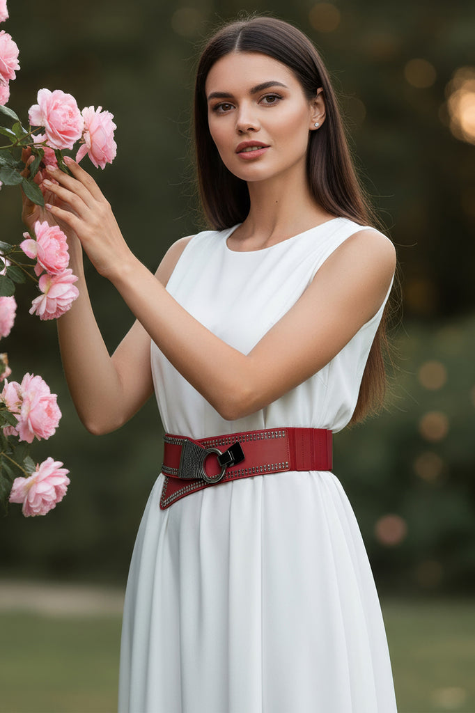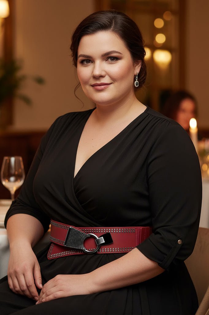 ¡Un cinturón corsé ancho de estilo gótico con un gran cierre de gancho metálico decorativo que se puede ajustar para inclinar el cinturón en diferentes posiciones! Como la parte posterior del cinturón es elástica, se ajustará a una variedad de tamaños.