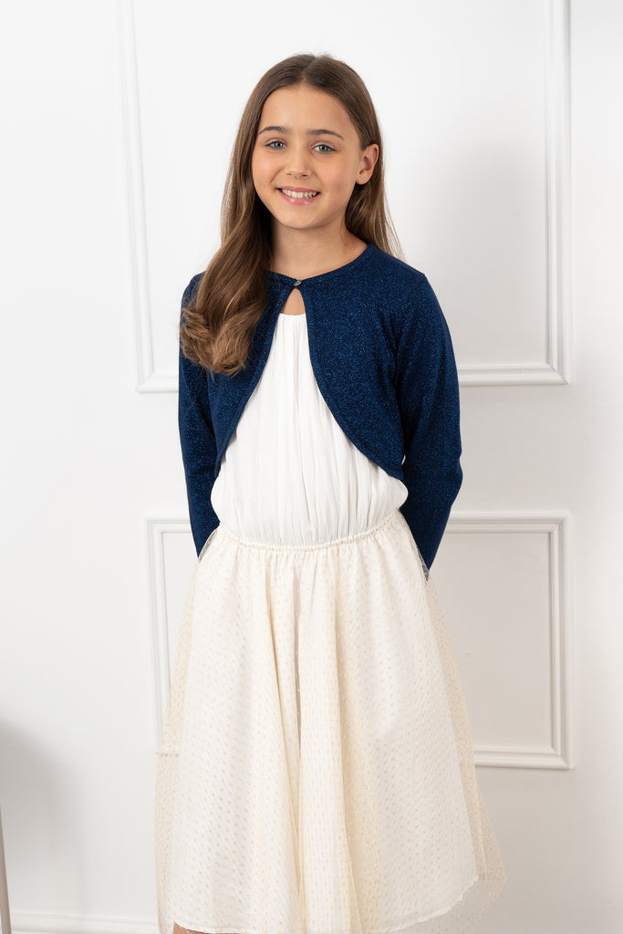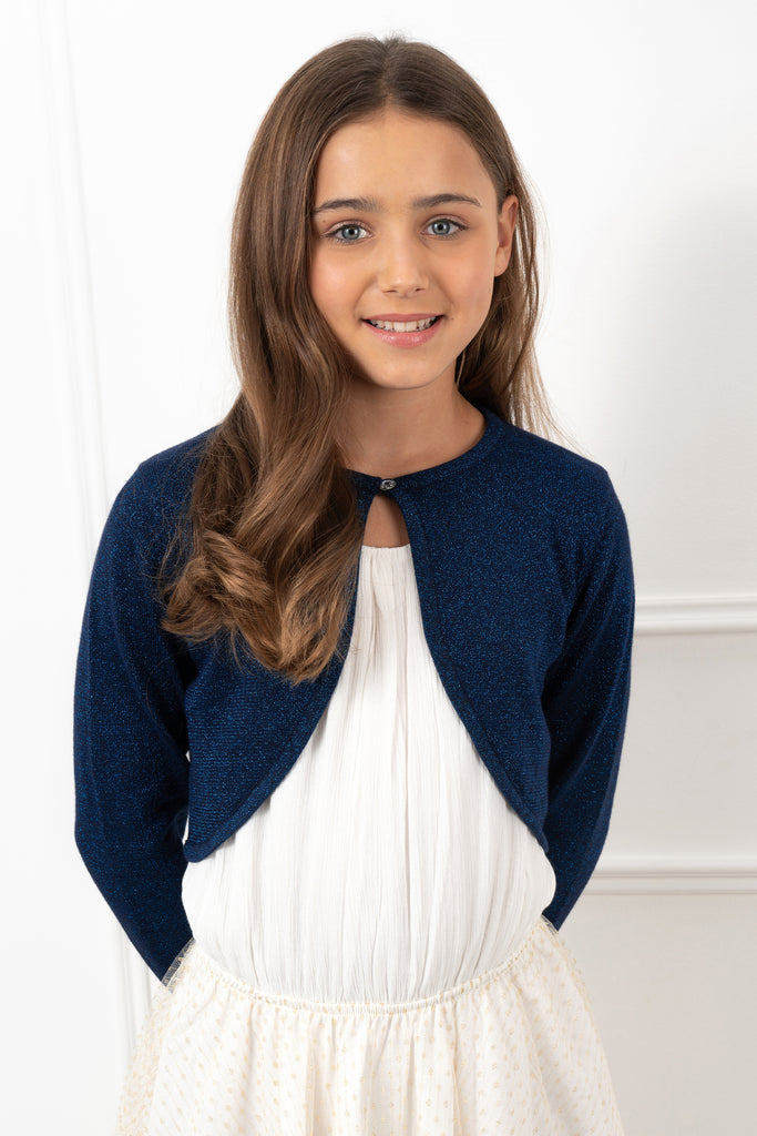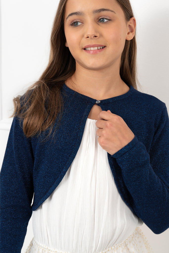 Añade un poco de brillo a su conjunto con este impresionante bolero de manga larga. El material de este bolero está entrelazado con un hermoso pero sutil hilo brillante que lo hace sentir un poco especial. El bolero también está rematado con un lindo botón de diamante en forma de corazón que se cierra en el escote. ¡Perfecto para todo tipo de ocasiones, incluidas damas de honor en bodas, fiestas y veladas especiales!