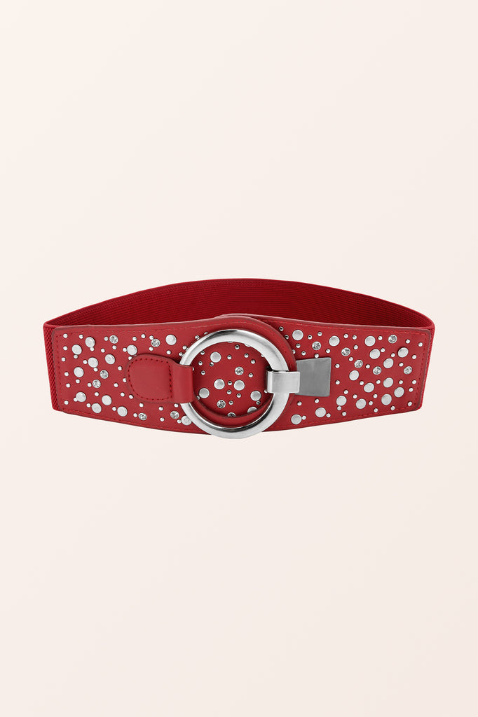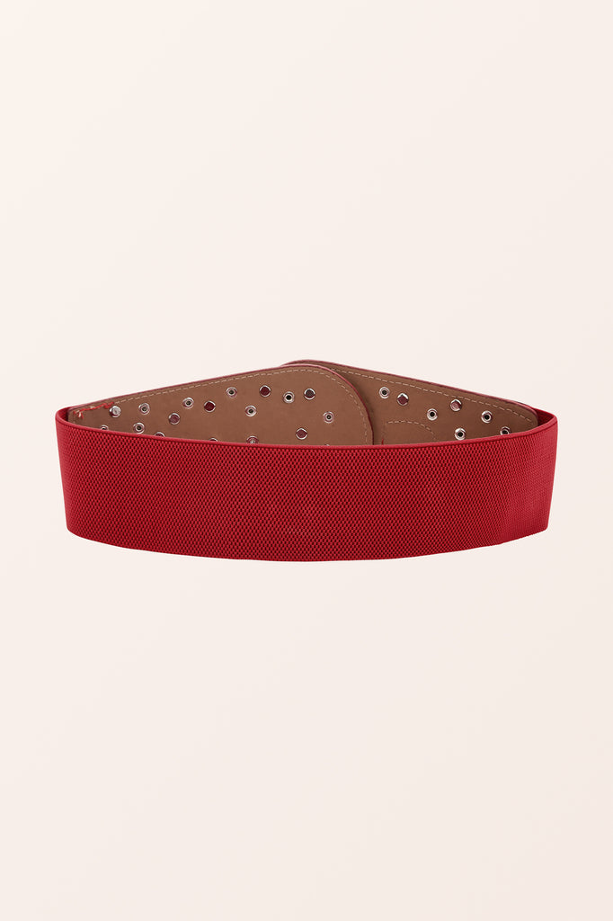 Une large ceinture corset de style rétro avec une grande fermeture à crochet métallique décorative qui peut être ajustée pour incliner la ceinture dans différentes positions ! Comme l'arrière de la ceinture est élastique, elle s'ajuste à une variété de tailles.