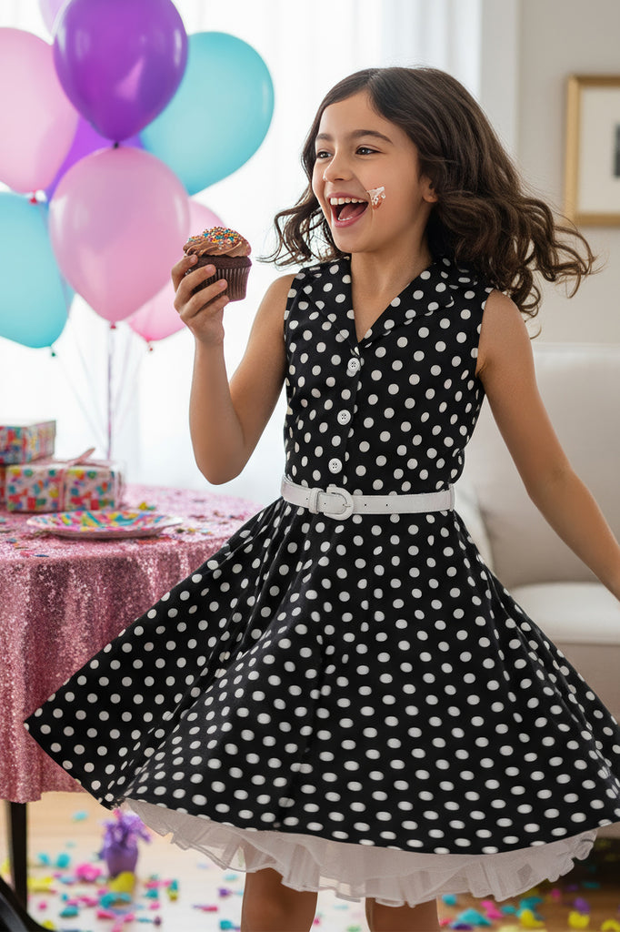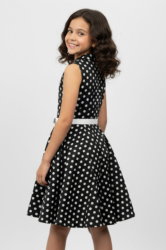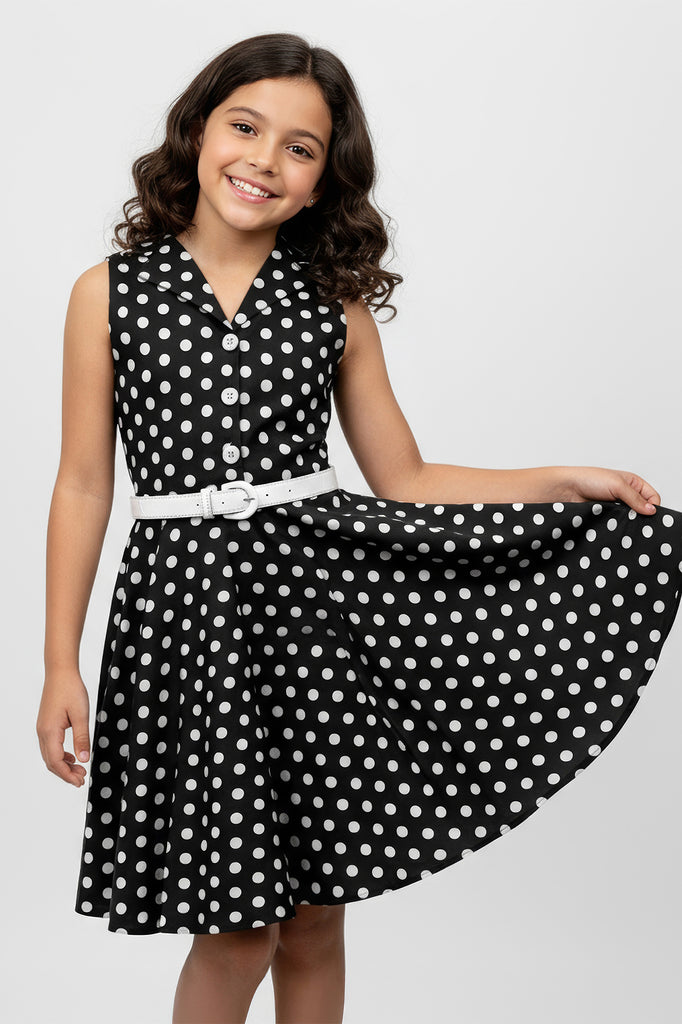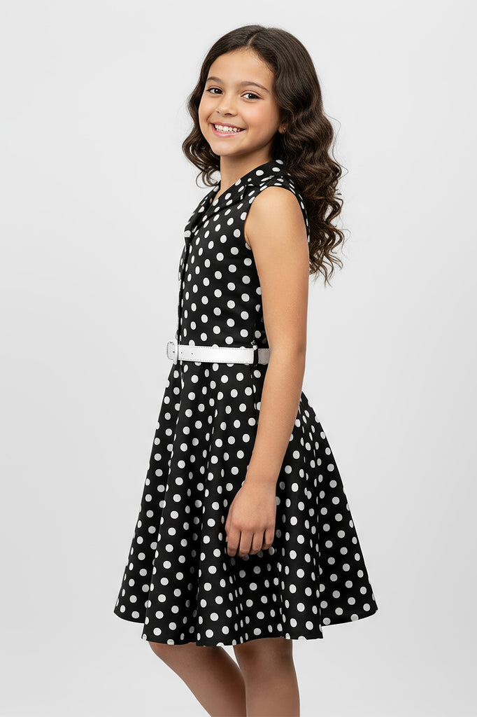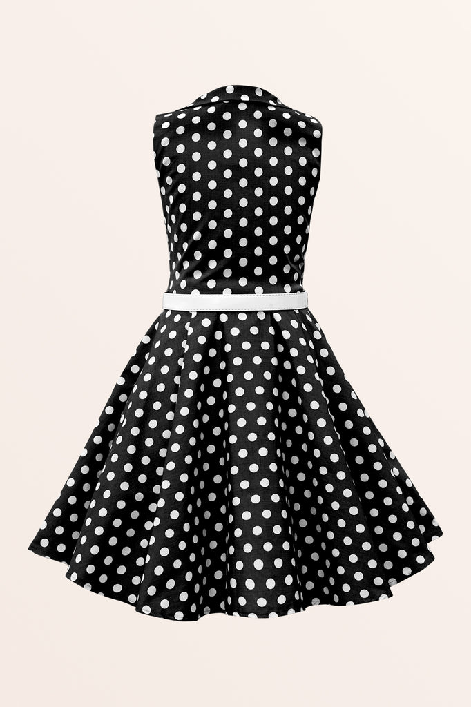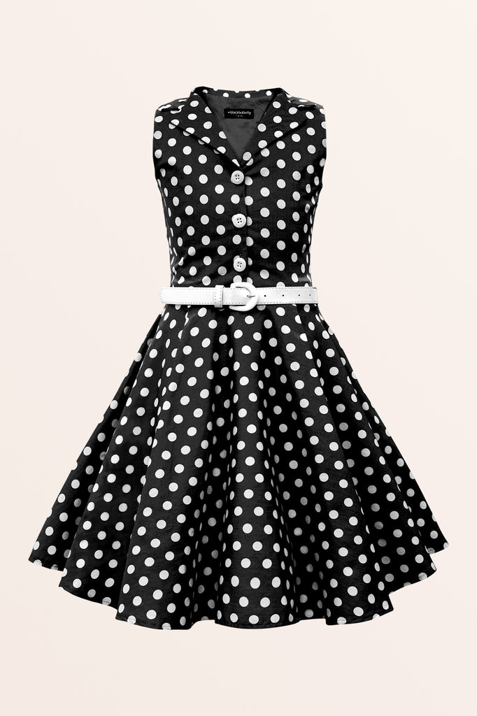 Cette jolie robe vintage à pois sans manches est disponible pour les jeunes femmes ! La robe présente un décolleté avec un devant boutonné et une jupe évasée en cercle complet. La robe a une fermeture éclair latérale et une ceinture en PU blanc. De plus, l'intérieur de ce vêtement est entièrement doublé, ce qui vous offre un confort supplémentaire sans compromettre le look.