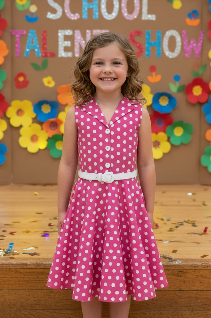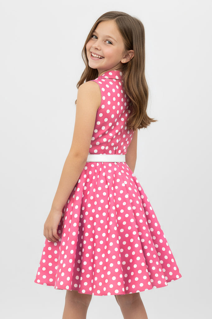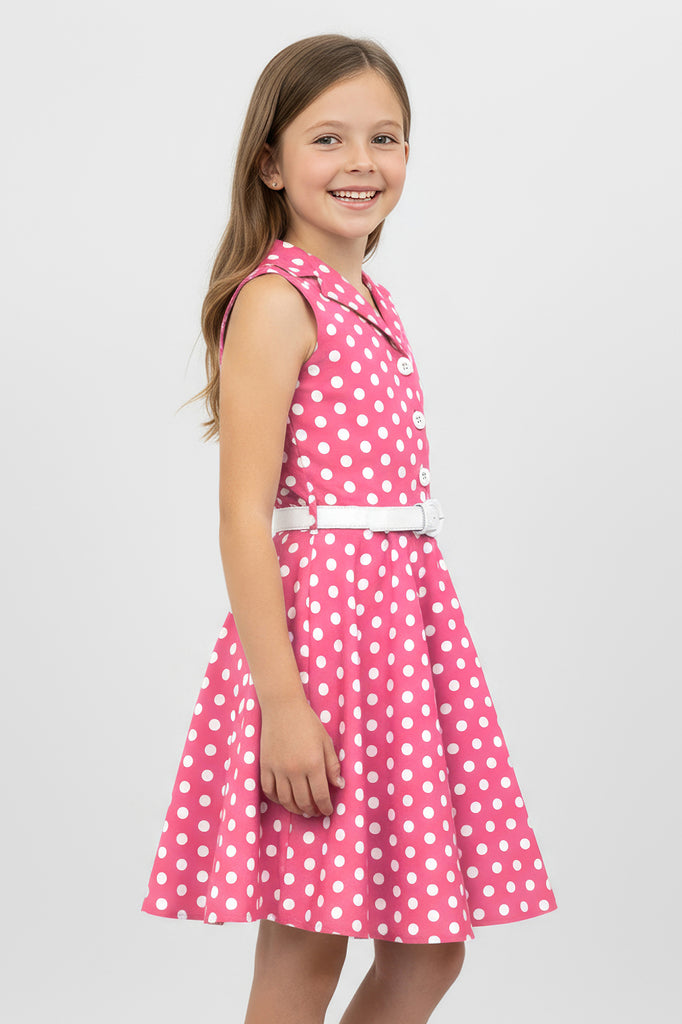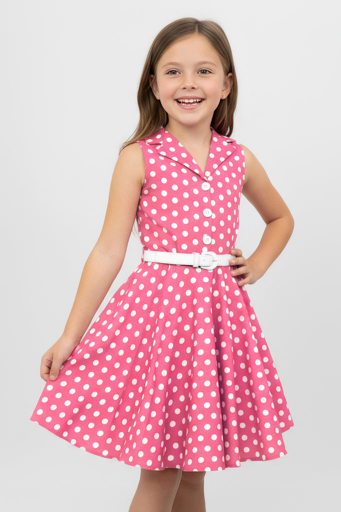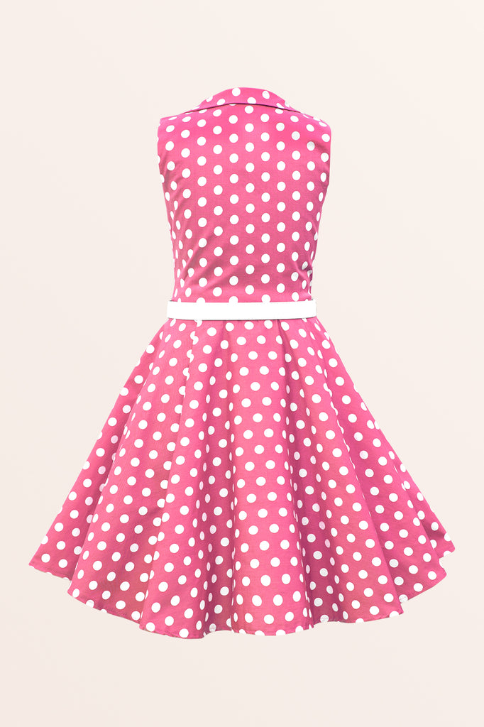 Cette jolie robe vintage à pois sans manches est disponible pour les jeunes femmes ! La robe présente un décolleté avec un devant boutonné et une jupe évasée en cercle complet. La robe a une fermeture éclair latérale et une ceinture en PU blanc. De plus, l'intérieur de ce vêtement est entièrement doublé, ce qui vous offre un confort supplémentaire sans compromettre le look.