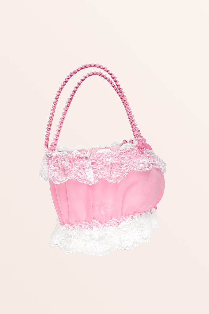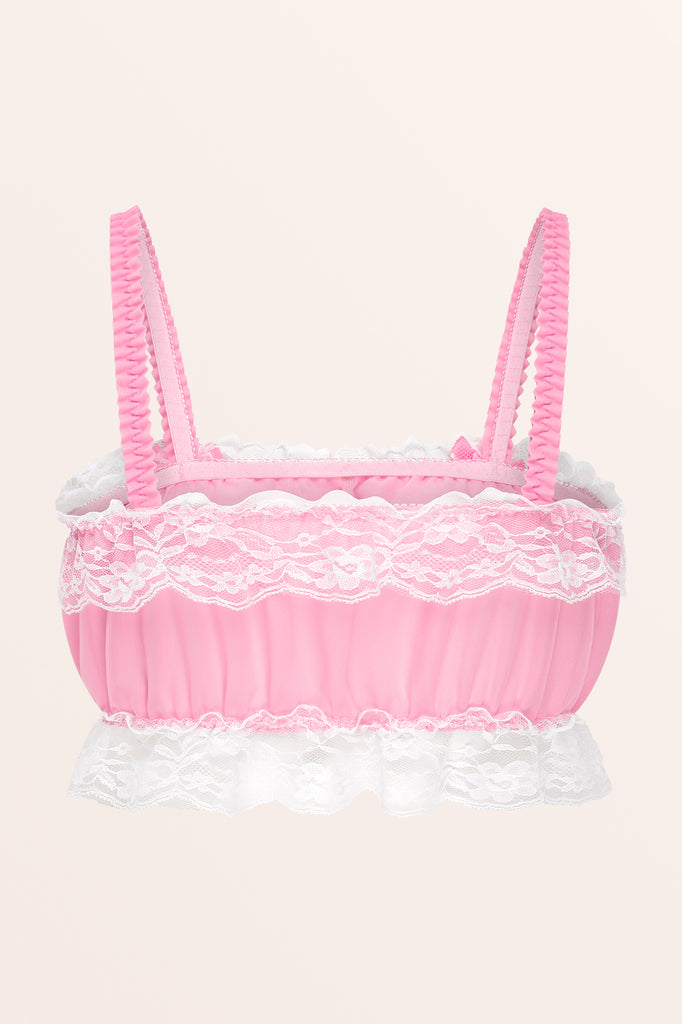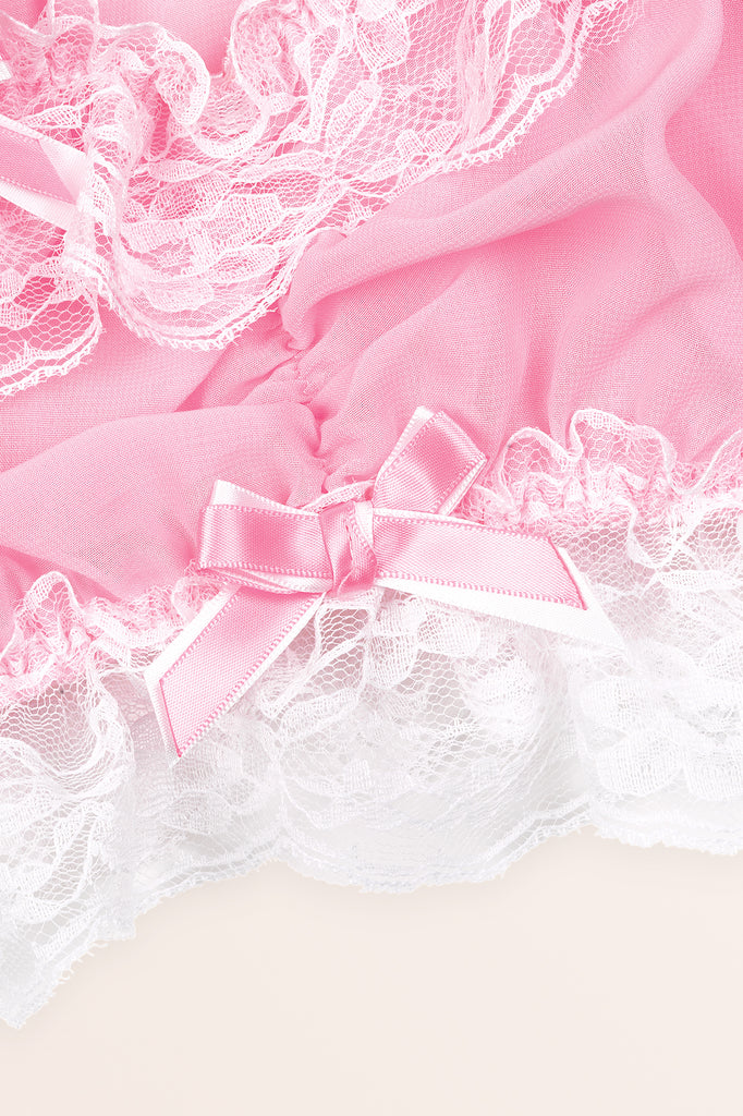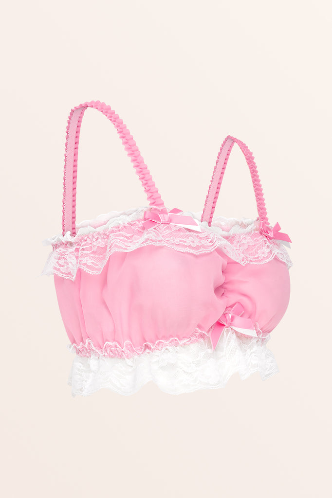 Laat je sexy kant de vrije loop met deze doorschijnende en delicate Sissy-bralette van chiffon. Met elegante kanten details en elastische, draadvrije spaghettibandjes. Perfect voor iedereen die een vleugje vrouwelijkheid aan zijn outfit wil toevoegen.