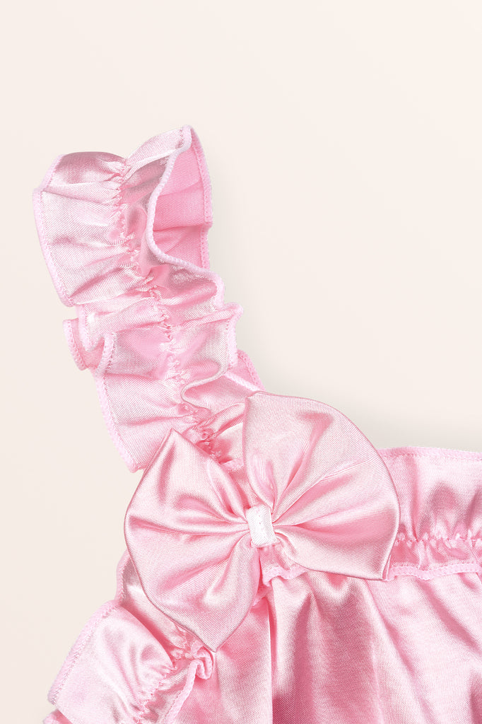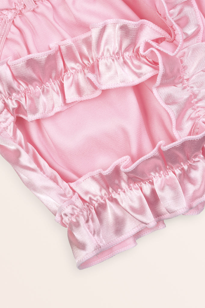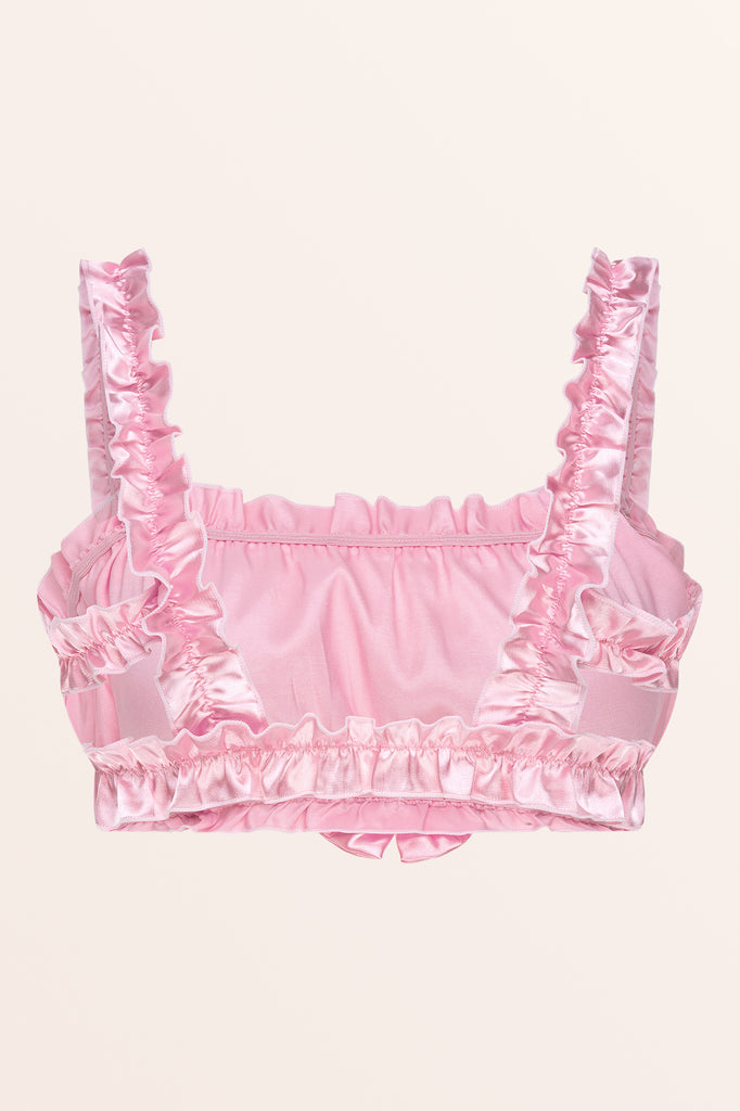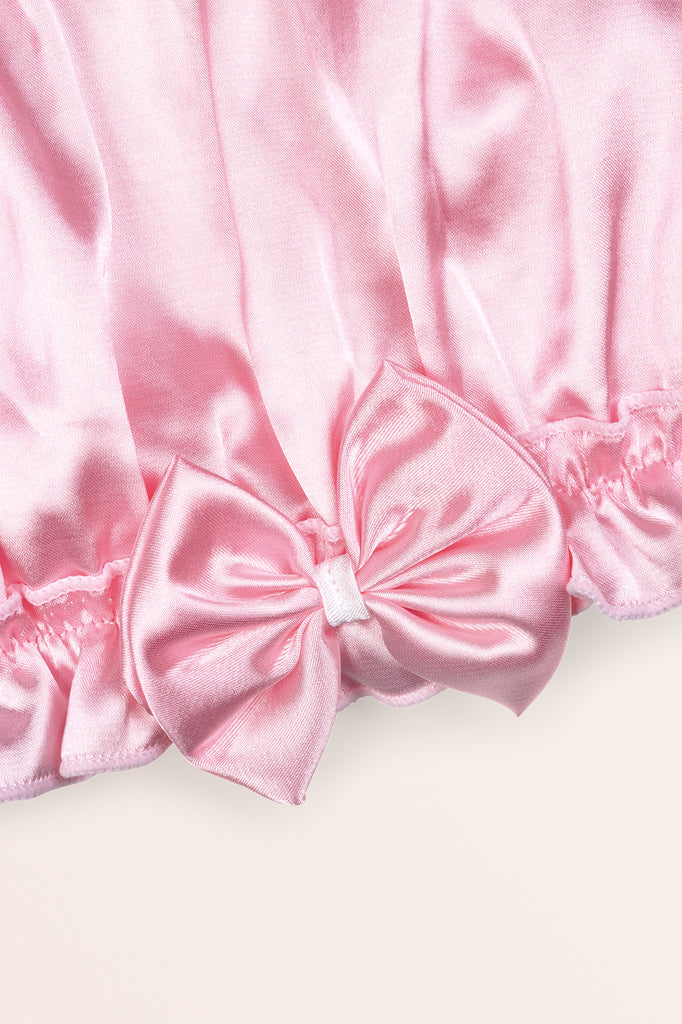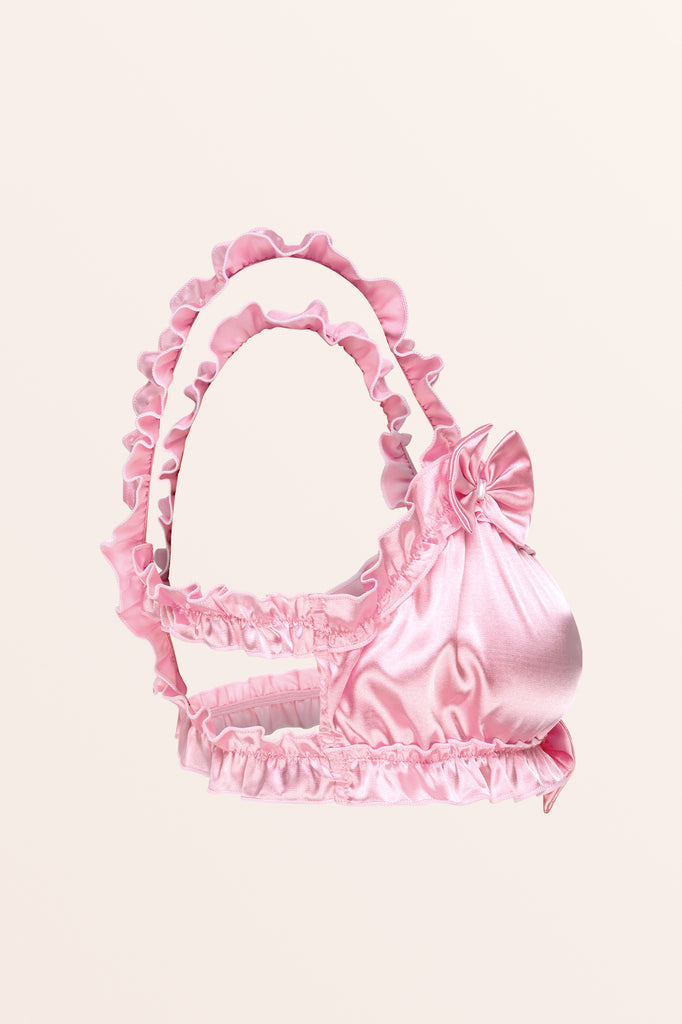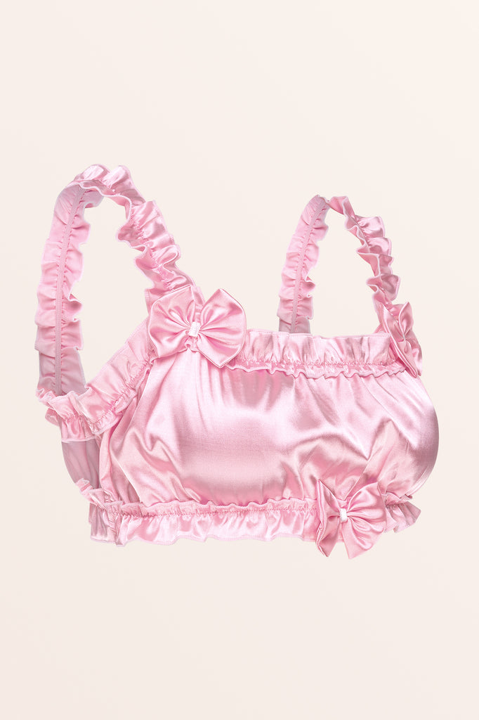 Deze bralette is gemaakt van zijdezacht satijn en heeft rekbare, draadvrije spaghettibandjes voor een ongelooflijk comfortabele pasvorm. Het beschikt over charmante accenten zoals schattige ruches, schattige strikpatronen en flirterige ruches aan de halslijn, bandjes en onderborst, waardoor een vleugje romantiek en speelsheid in je garderobe wordt gebracht.