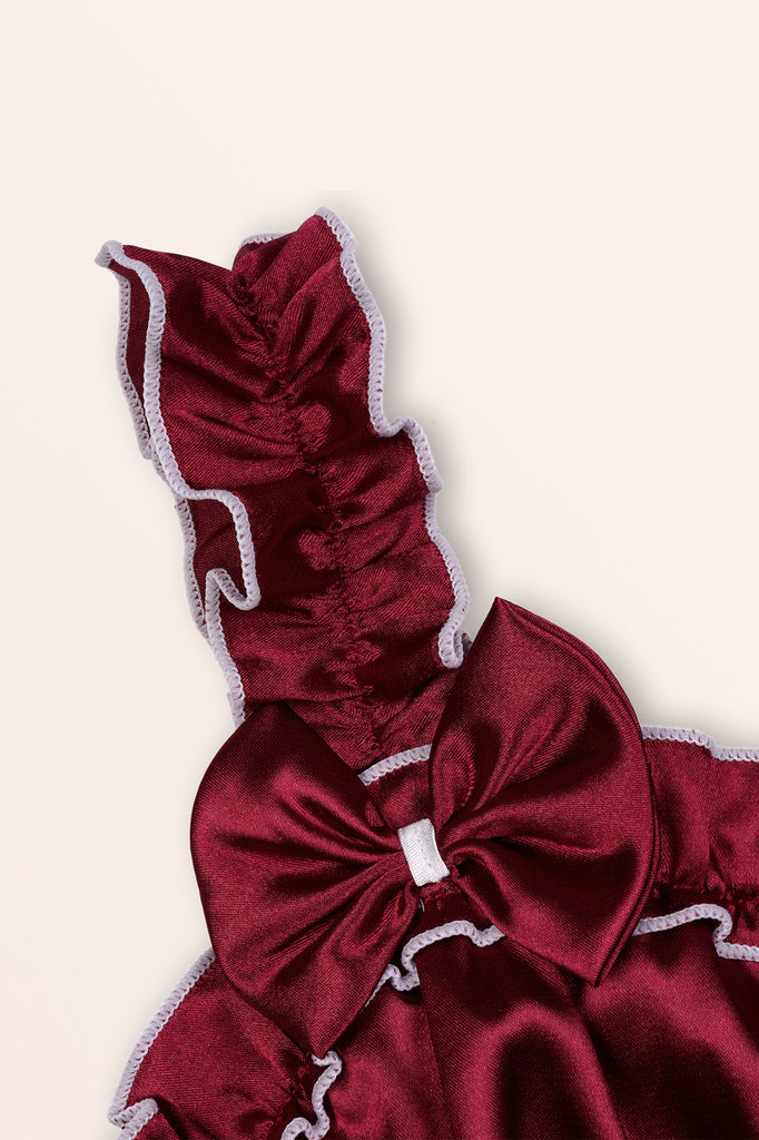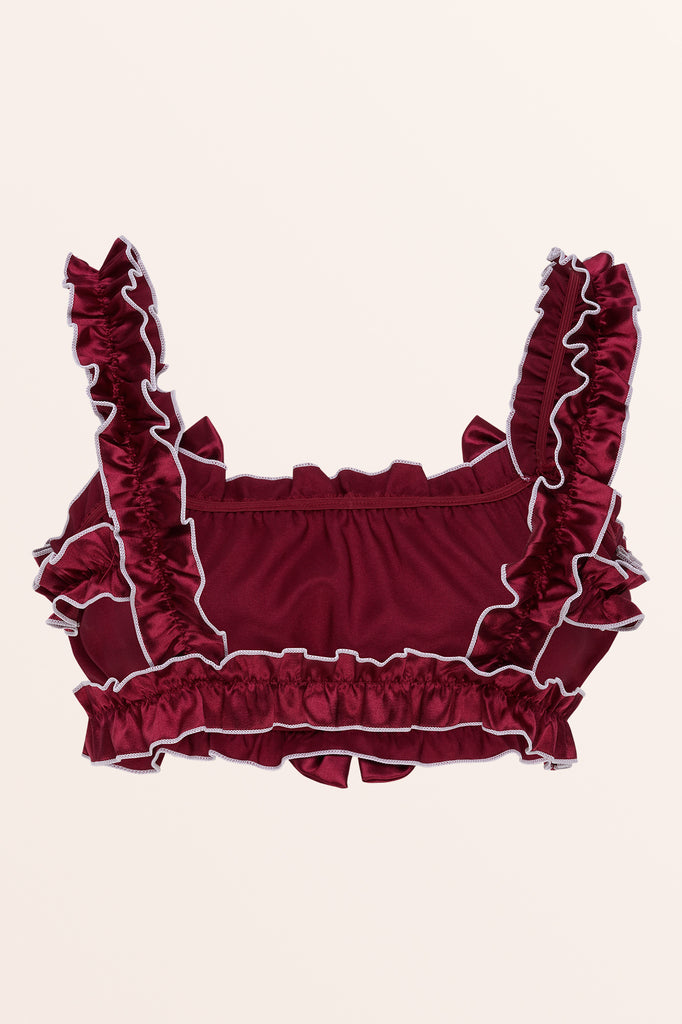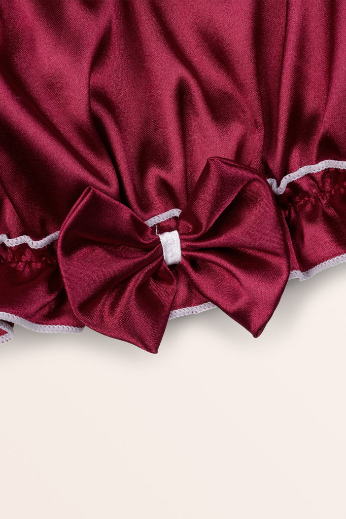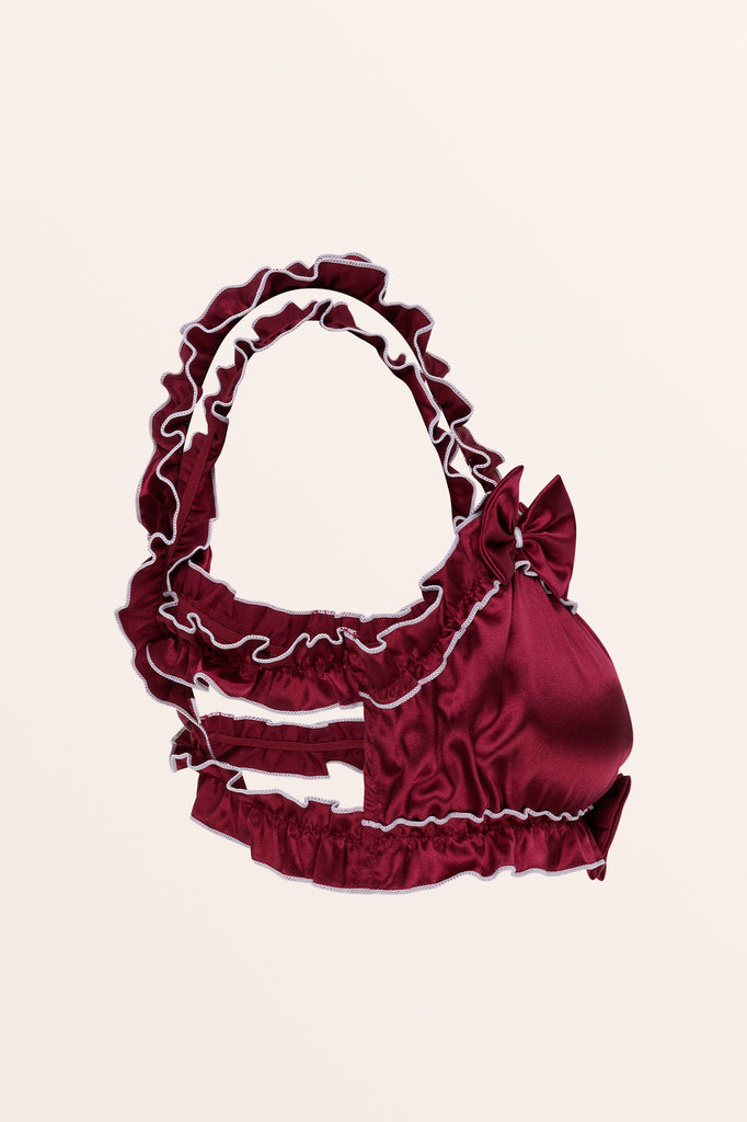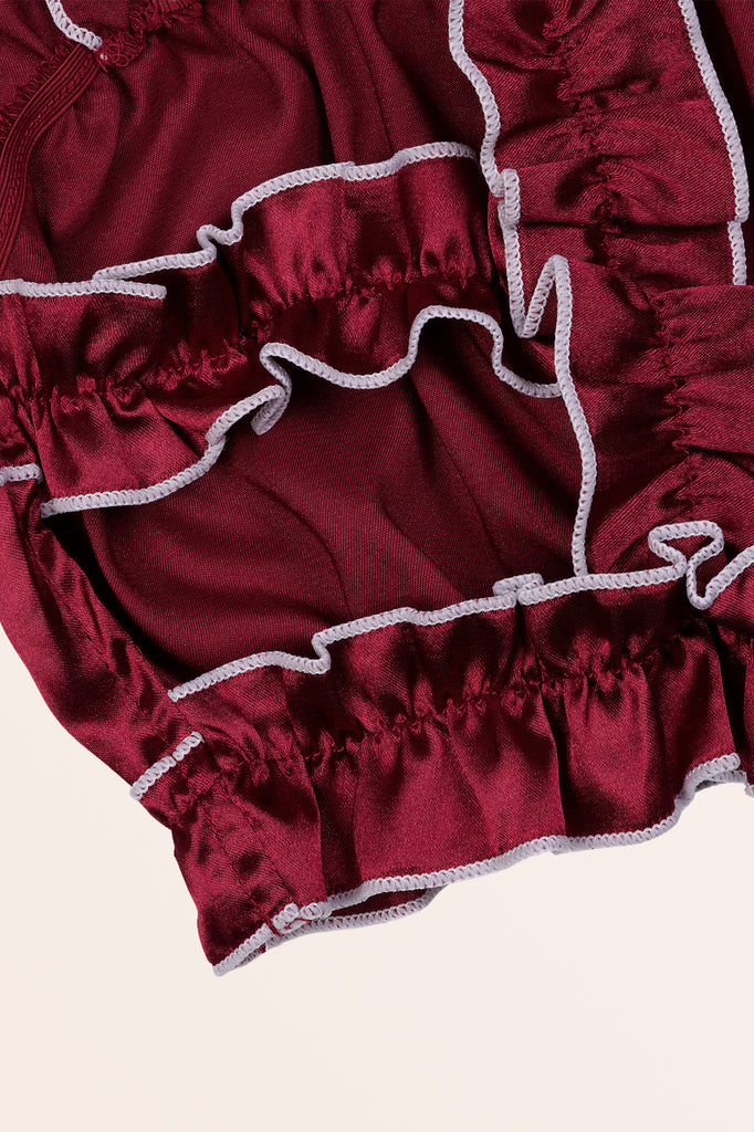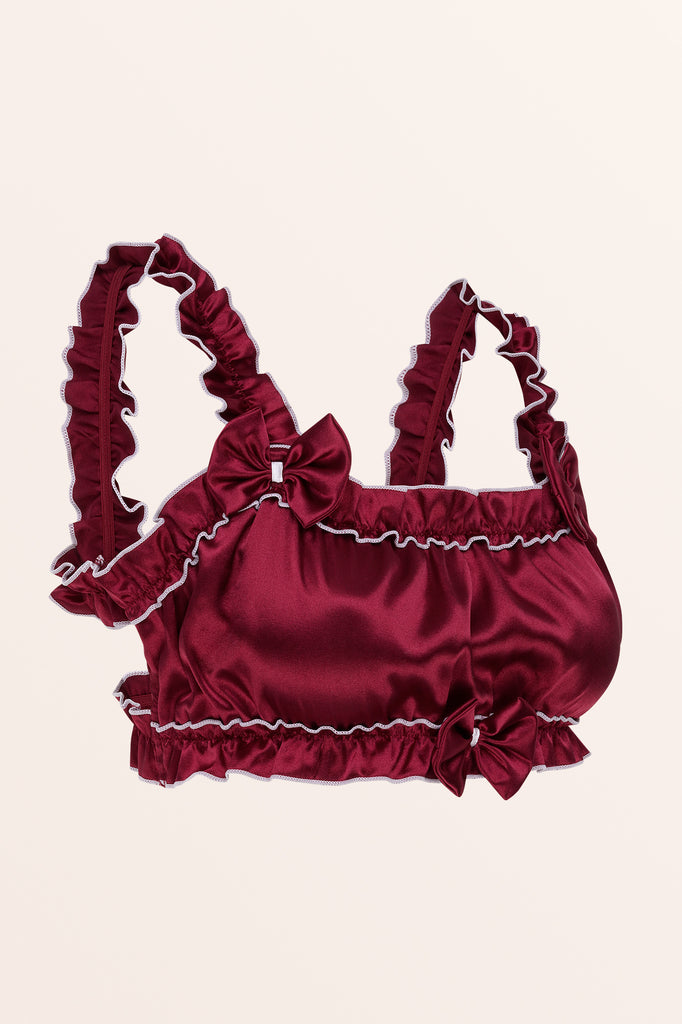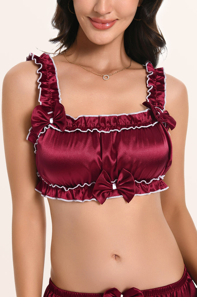 Deze bralette is gemaakt van zijdezacht satijn en heeft rekbare, draadvrije spaghettibandjes voor een ongelooflijk comfortabele pasvorm. Het beschikt over charmante accenten zoals schattige ruches, schattige strikpatronen en flirterige ruches aan de halslijn, bandjes en onderborst, waardoor een vleugje romantiek en speelsheid in je garderobe wordt gebracht.