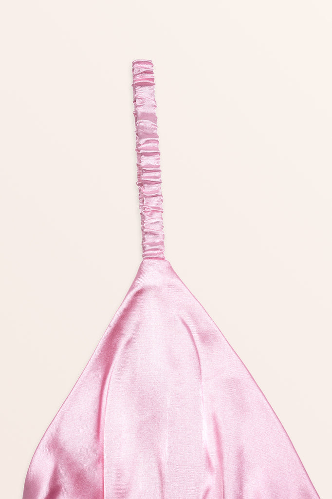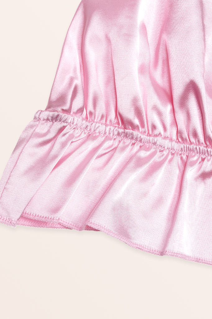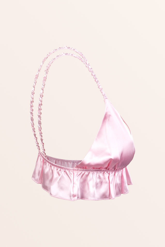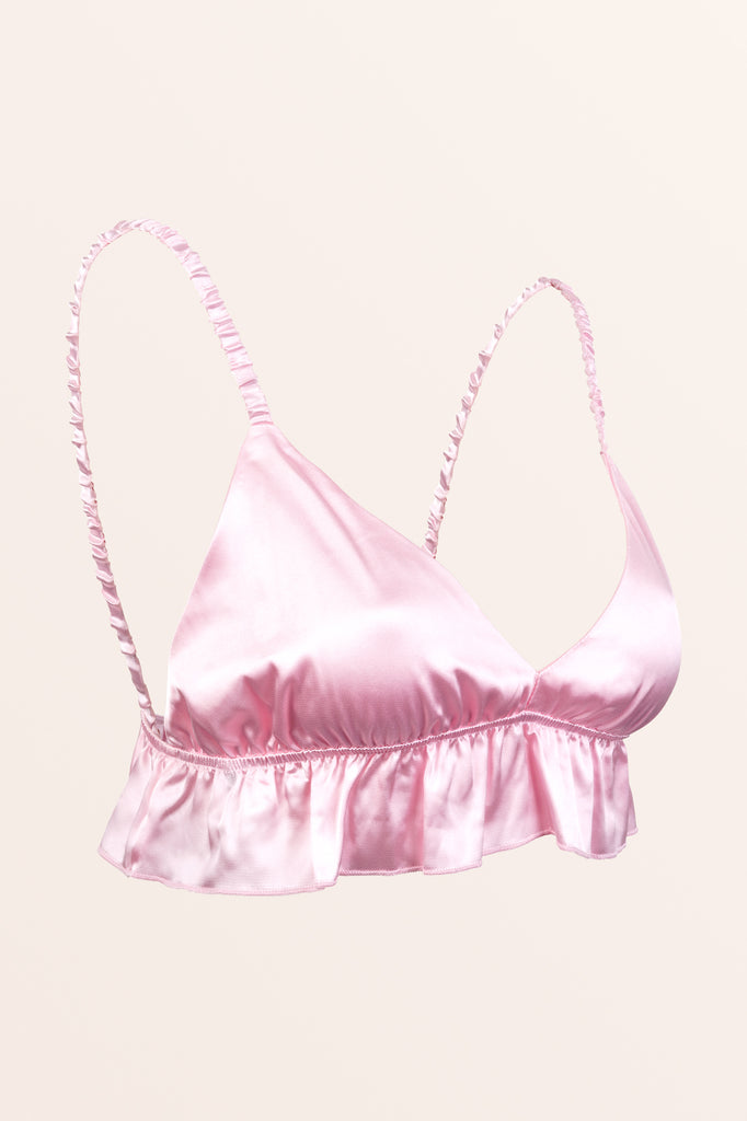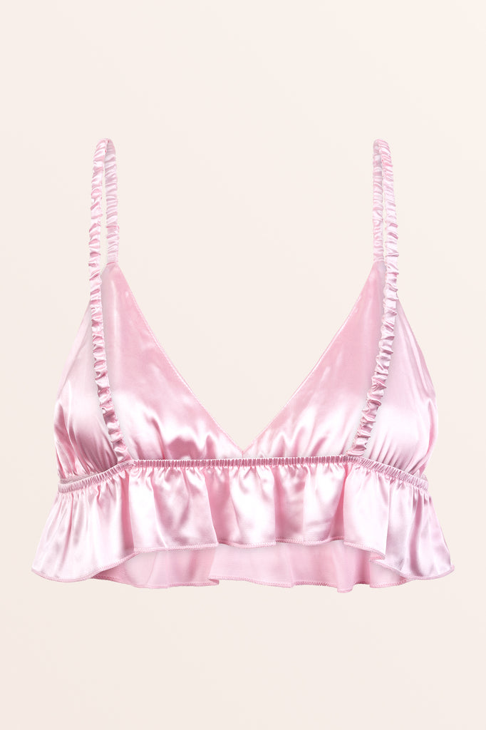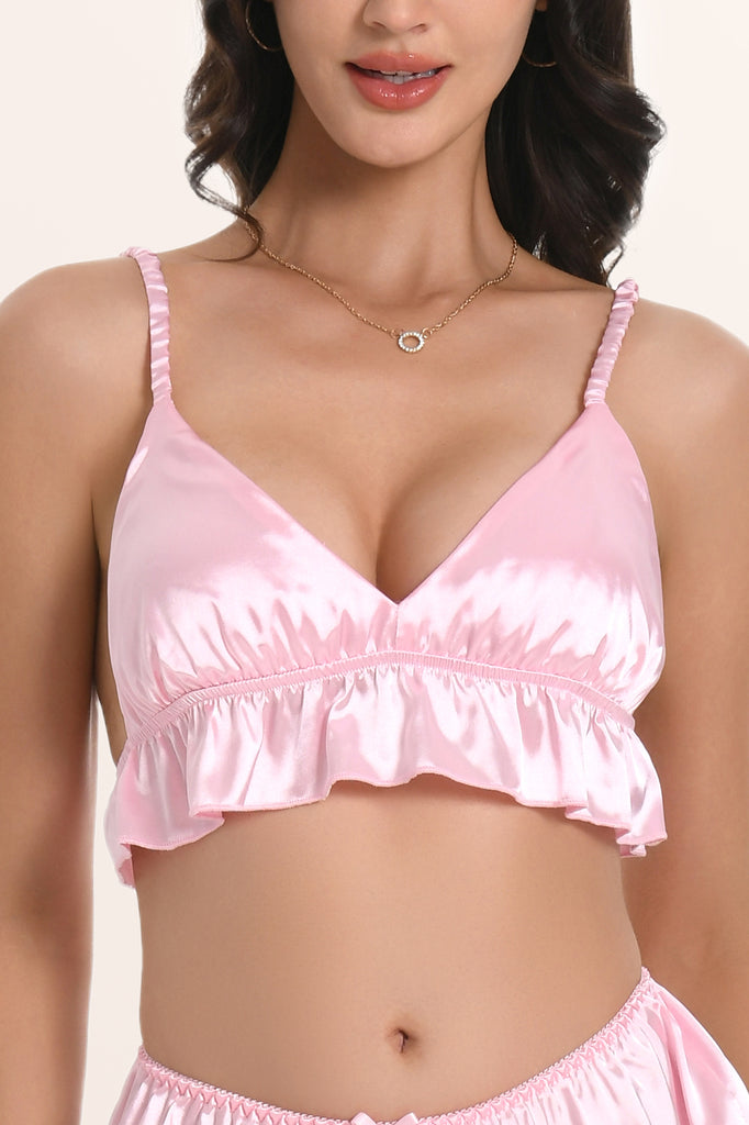 Deze bralette heeft een luxueuze satijnen afwerking met elastische bandjes en een zoom met ruches. Het ontwerp met diepe V-hals voegt allure en verfijning toe, terwijl de elastische spaghettibandjes zorgen voor comfort en flexibiliteit zonder afbreuk te doen aan de stijl.