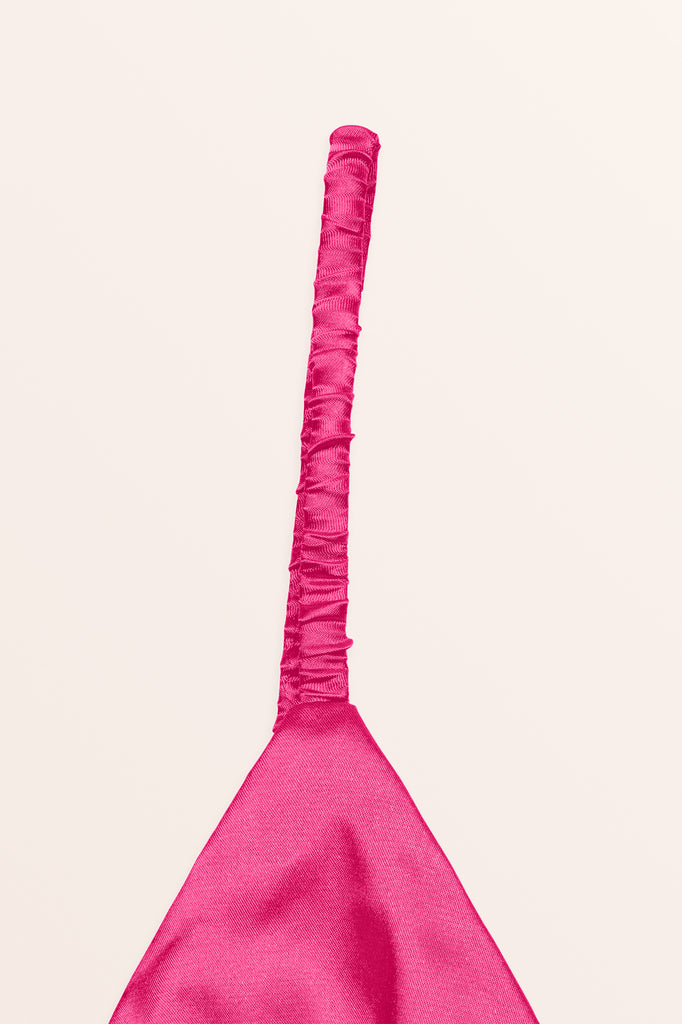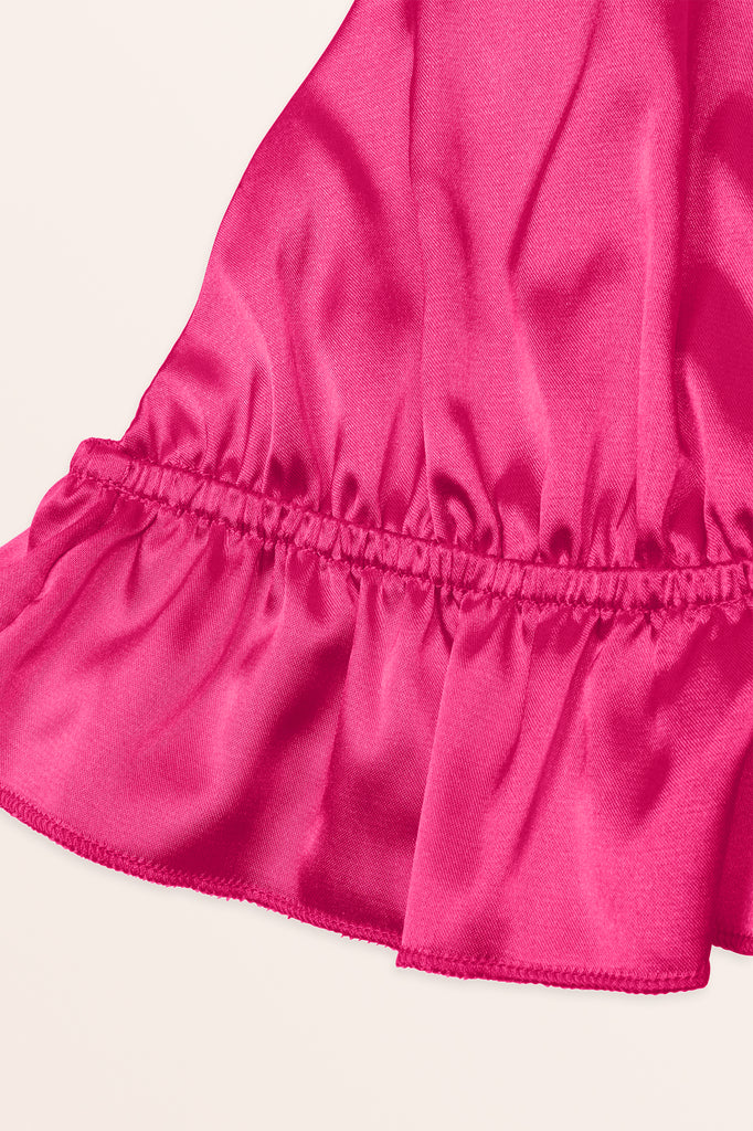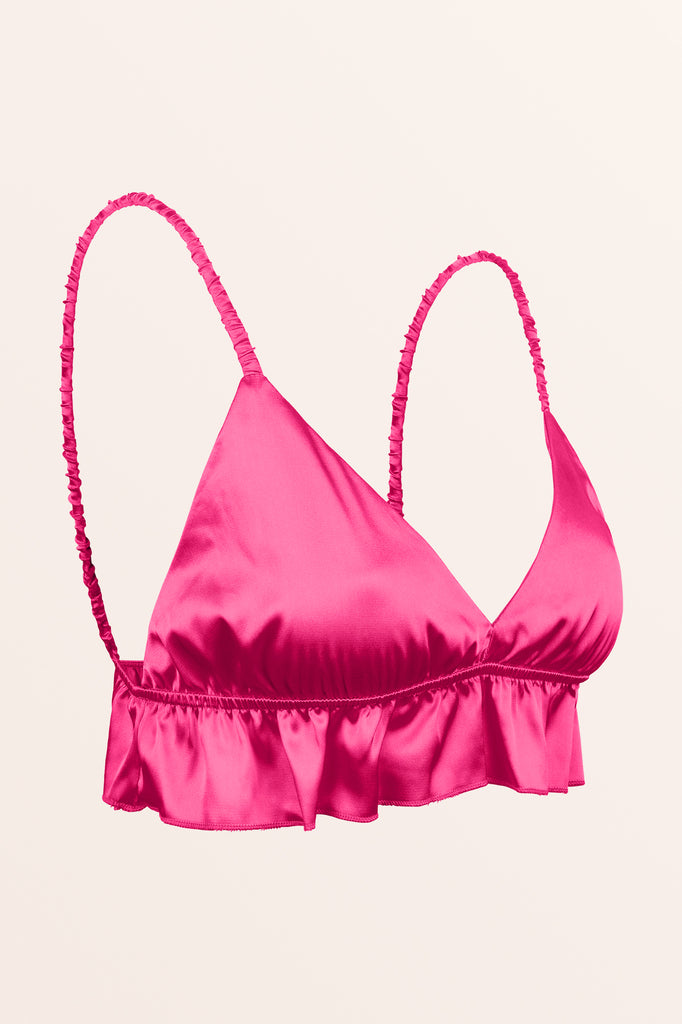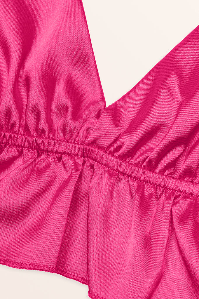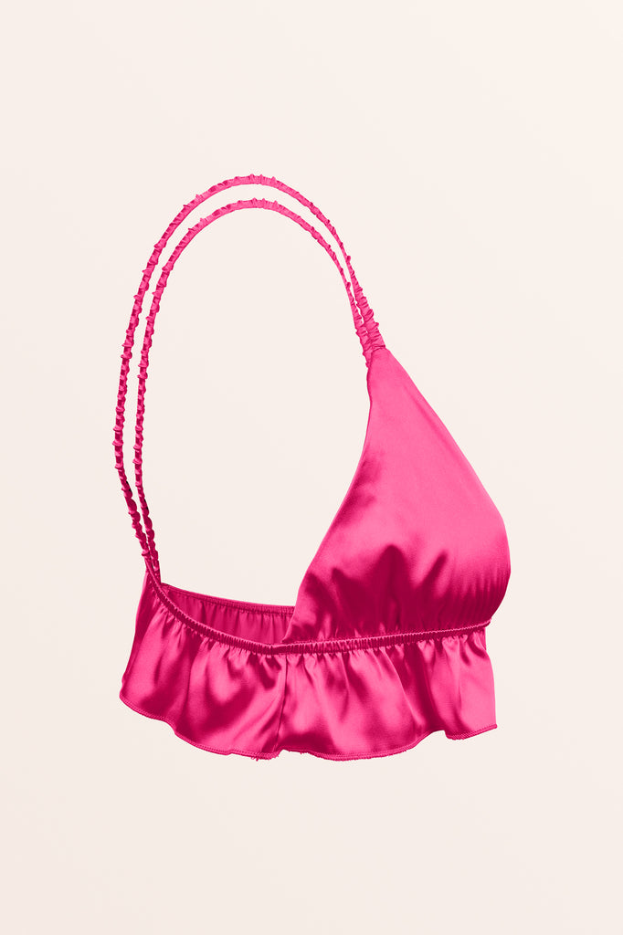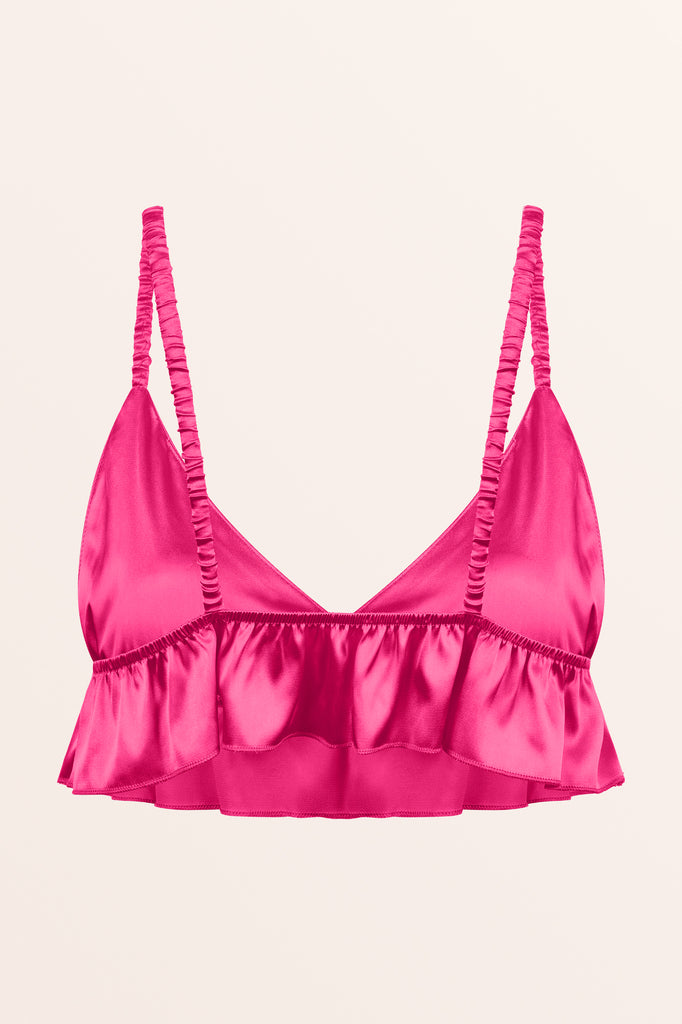 Deze bralette heeft een luxe satijnen afwerking met elastische bandjes en een zoom met ruches. Het ontwerp met diepe V-hals voegt allure en verfijning toe, terwijl de elastische spaghettibandjes zorgen voor comfort en flexibiliteit zonder afbreuk te doen aan de stijl.