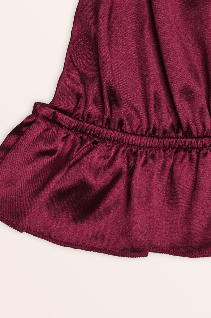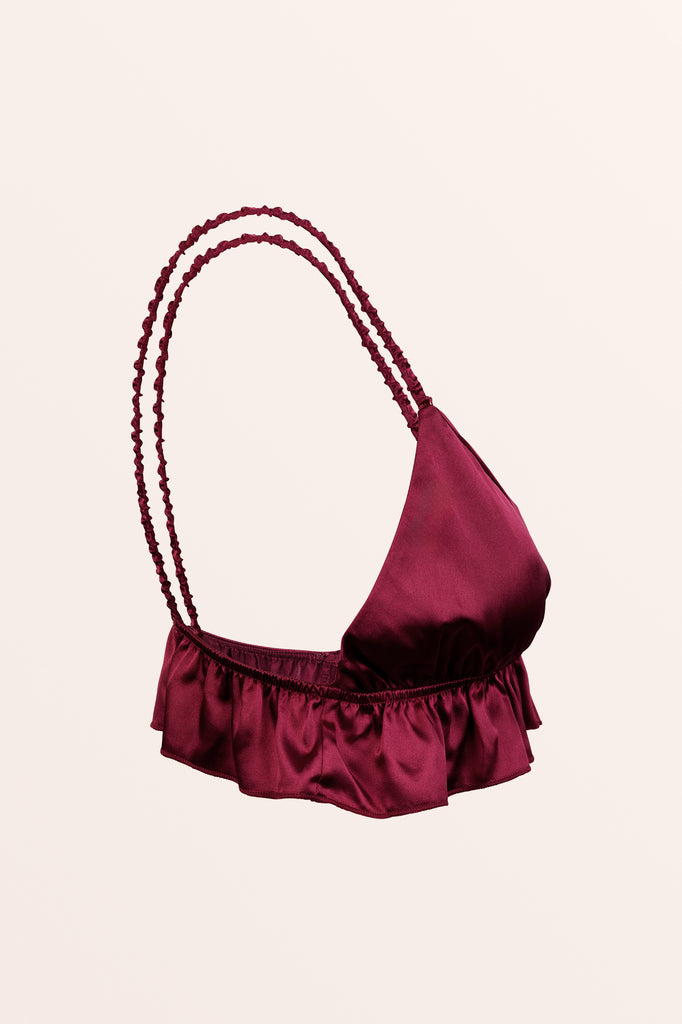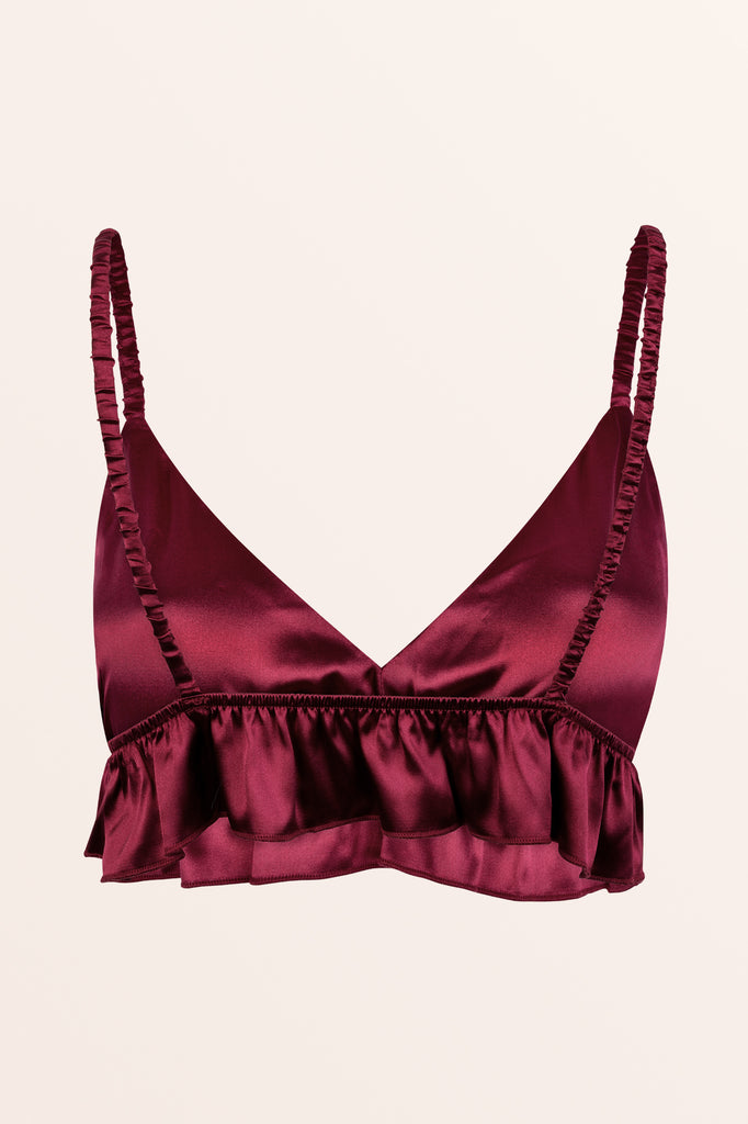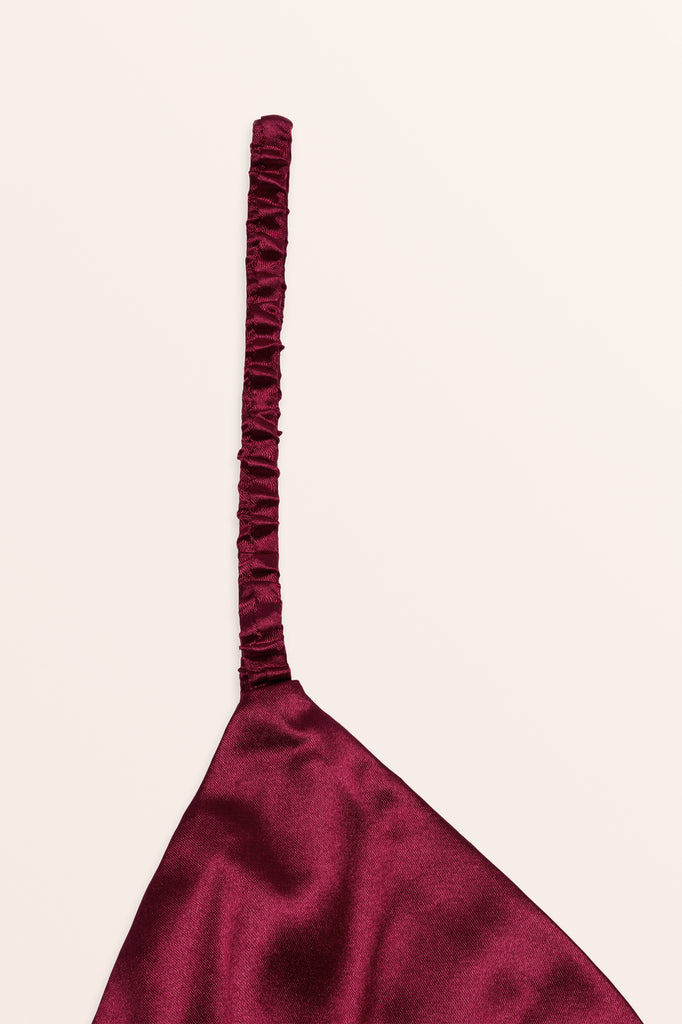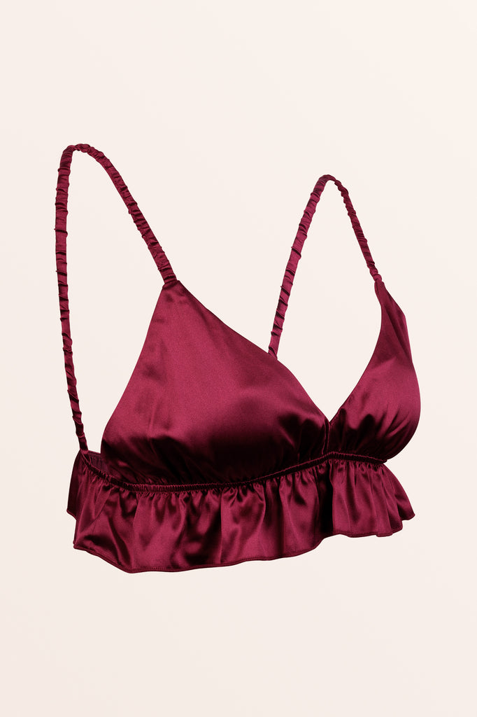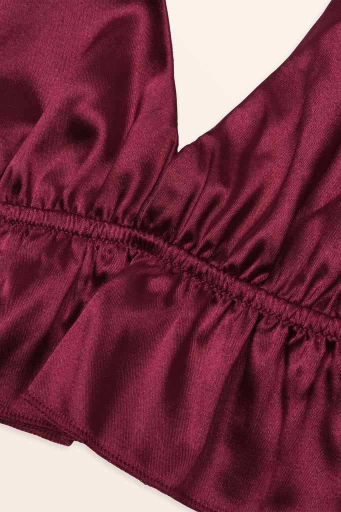 Deze bralette heeft een luxe satijnen afwerking met elastische bandjes en een zoom met ruches. Het ontwerp met diepe V-hals voegt allure en verfijning toe, terwijl de elastische spaghettibandjes zorgen voor comfort en flexibiliteit zonder afbreuk te doen aan de stijl.