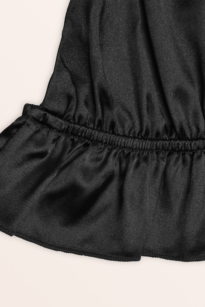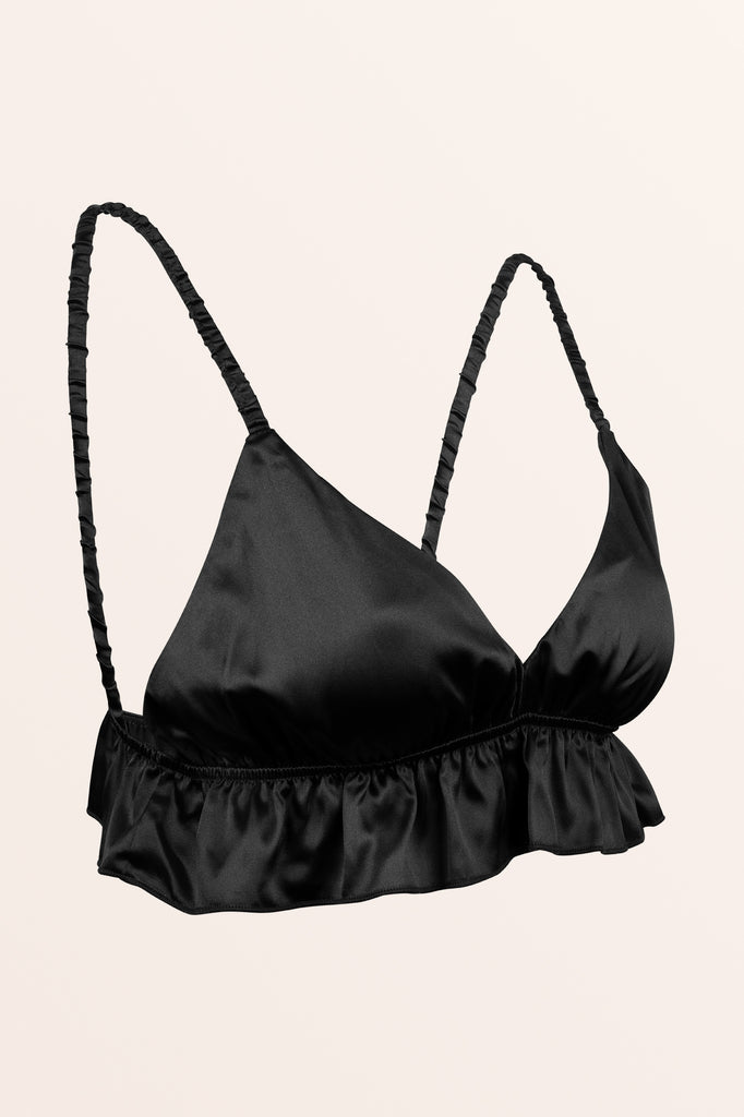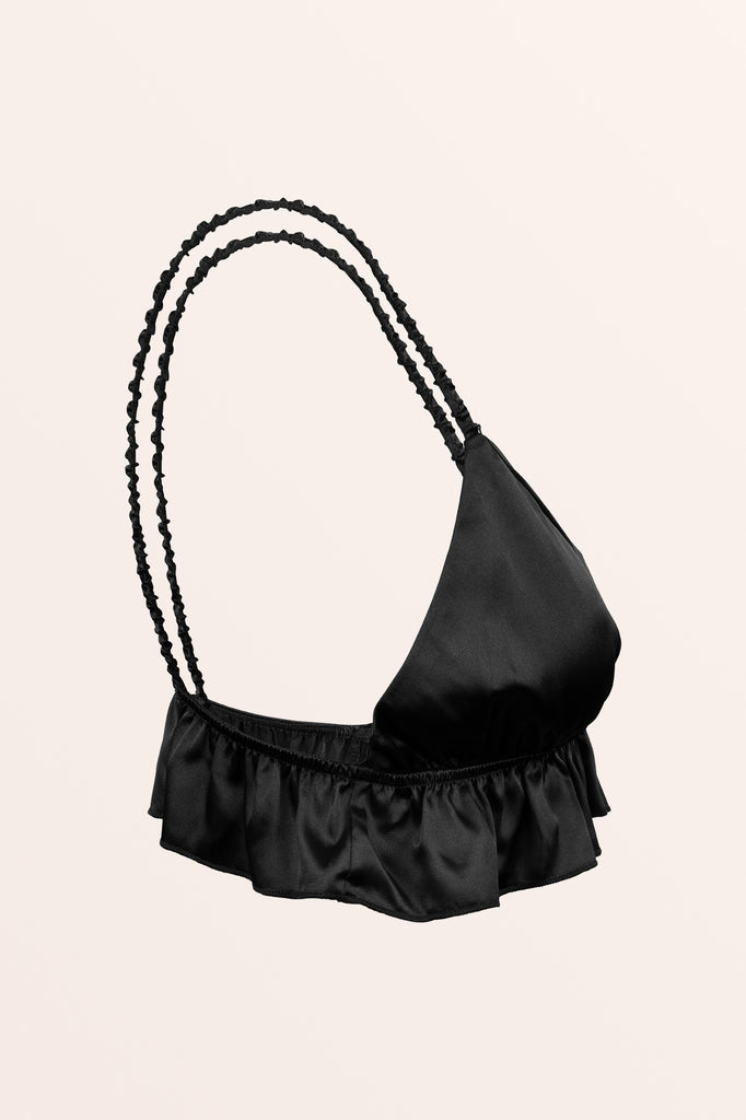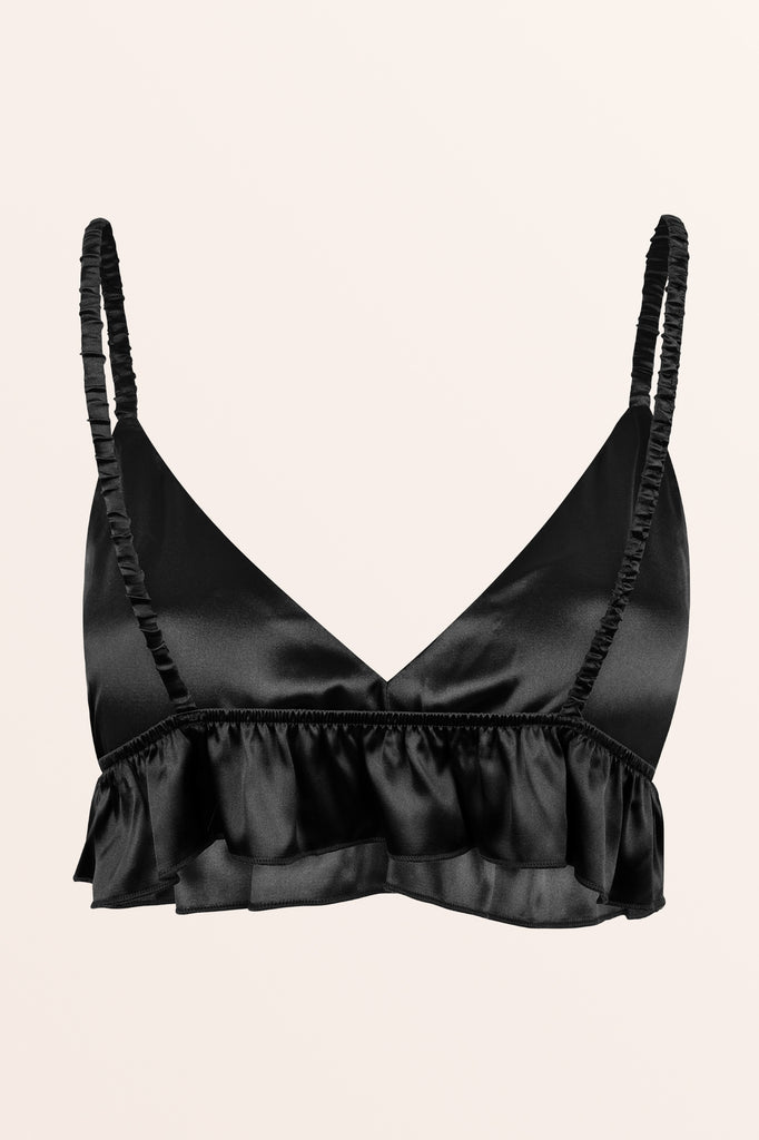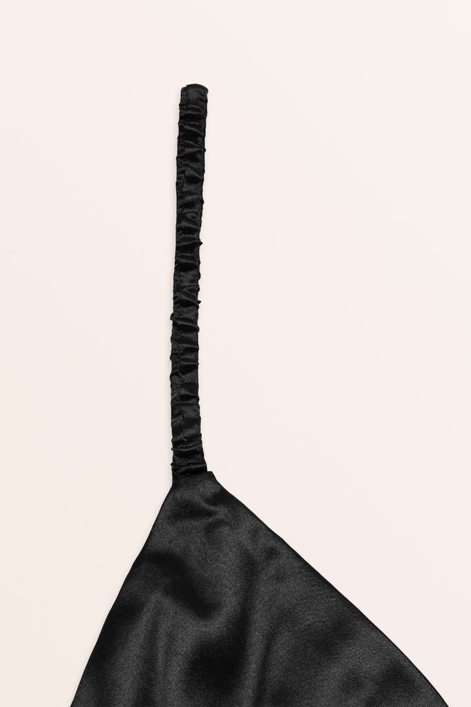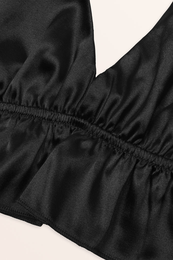 Deze bralette heeft een luxueuze satijnen afwerking met elastische bandjes en een zoom met ruches. Het ontwerp met diepe V-hals voegt allure en verfijning toe, terwijl de elastische spaghettibandjes zorgen voor comfort en flexibiliteit zonder afbreuk te doen aan de stijl.