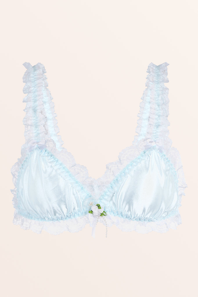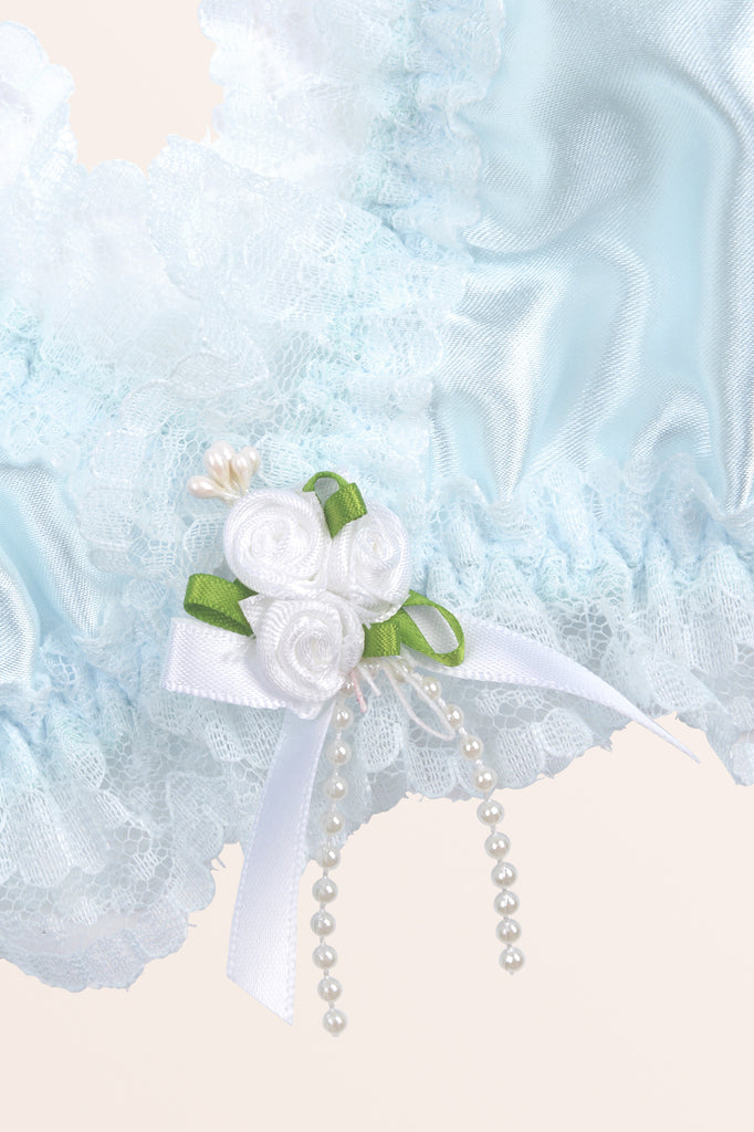 Omarm je vrouwelijkheid in deze prachtige bralette. Gemaakt van delicate satijnen stof en elastische bandjes voor comfort de hele dag door, met een drietal romantische rozen en een reeks nepparels genesteld in het decolleté, allemaal geaccentueerd met sierlijke schouderstrikken en een ruchesrand. Geniet van de elegantie.