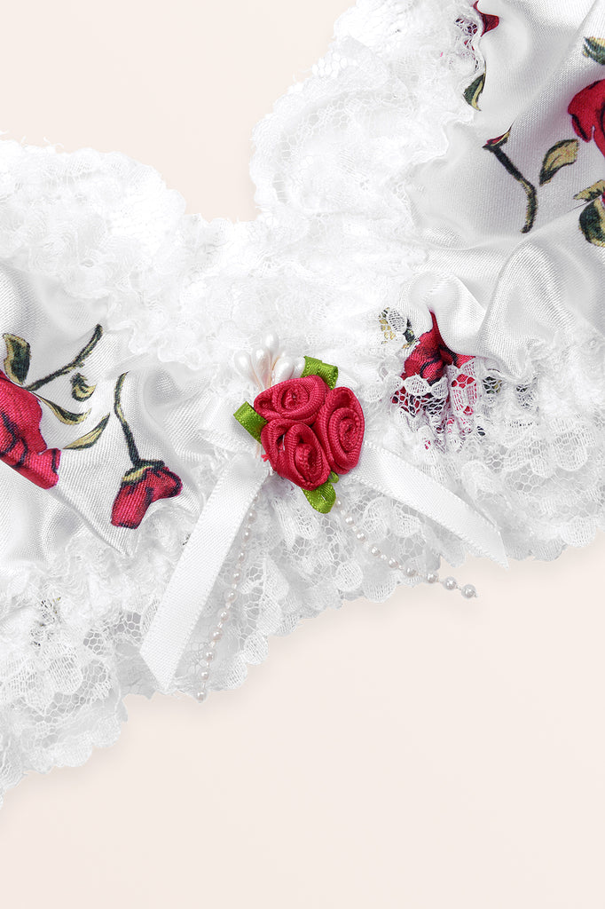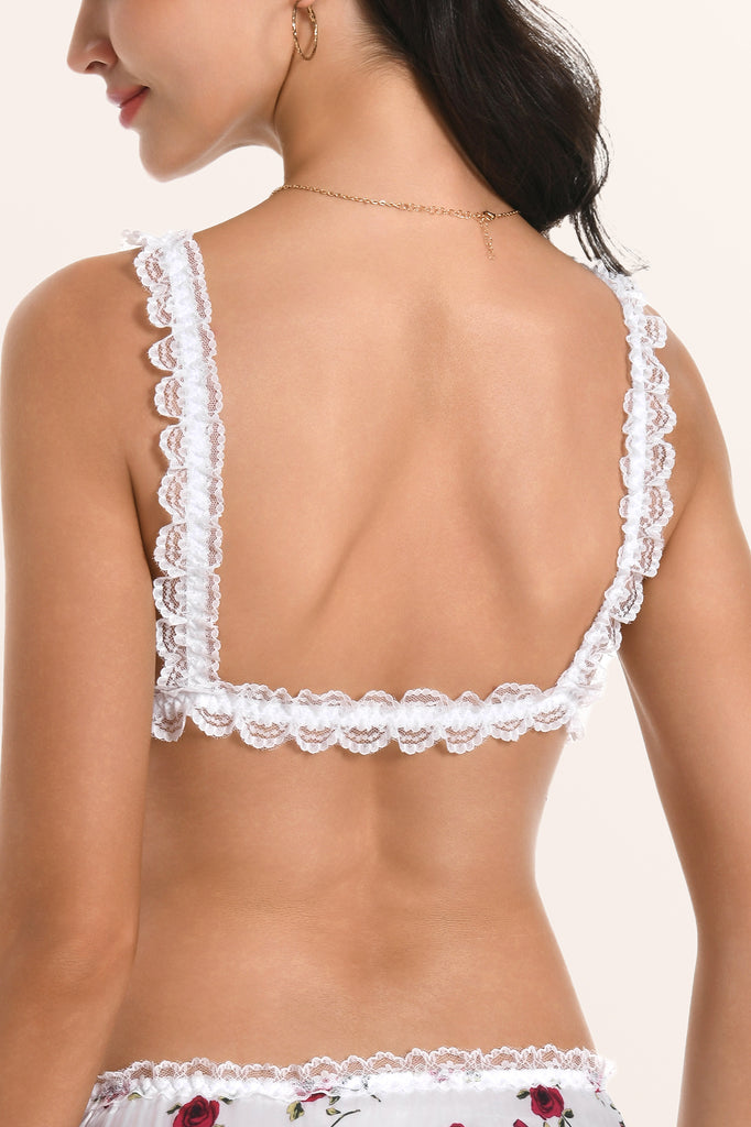 Omarm je vrouwelijkheid in deze prachtige bralette. Gemaakt van delicate satijnen stof en elastische bandjes voor comfort de hele dag door, met een drietal romantische rozen en een reeks nepparels genesteld in het decolleté, allemaal geaccentueerd met sierlijke schouderstrikken en een ruchesrand. Geniet van de elegantie.