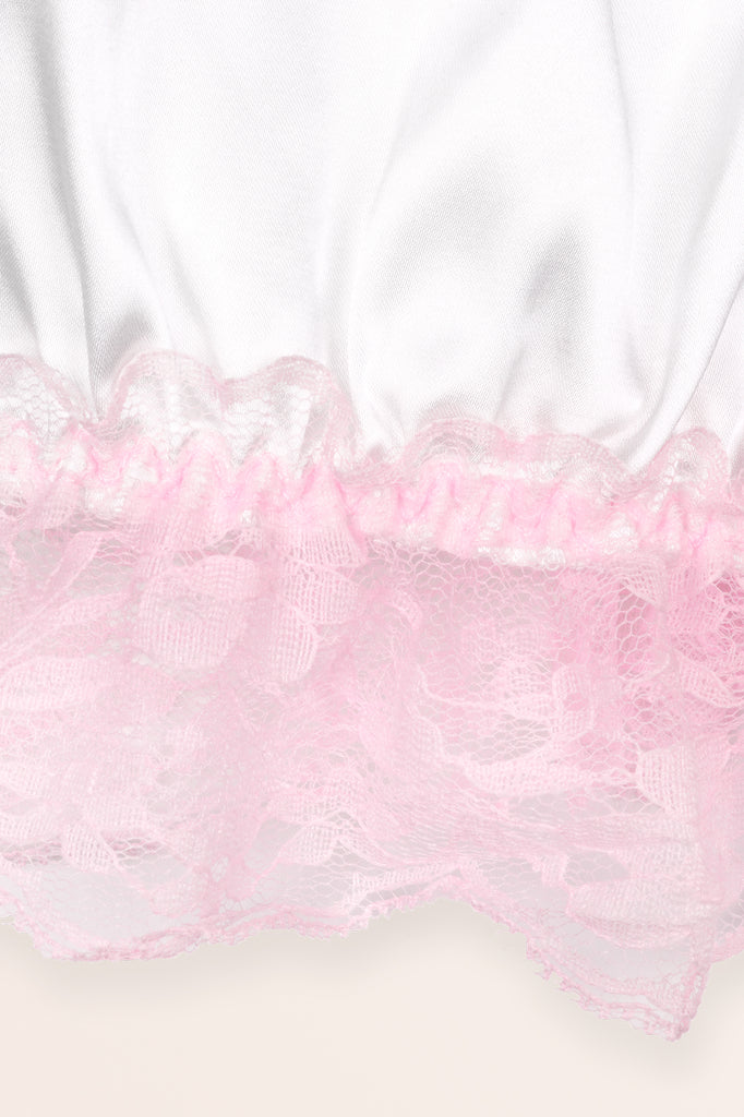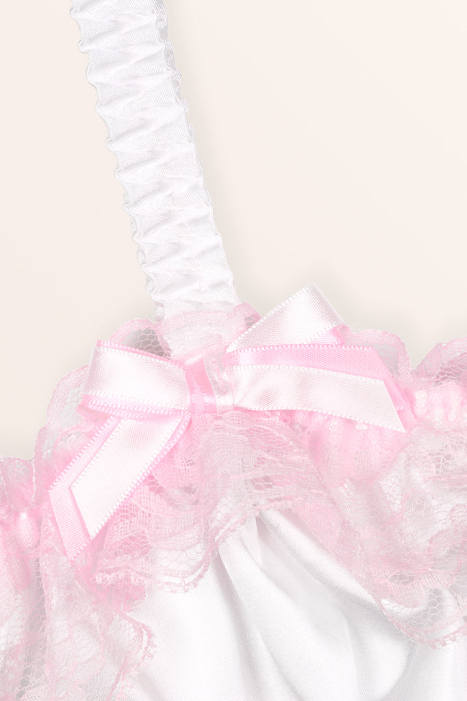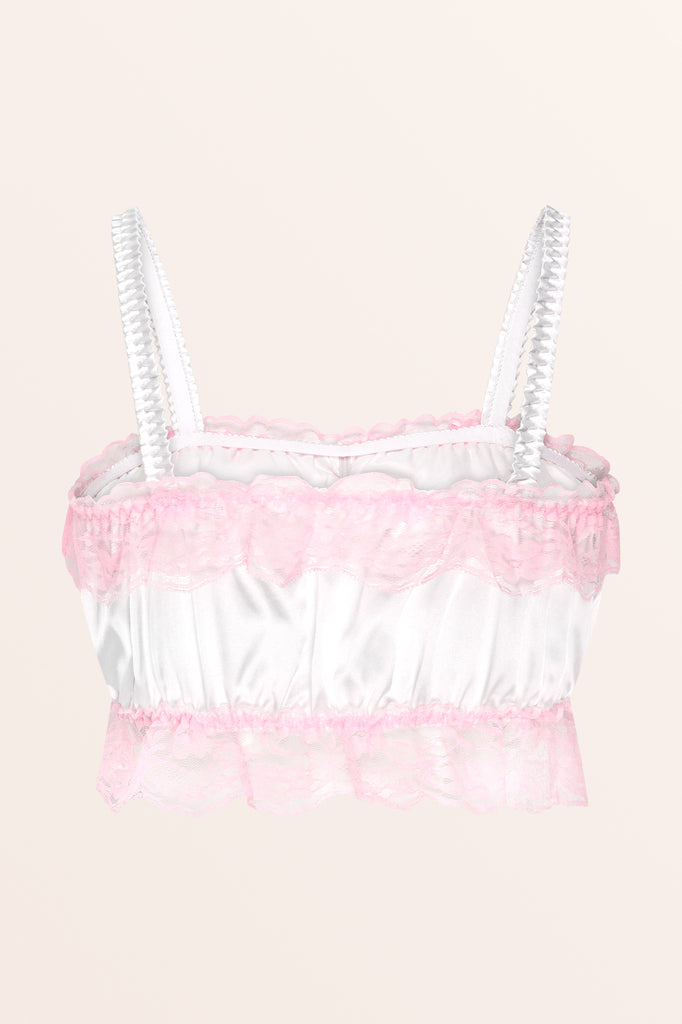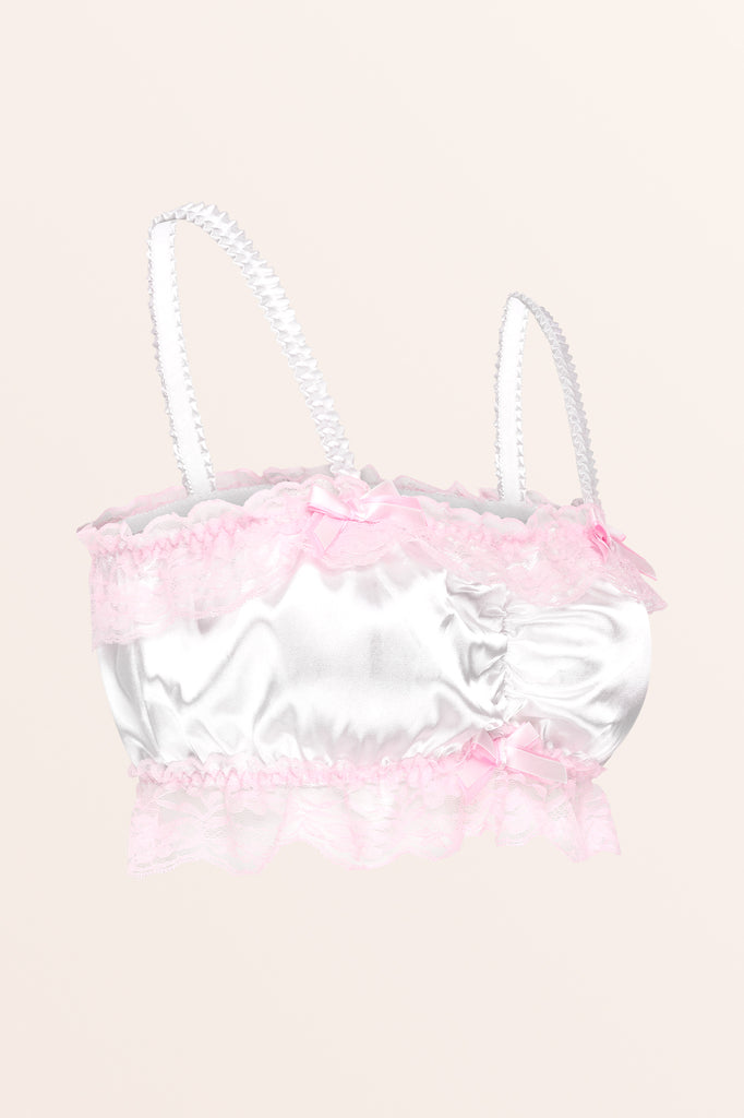 Maak je klaar om je chique en flirterig te voelen in deze bralette! Onze delicate satijnen stof, kanten rand met ruches en draadloze spaghettibandjes zorgen voor een luxe en comfortabele pasvorm. De satijnen afwerking en het elegante kant voegen een vleugje vrouwelijkheid toe aan je outfit. Deze bralette is de perfecte combinatie van comfort en stijl.