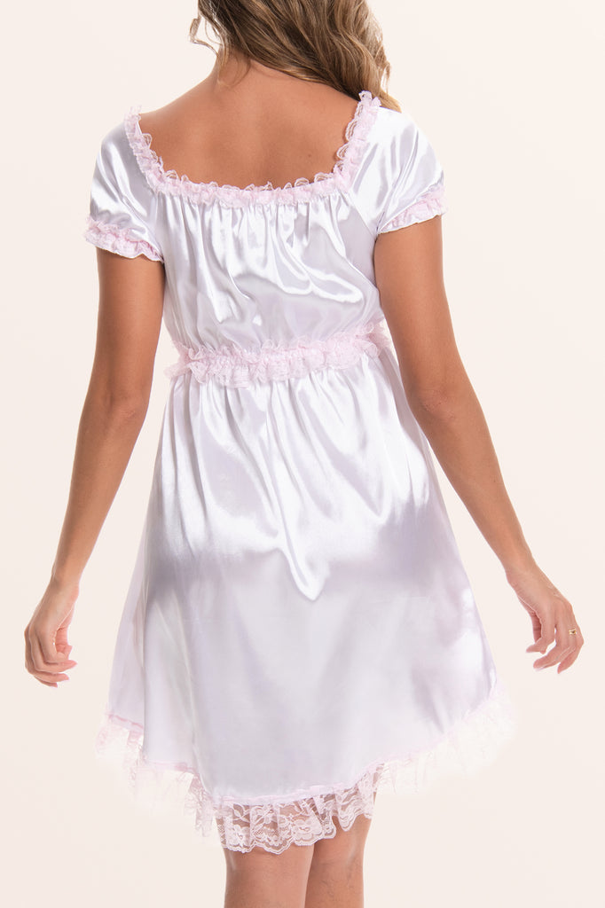 Den här nattklänningen kombinerar lyxigt satintyg med känsliga spetsaccenter, vilket skapar en sofistikerad och lockande underkläder. Dess flirtiga, feminina hembiträde-inspirerade design lägger till en lekfull och romantisk atmosfär till din nattrutin. Elastiska detaljer vid halsringning, armöppningar och midjeband säkerställer en bekväm, anpassningsbar passform som anpassar sig efter din kroppsform. Tillverkad av lättviktsmaterial, denna nattklänning erbjuder komfort hela natten, så att du kan koppla av och varva ner med stil.